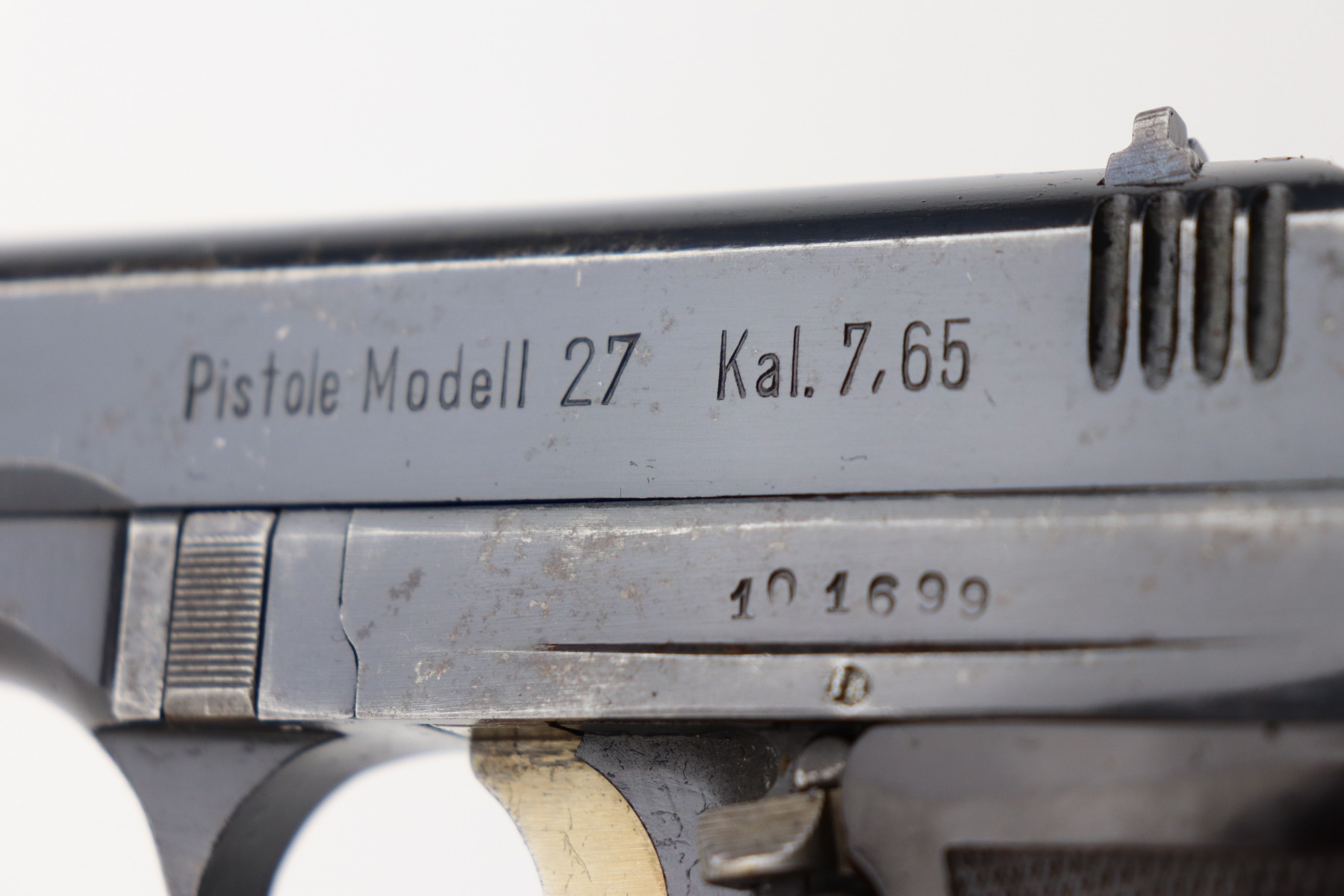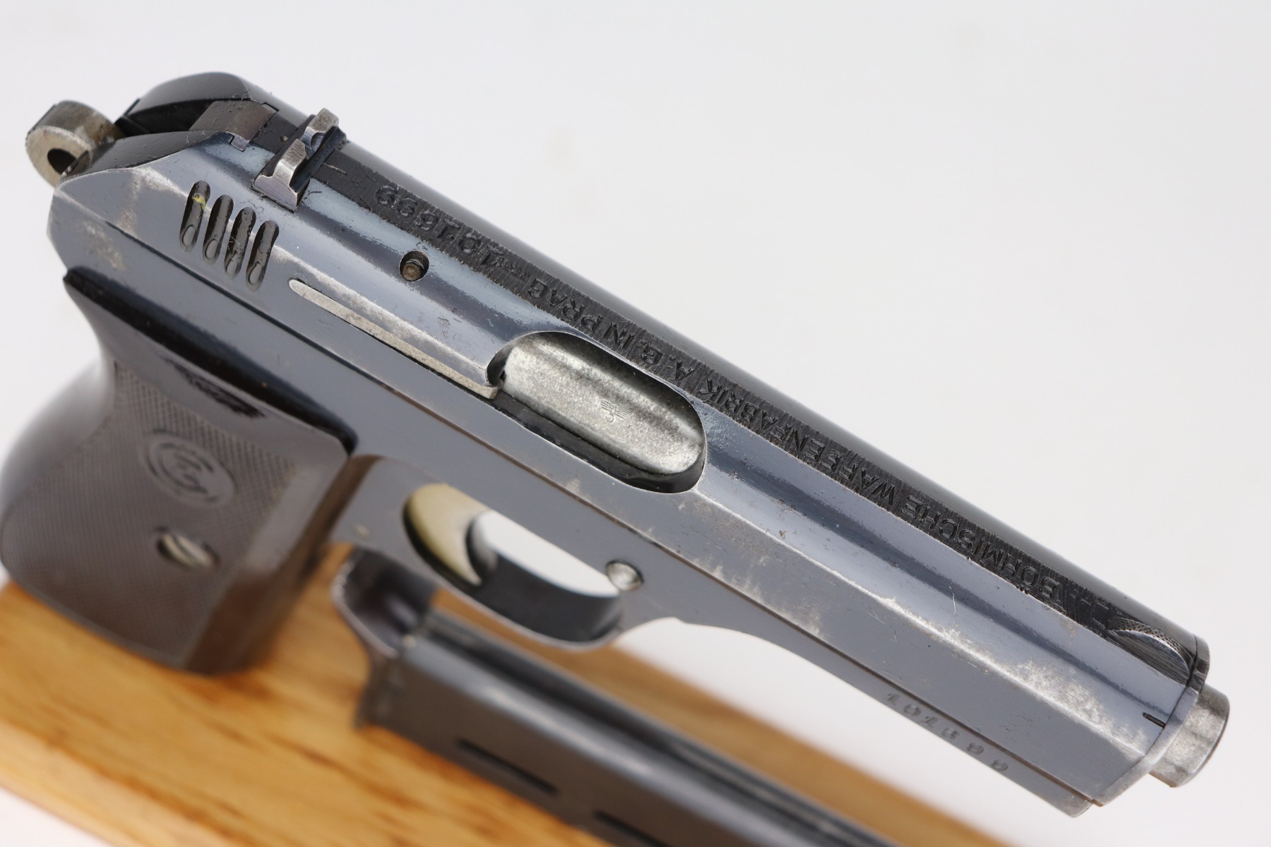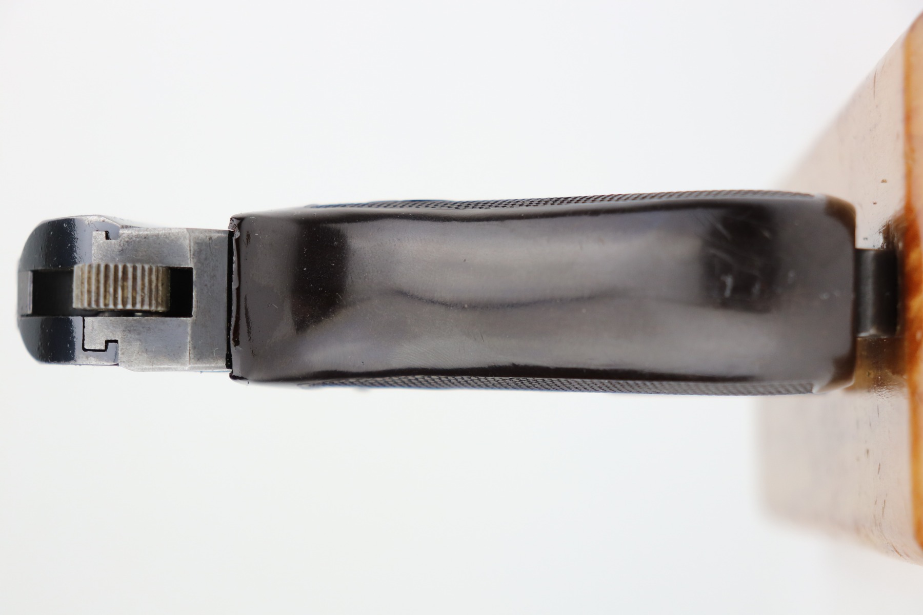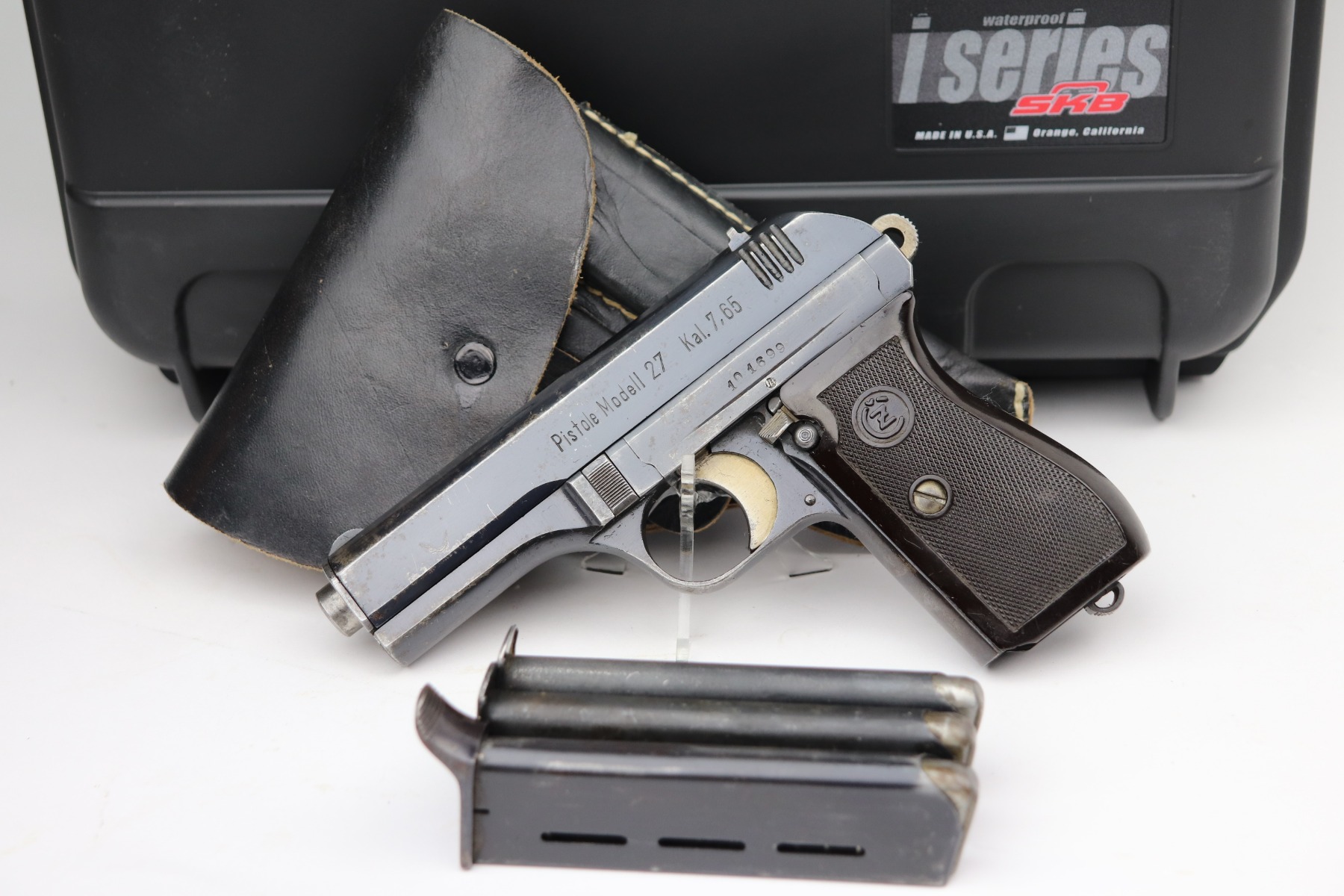 4/27/21 – This is a very nice example of a CZ 27 rig issued to the Nazi military during WW2. It is all matching and has the proper “Waffen 76” military proof. The gun comes with a nice holster, two period-correct magazines, a period-correct magazine with a Beretta finger extension, a spare post-war grip, a set of spare springs, and a very nice Pelican-style hard case. The gun has retained roughly 75-80% of its original high polish bluing. There is spotty wear and oxidation throughout, concentrated on the front strap, underside of the trigger guard, and the high edges of the slide. Comes with a nice grip that is chipped in the bottom corners. Mint bore.