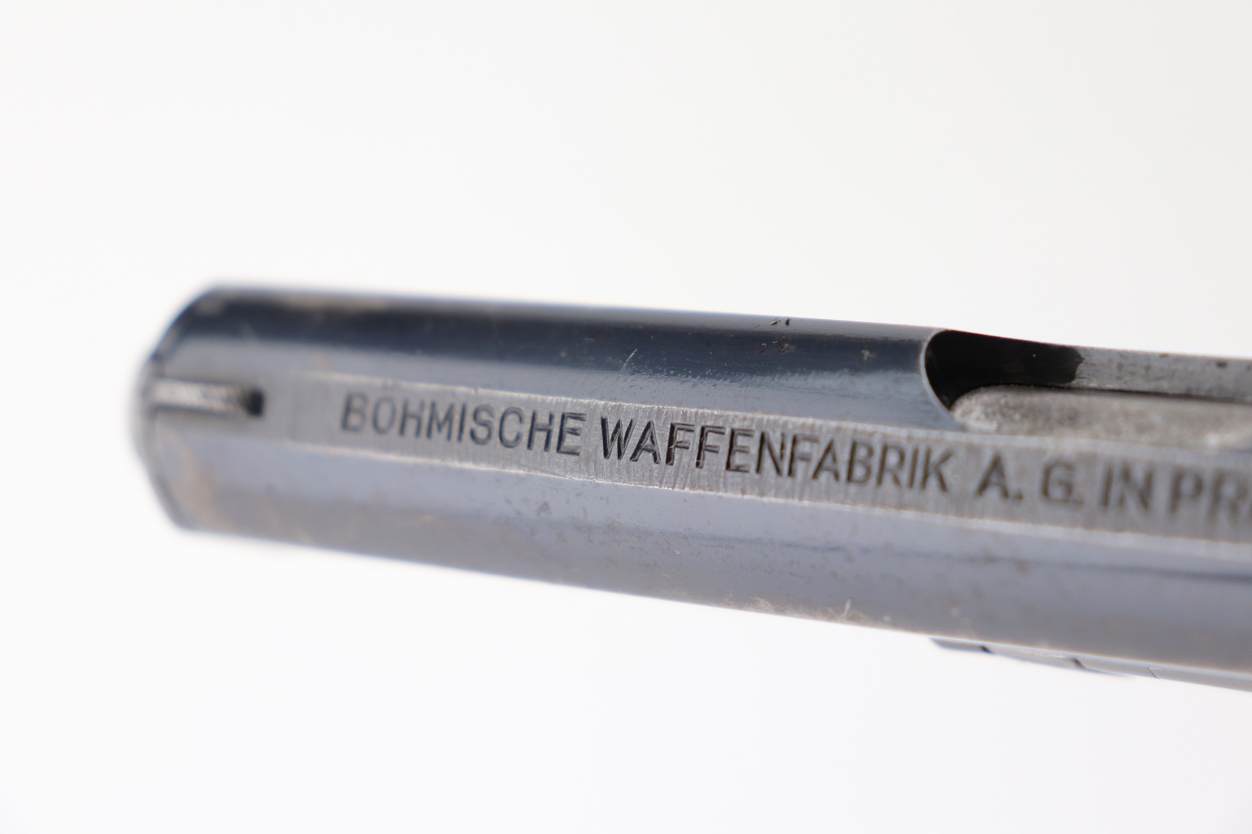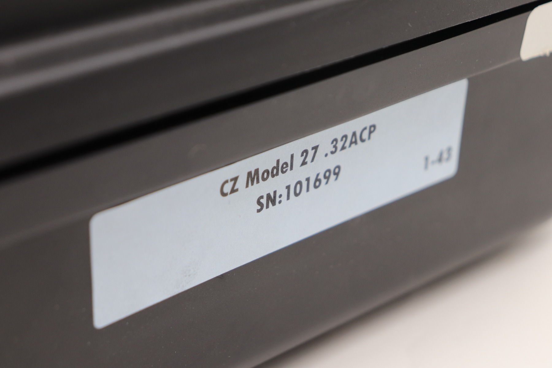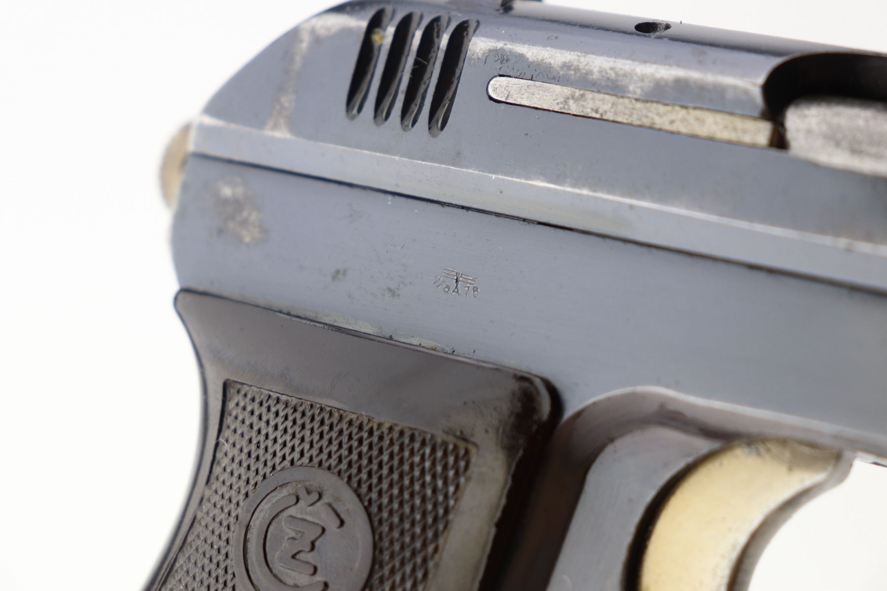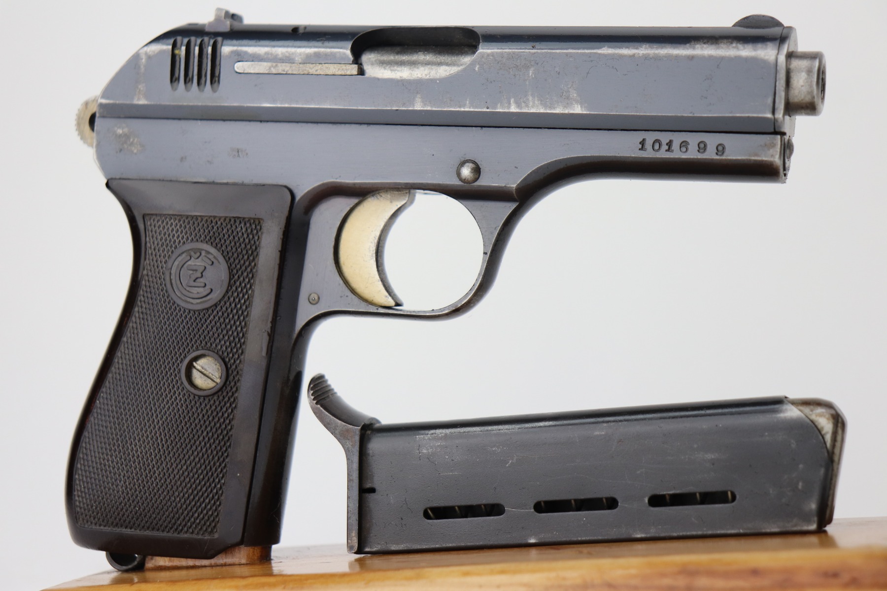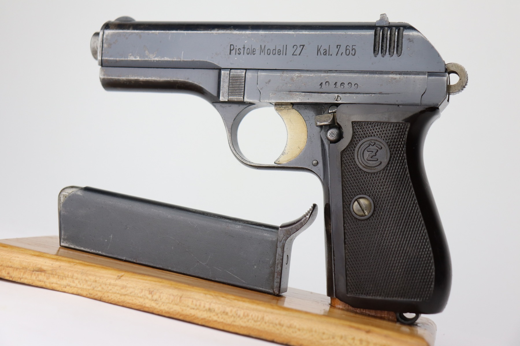 4/27/21 – This is a very nice example of a CZ 27 rig issued to the Nazi military during WW2. It is all matching and has the proper “Waffen 76” military proof. The gun comes with a nice holster, two period-correct magazines, a period-correct magazine with a Beretta finger extension, a spare post-war grip, a set of spare springs, and a very nice Pelican-style hard case. The gun has retained roughly 75-80% of its original high polish bluing. There is spotty wear and oxidation throughout, concentrated on the front strap, underside of the trigger guard, and the high edges of the slide. Comes with a nice grip that is chipped in the bottom corners. Mint bore.