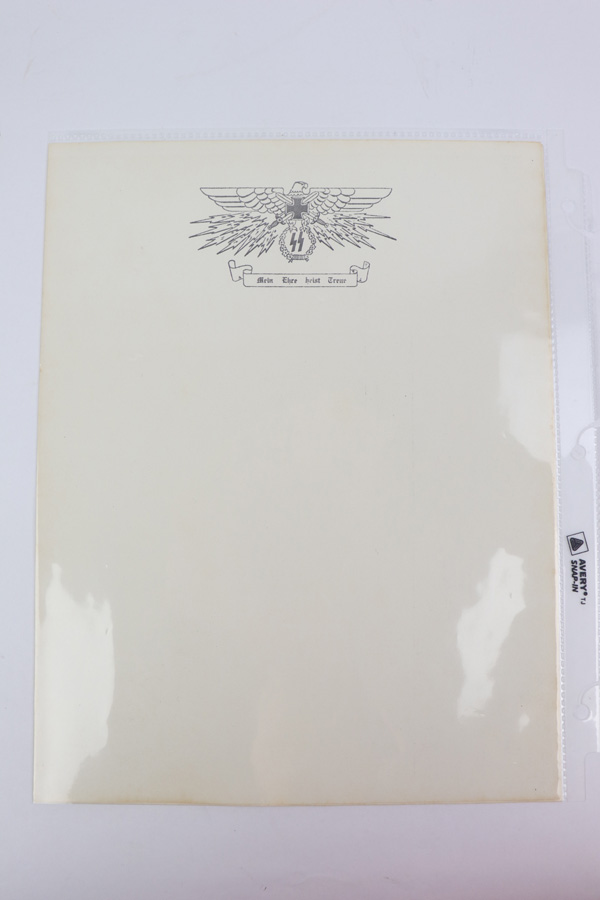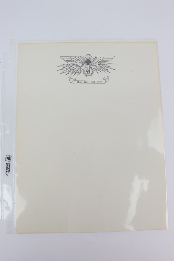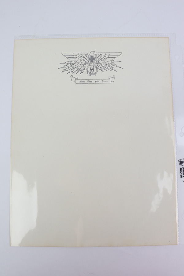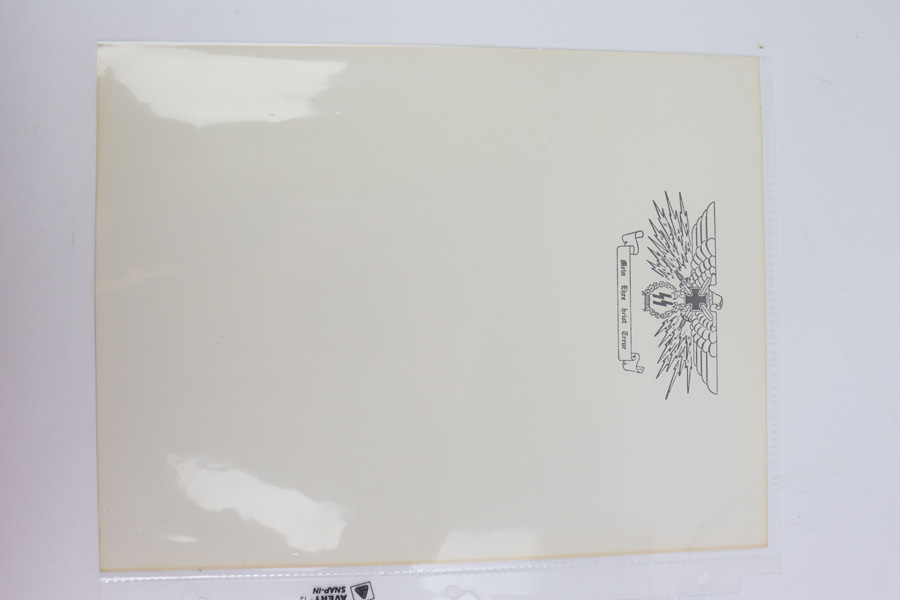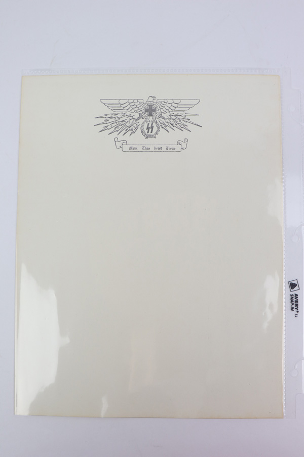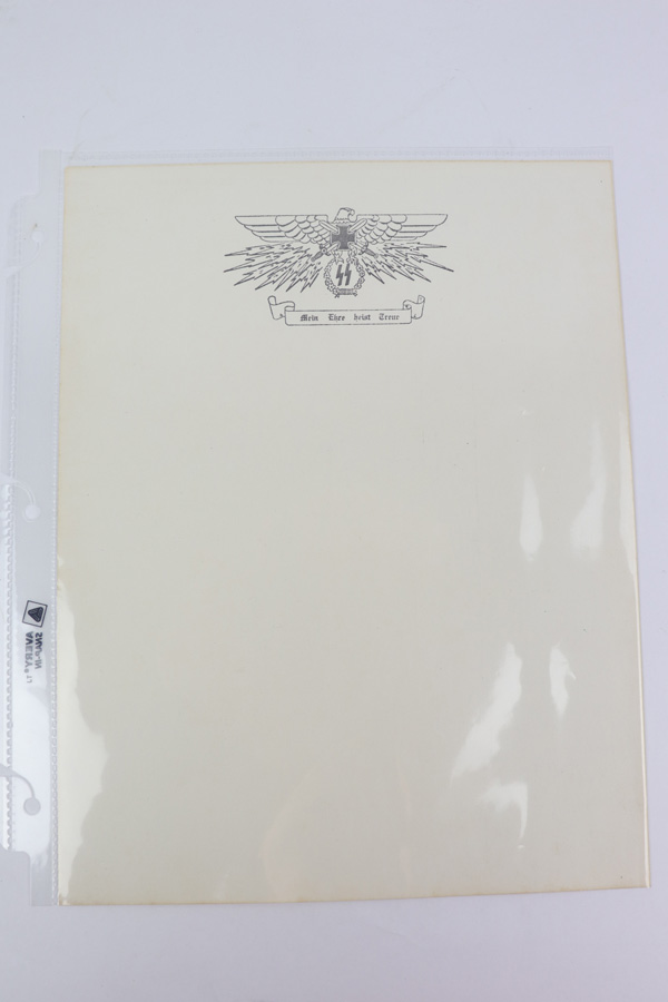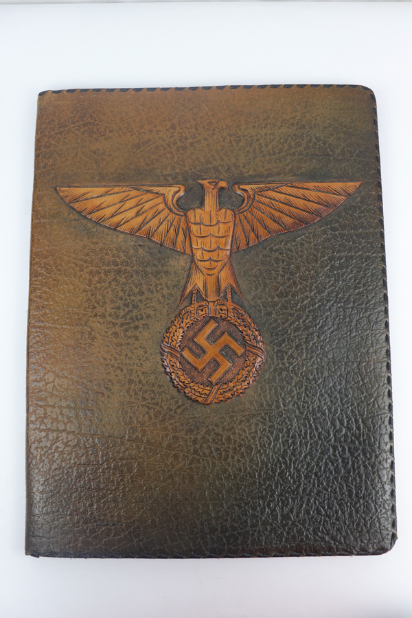 4/12/19 – This is a fairly scarce and collectible WW2 nazi German folio document holder. Also included are some original and period correct paper with nazi and SS letterhead. (8 total pages of SS letterhead, 1 page with nazi swastika letterhead – all excellent). The folio has a soft leather exterior with stretched leather strung binding. The cover of the folio has a lighter tan brown eagle nazi logo which is raised and excellent with a lot of detail. There’s some signs of aging on the leather exterior, and two or three of of the bindings are loose or undone – but the vast majority of the leather binding is excellent and in tact. The interior of the folio is excellent as well – nearly mint condition with expandable pockets – see photos!