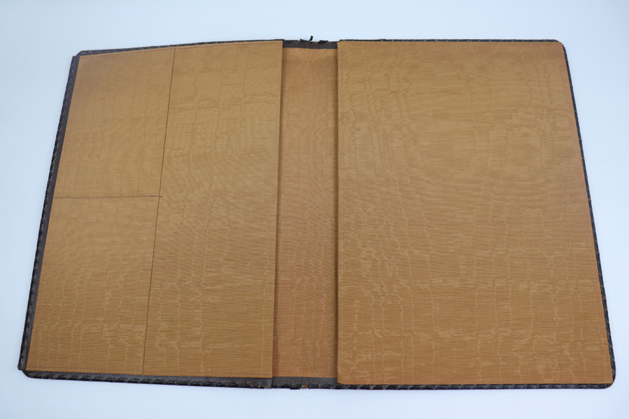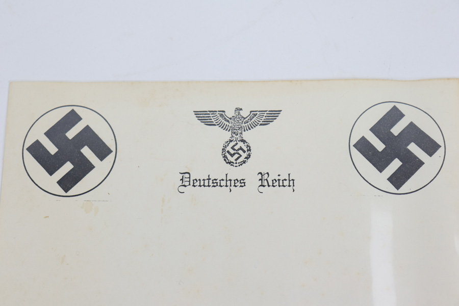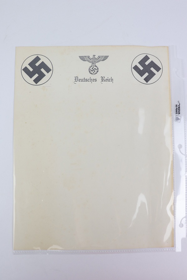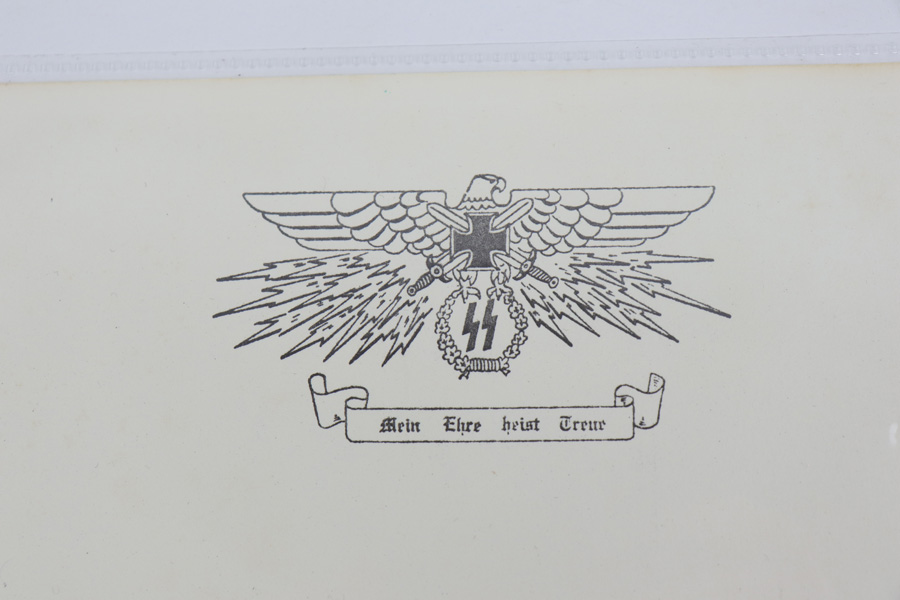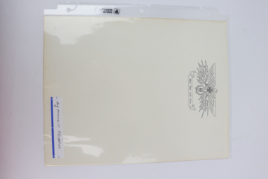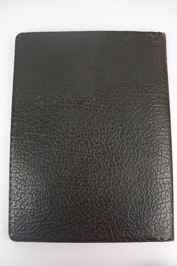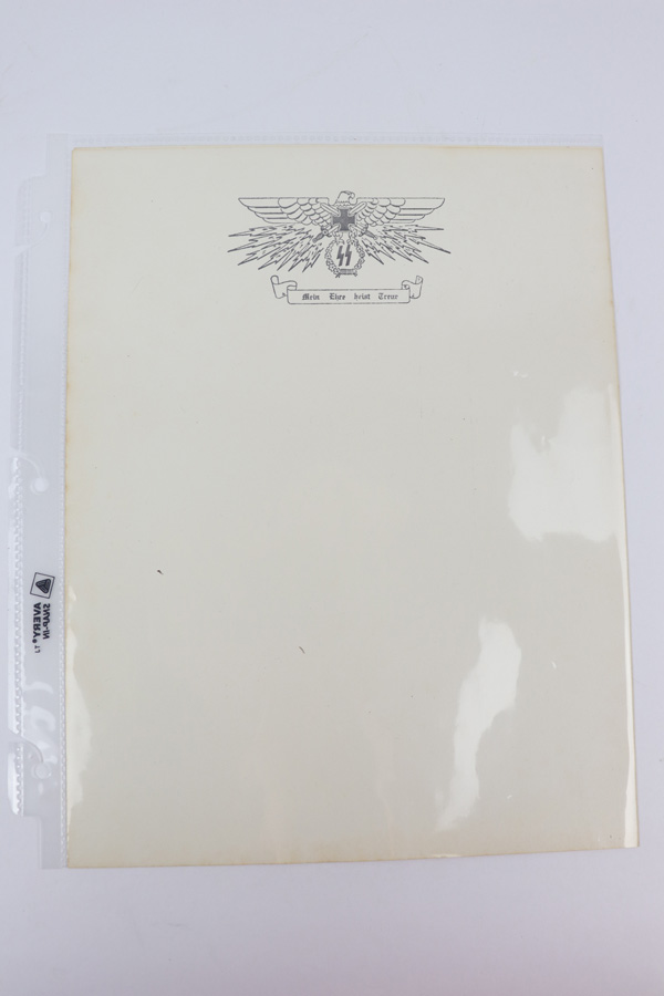 4/12/19 – This is a fairly scarce and collectible WW2 nazi German folio document holder. Also included are some original and period correct paper with nazi and SS letterhead. (8 total pages of SS letterhead, 1 page with nazi swastika letterhead – all excellent). The folio has a soft leather exterior with stretched leather strung binding. The cover of the folio has a lighter tan brown eagle nazi logo which is raised and excellent with a lot of detail. There’s some signs of aging on the leather exterior, and two or three of of the bindings are loose or undone – but the vast majority of the leather binding is excellent and in tact. The interior of the folio is excellent as well – nearly mint condition with expandable pockets – see photos!
