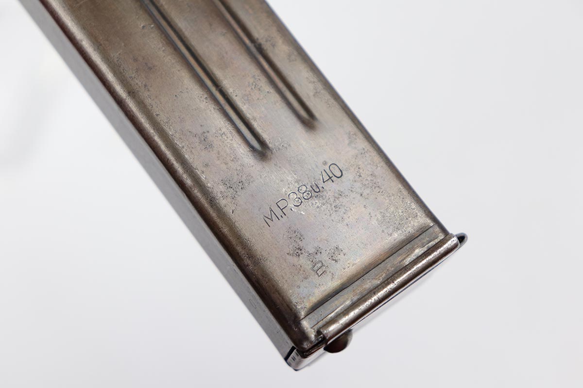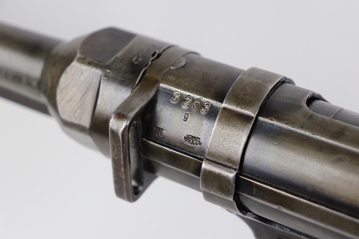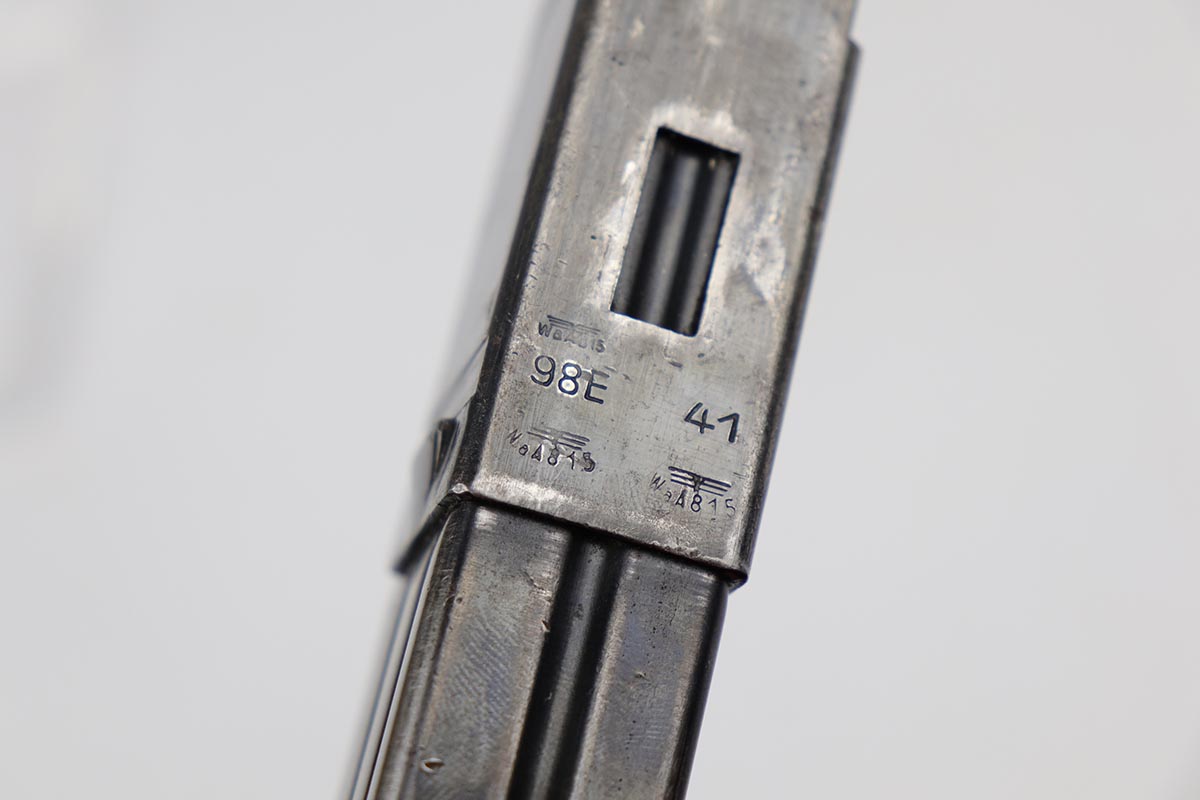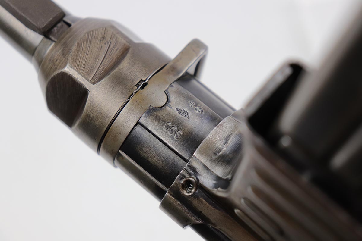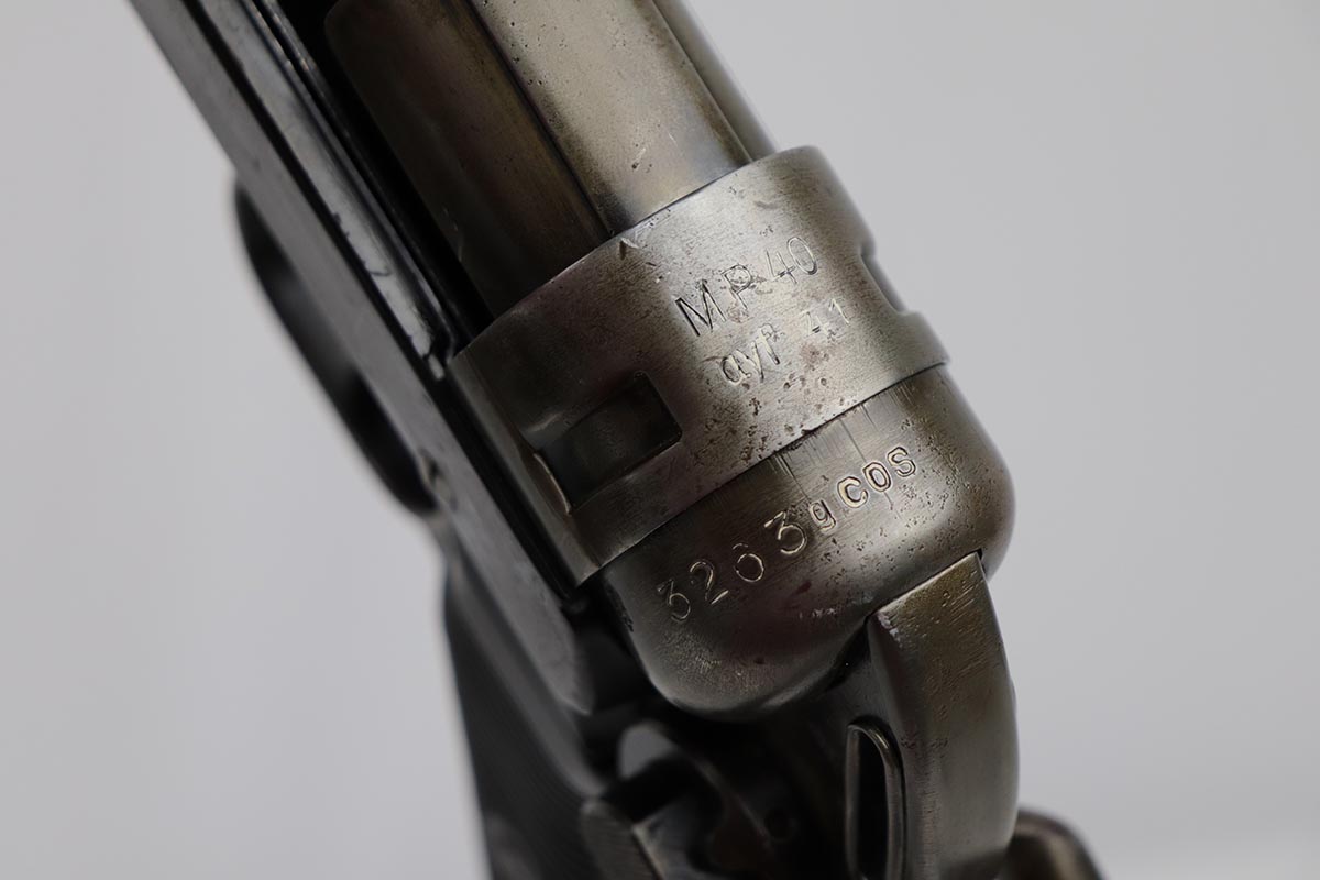 12/4/19 – This is a very nice, fully transferable MP-40 with Erma receiver and Merz Werke matching rear assembly. This is an all matching and correct sub-machine gun, as these were often comprised of parts from multiple manufacturers due to subcontracted parts. For those familiar with the MP-40 this is a classic C&R gun which is in all original configuration. Shoulder stock employs properly and quite tight when extended. The MP-40 was the successor to the MP-38 model. Both were intended to be compact bust fire power weapons especially suited for dismounted vehicle troops but was issued in ever increasing numbers to troops of all kinds. It is slow firing, comfortable to shoot, durable, with readily available parts. The original bluing rates at around 30-50% with uniform thinning and patination of the metal parts, but no corrosion or defect. Receiver is dated to 1941 with ‘ayf’ maker code, referencing Erma. Rear assembly is ‘cos’ marked for Merz Werke. Fantastic bore. This weapon is fully transferable on ATF form 3 or form 4 as C&R eligible.