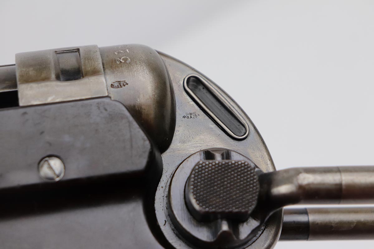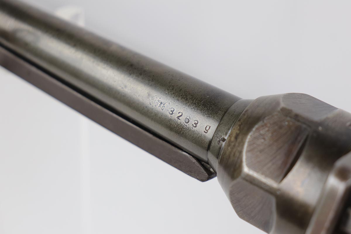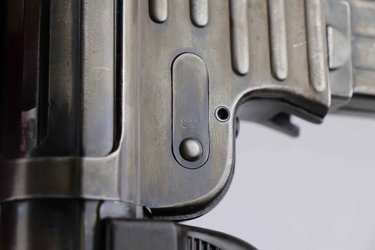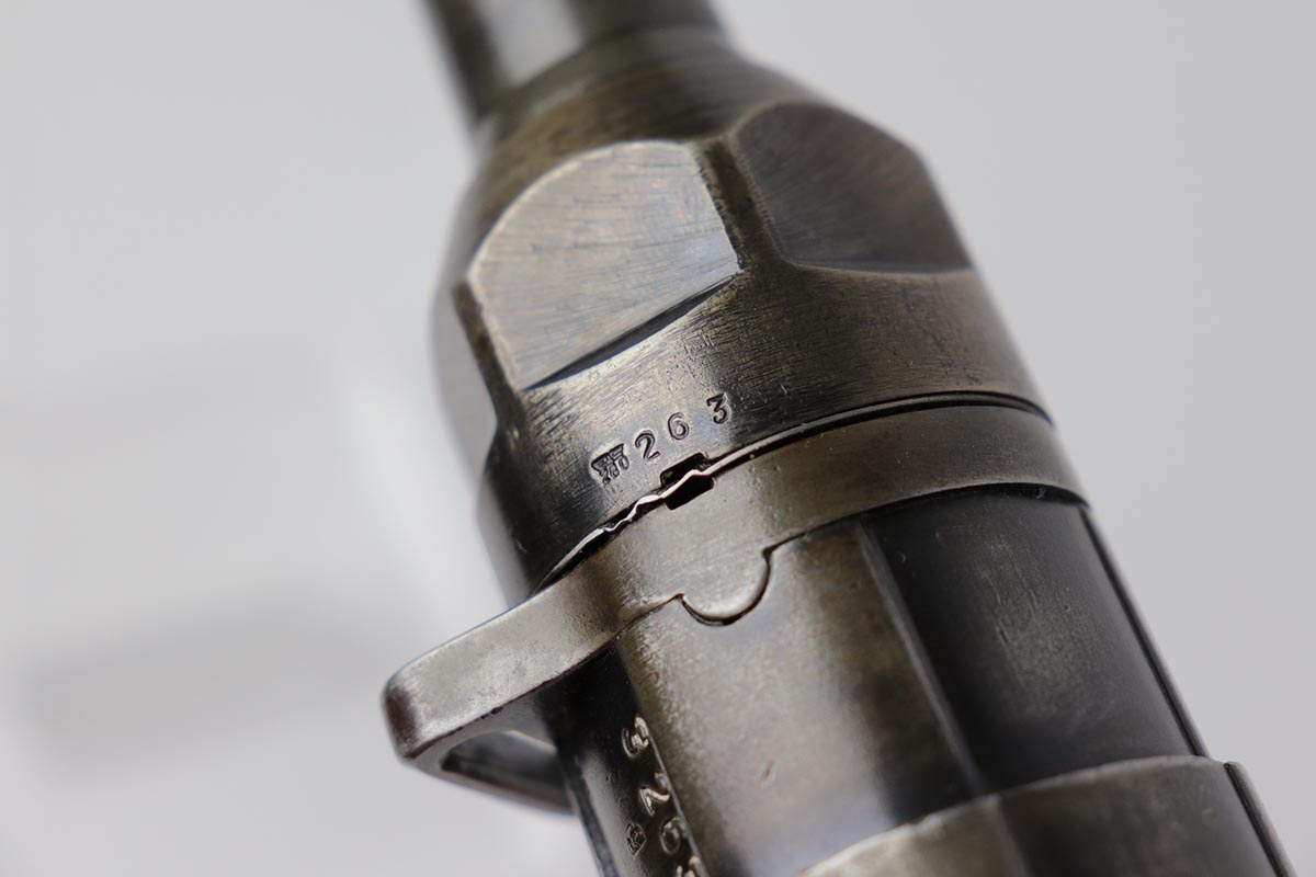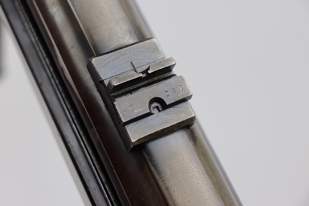 12/4/19 – This is a very nice, fully transferable MP-40 with Erma receiver and Merz Werke matching rear assembly. This is an all matching and correct sub-machine gun, as these were often comprised of parts from multiple manufacturers due to subcontracted parts. For those familiar with the MP-40 this is a classic C&R gun which is in all original configuration. Shoulder stock employs properly and quite tight when extended. The MP-40 was the successor to the MP-38 model. Both were intended to be compact bust fire power weapons especially suited for dismounted vehicle troops but was issued in ever increasing numbers to troops of all kinds. It is slow firing, comfortable to shoot, durable, with readily available parts. The original bluing rates at around 30-50% with uniform thinning and patination of the metal parts, but no corrosion or defect. Receiver is dated to 1941 with ‘ayf’ maker code, referencing Erma. Rear assembly is ‘cos’ marked for Merz Werke. Fantastic bore. This weapon is fully transferable on ATF form 3 or form 4 as C&R eligible.