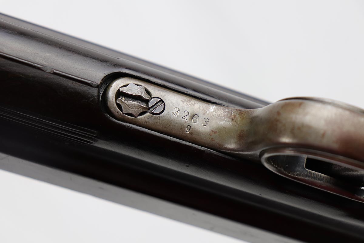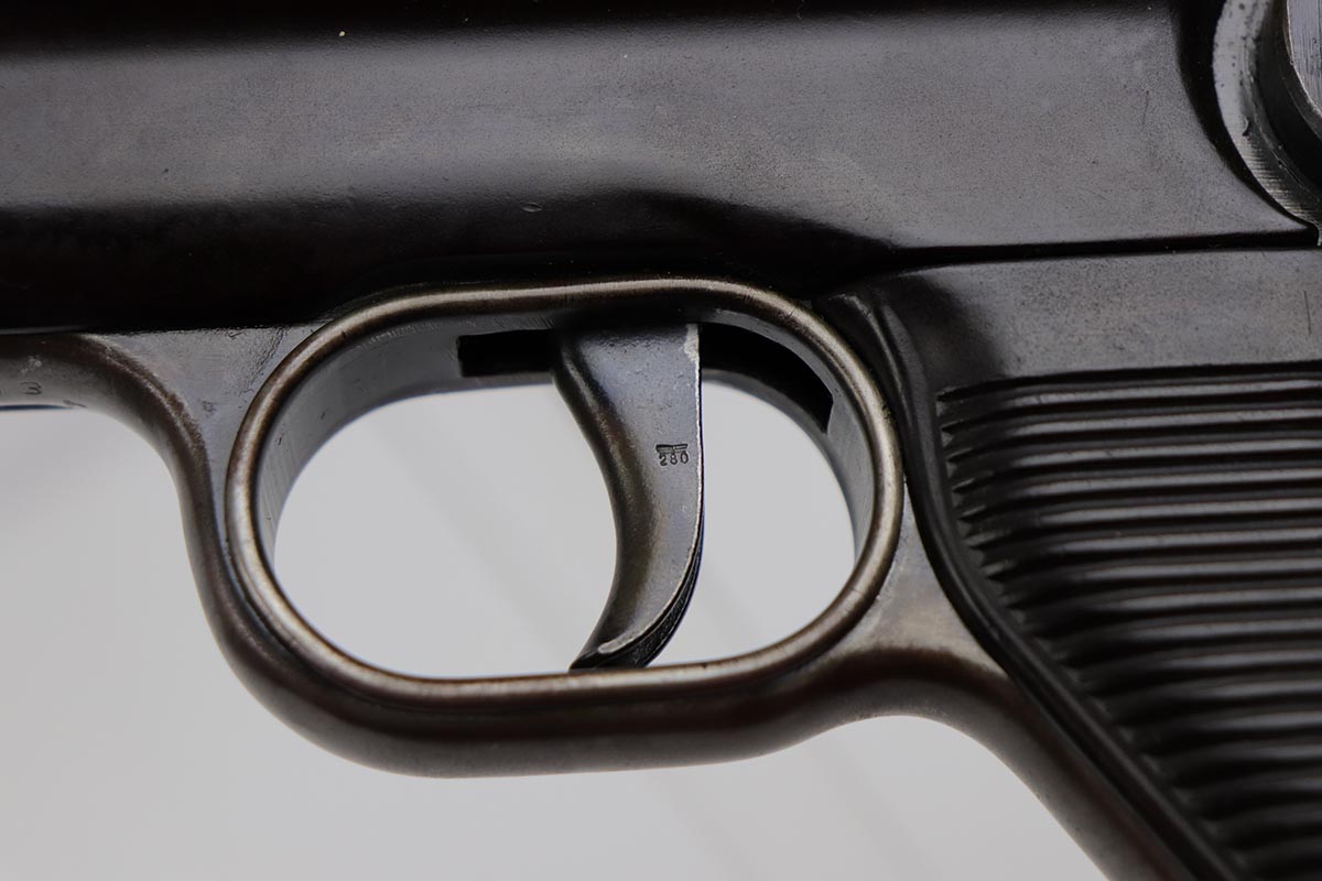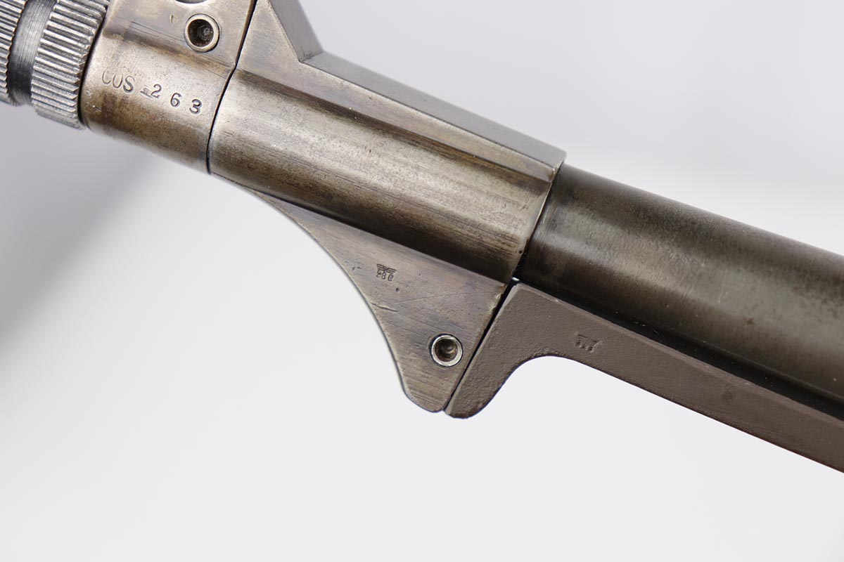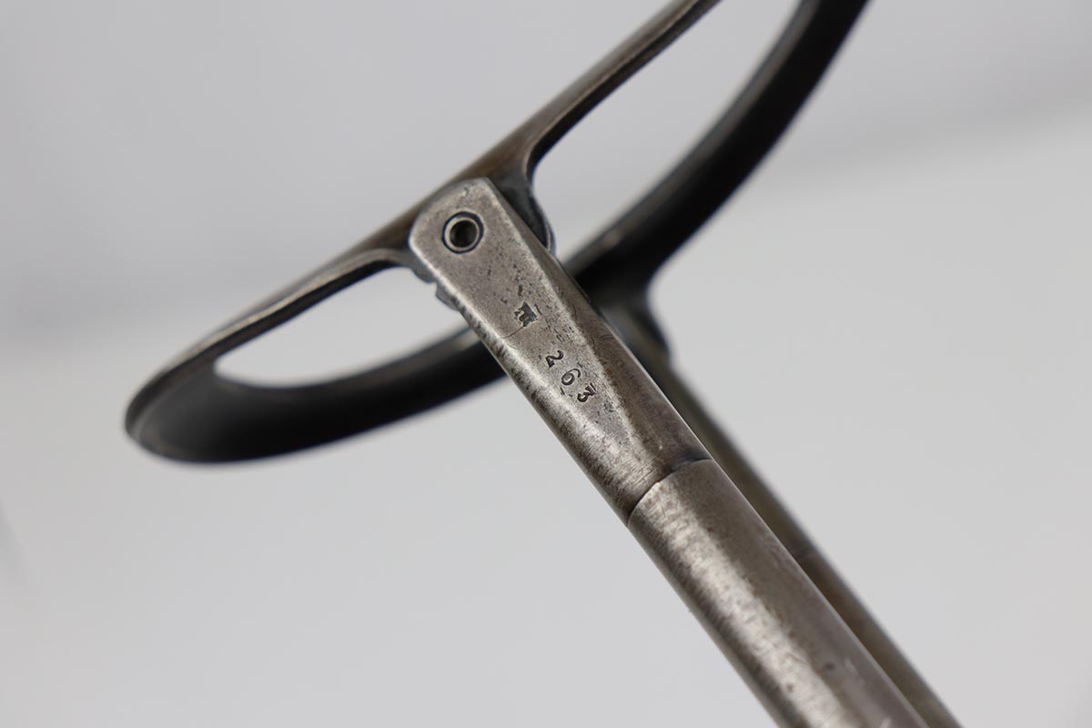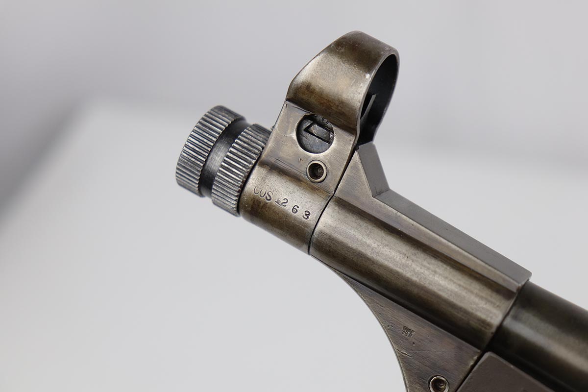 12/4/19 – This is a very nice, fully transferable MP-40 with Erma receiver and Merz Werke matching rear assembly. This is an all matching and correct sub-machine gun, as these were often comprised of parts from multiple manufacturers due to subcontracted parts. For those familiar with the MP-40 this is a classic C&R gun which is in all original configuration. Shoulder stock employs properly and quite tight when extended. The MP-40 was the successor to the MP-38 model. Both were intended to be compact bust fire power weapons especially suited for dismounted vehicle troops but was issued in ever increasing numbers to troops of all kinds. It is slow firing, comfortable to shoot, durable, with readily available parts. The original bluing rates at around 30-50% with uniform thinning and patination of the metal parts, but no corrosion or defect. Receiver is dated to 1941 with ‘ayf’ maker code, referencing Erma. Rear assembly is ‘cos’ marked for Merz Werke. Fantastic bore. This weapon is fully transferable on ATF form 3 or form 4 as C&R eligible.
