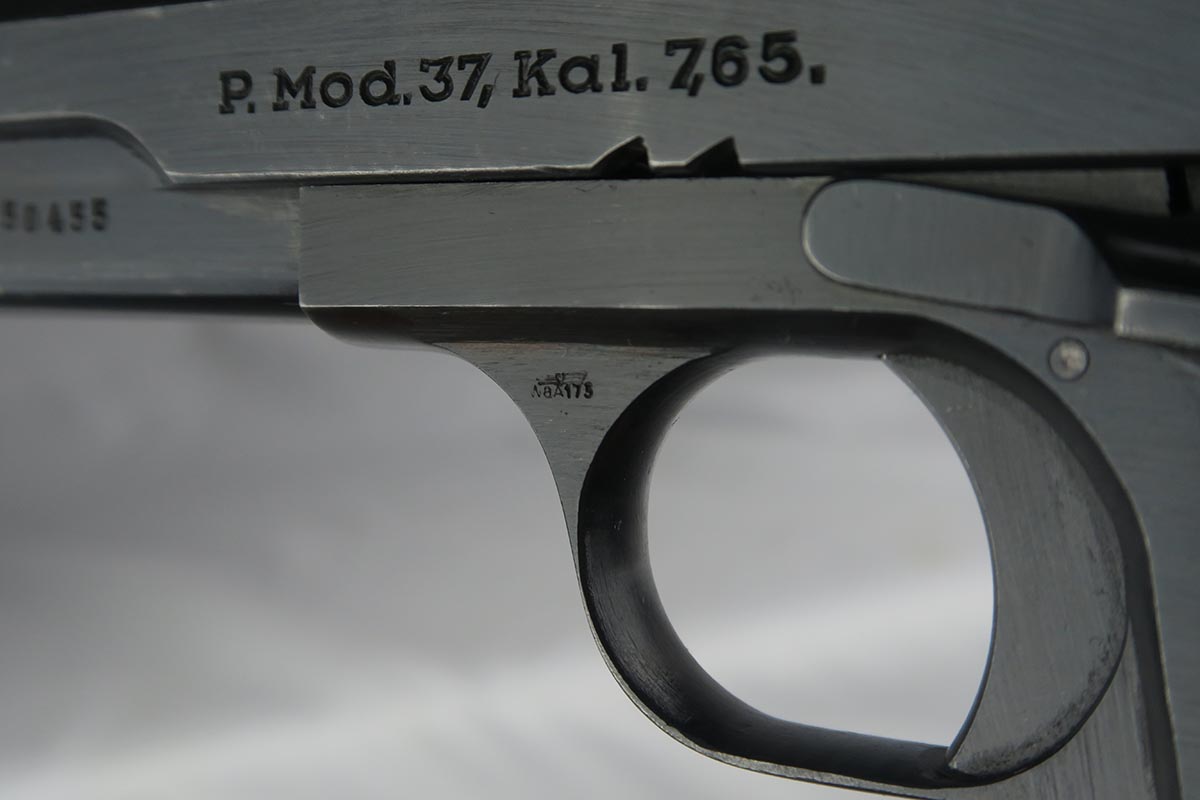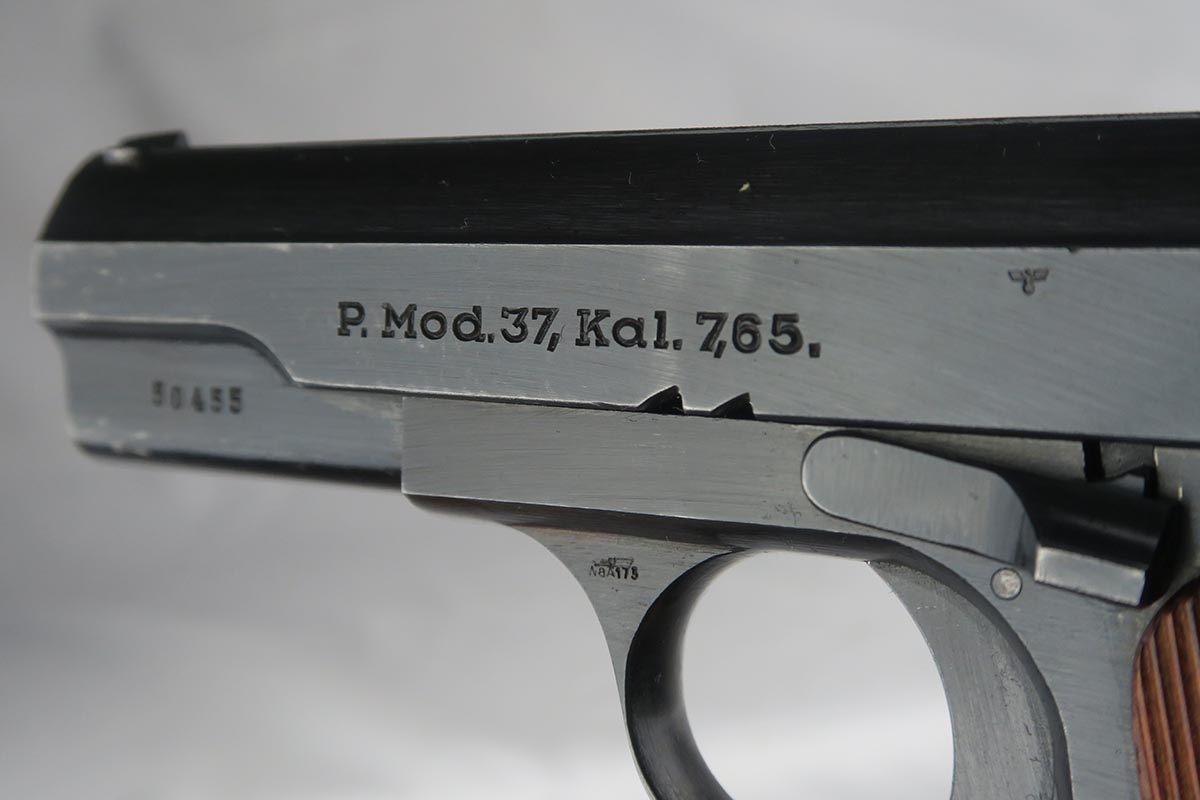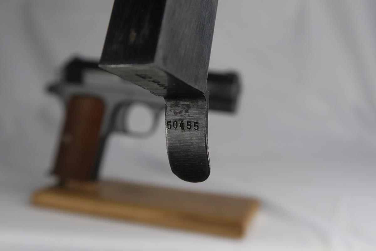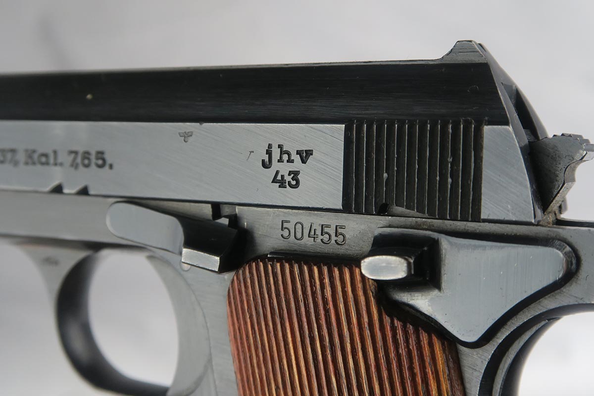 9/26/17 – This is a nice, original Femaru model 37 with original matching magazine and a nice shoulder holster. The pistol has about 95-96% blue remaining with a little wear on the trigger guard and some finish loss on both sides of the muzzle. The pistol is 1943 dated and Nazi marked. Excellent grips and magazine. The holster is unmarked but period correct, and in very good condition. Minty bore.