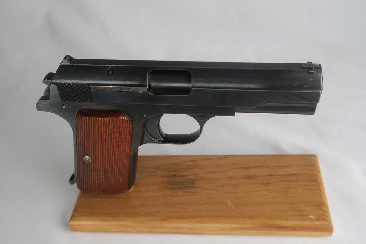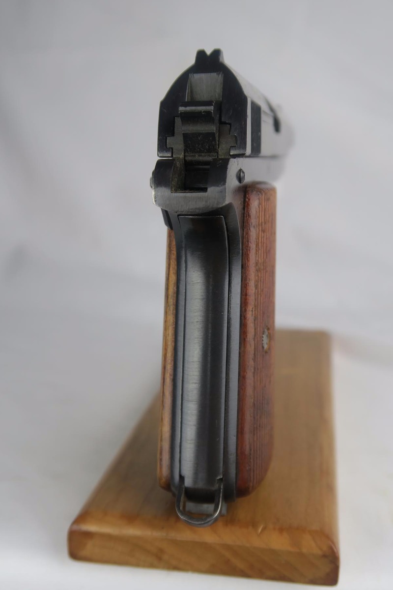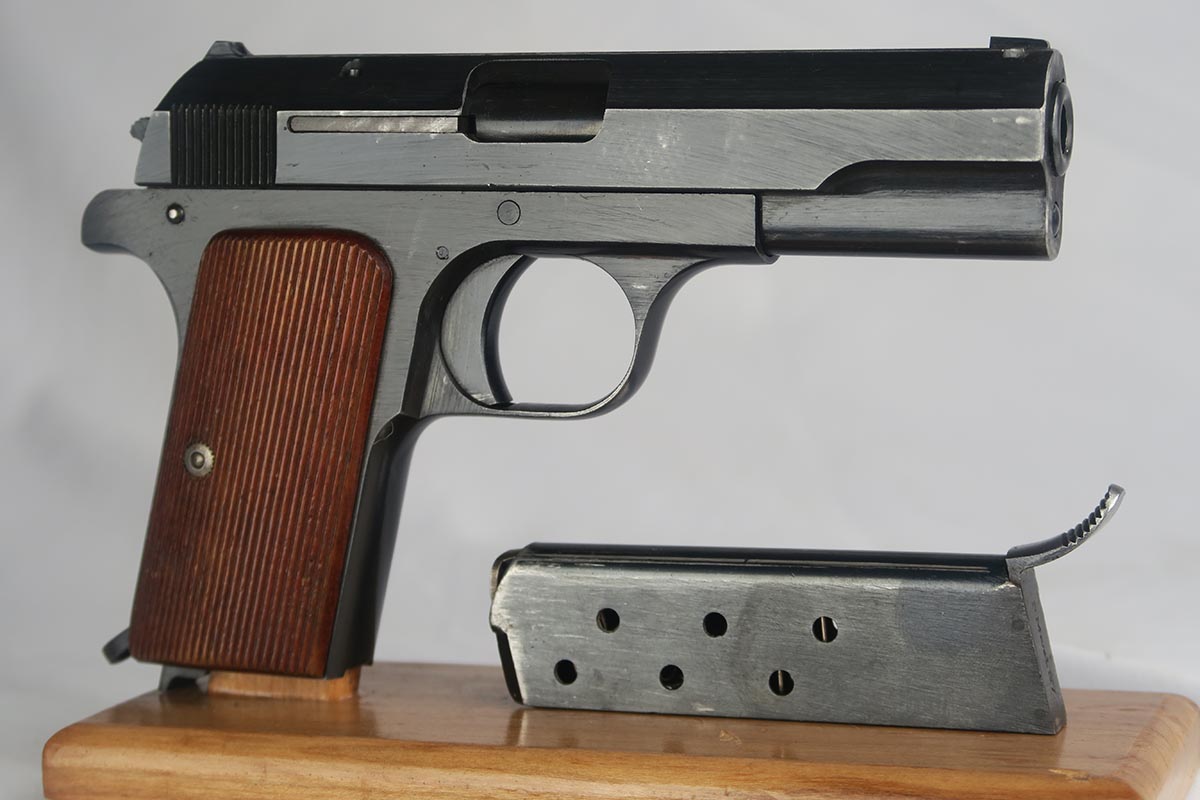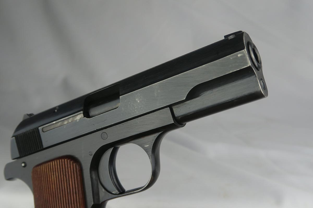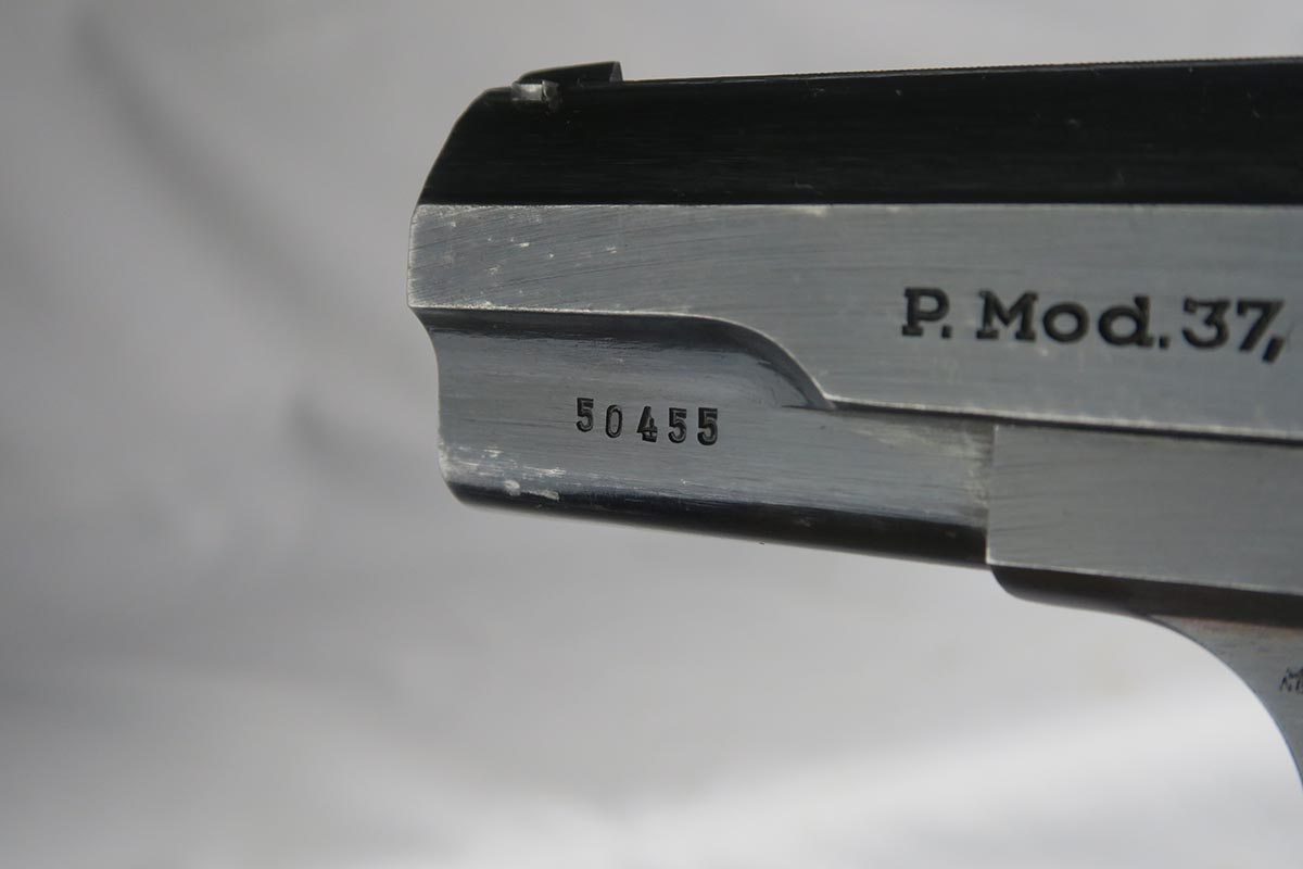 9/26/17 – This is a nice, original Femaru model 37 with original matching magazine and a nice shoulder holster. The pistol has about 95-96% blue remaining with a little wear on the trigger guard and some finish loss on both sides of the muzzle. The pistol is 1943 dated and Nazi marked. Excellent grips and magazine. The holster is unmarked but period correct, and in very good condition. Minty bore.