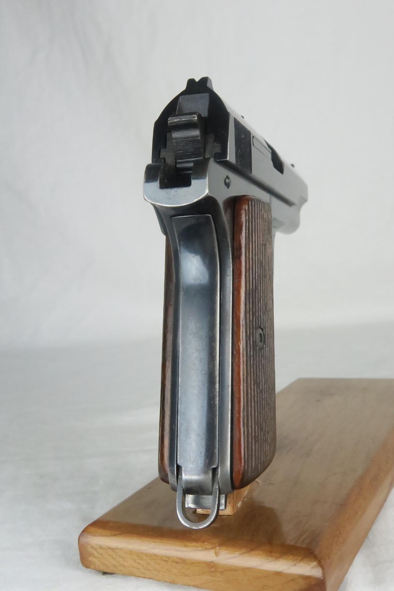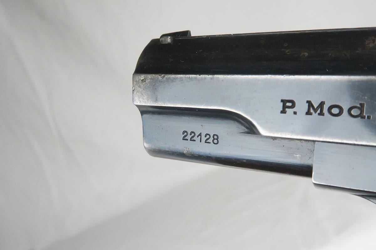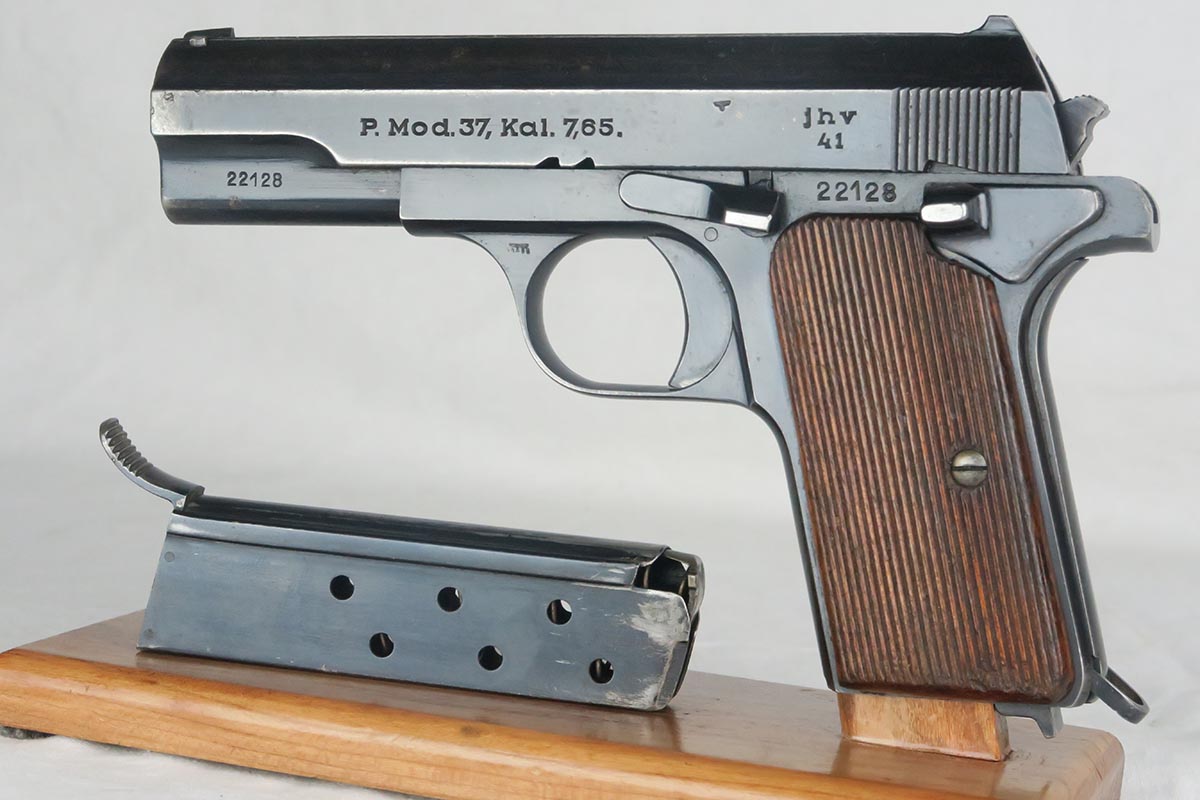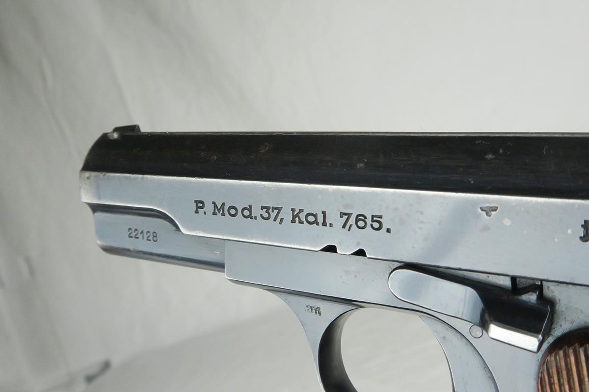 12/19/17 – This is a Hungarian Femaru Mod 37, with matching magazine, produced in 1941. Early in ’41, the Luftwaffe placed an order for 50,000 Model 1937 Femaru pistols in caliber 7.65mm. These first contract pistols are identified by the ‘jhv 41’ marking on the left side of the slide. Of those ’41 dated pistols, this is a subvariation 4, with E/WaA58 acceptance stamp on the trigger guard. This gun is all matching and original, including the magazine. The finish rates in the low 90’s, with high edge wear and some patina on the straps. Very nice grips and a beautiful bore.