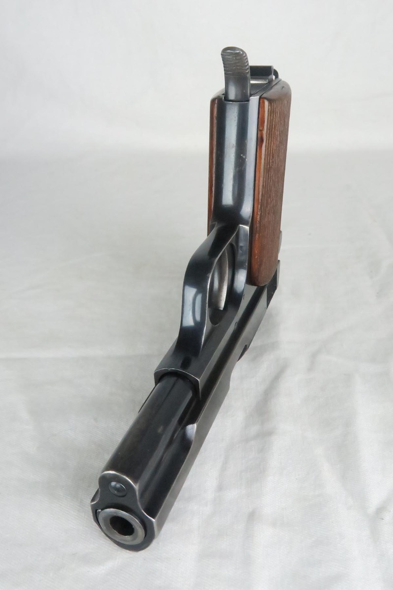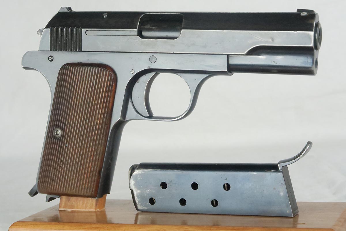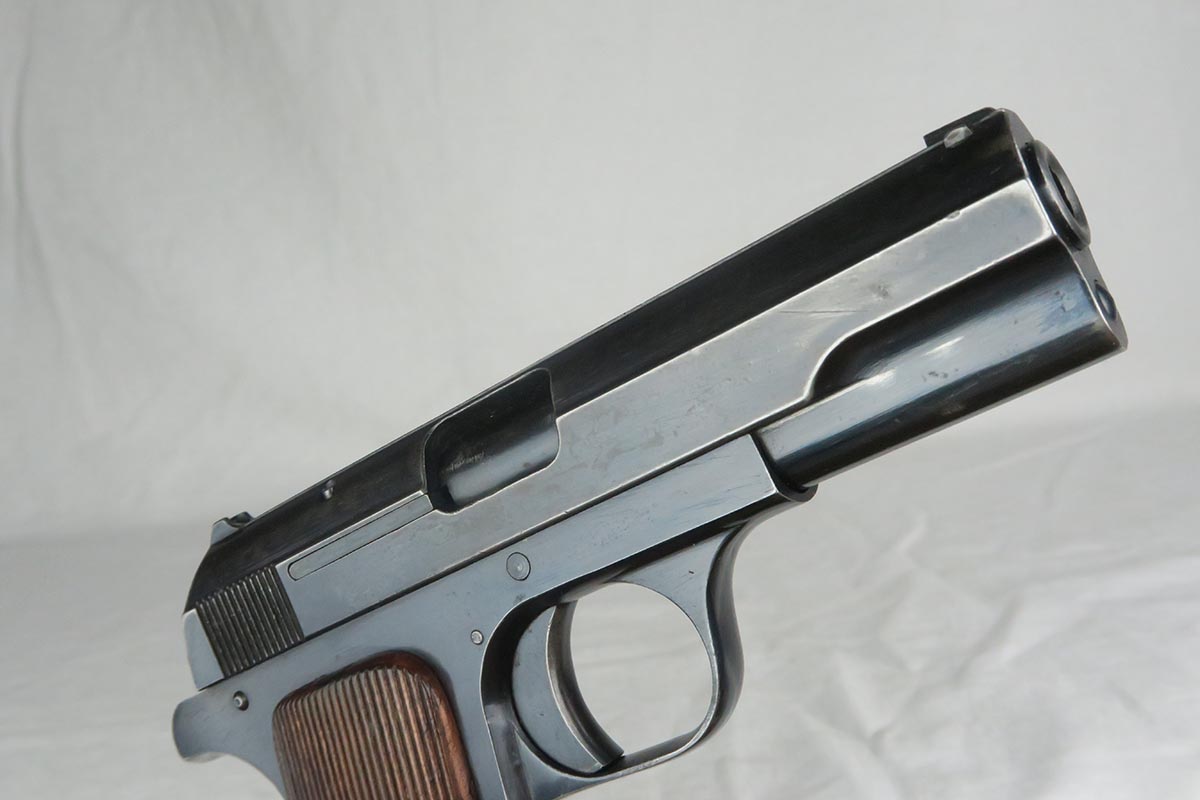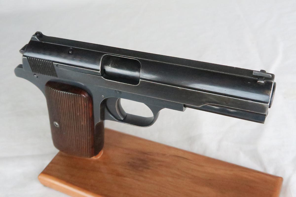 12/19/17 – This is a Hungarian Femaru Mod 37, with matching magazine, produced in 1941. Early in ’41, the Luftwaffe placed an order for 50,000 Model 1937 Femaru pistols in caliber 7.65mm. These first contract pistols are identified by the ‘jhv 41’ marking on the left side of the slide. Of those ’41 dated pistols, this is a subvariation 4, with E/WaA58 acceptance stamp on the trigger guard. This gun is all matching and original, including the magazine. The finish rates in the low 90’s, with high edge wear and some patina on the straps. Very nice grips and a beautiful bore.