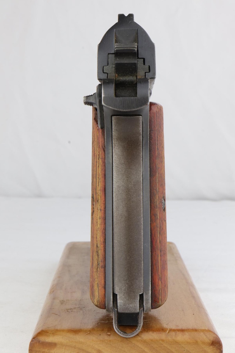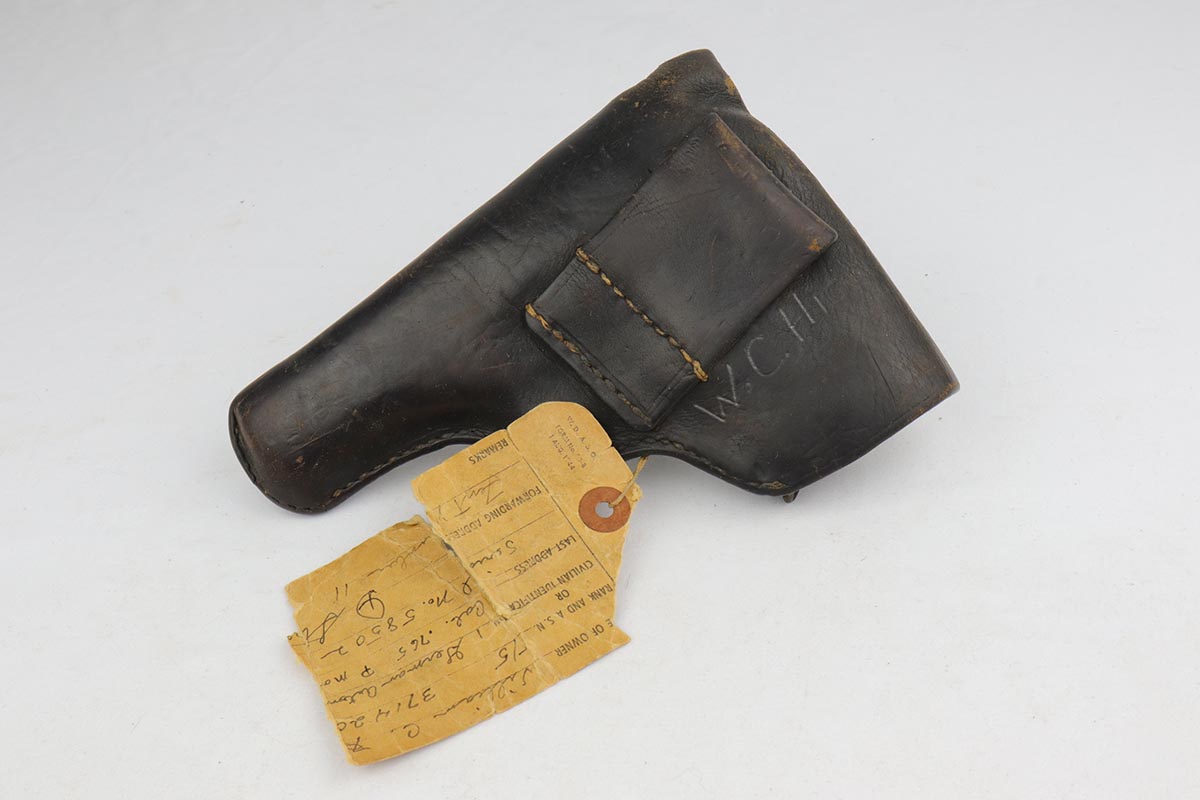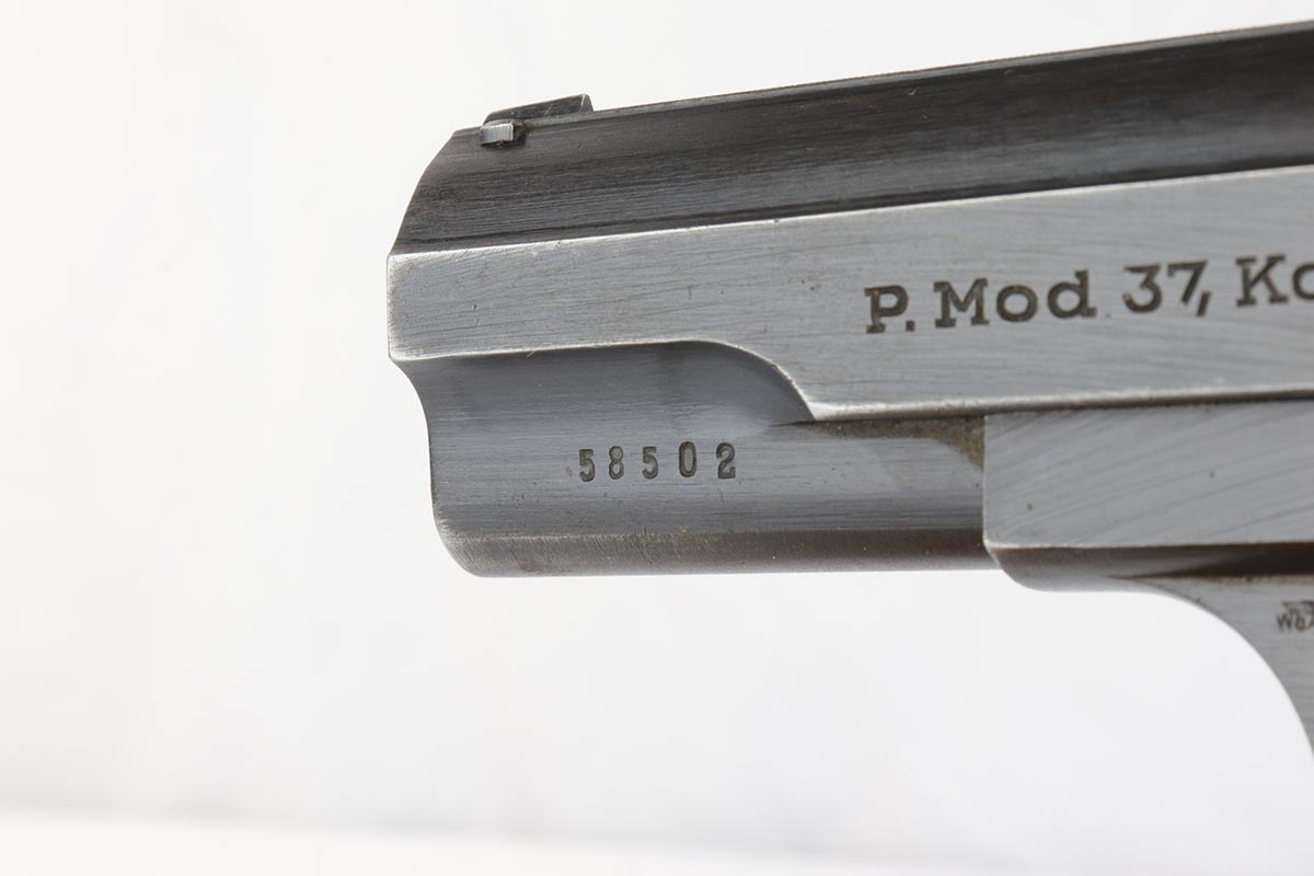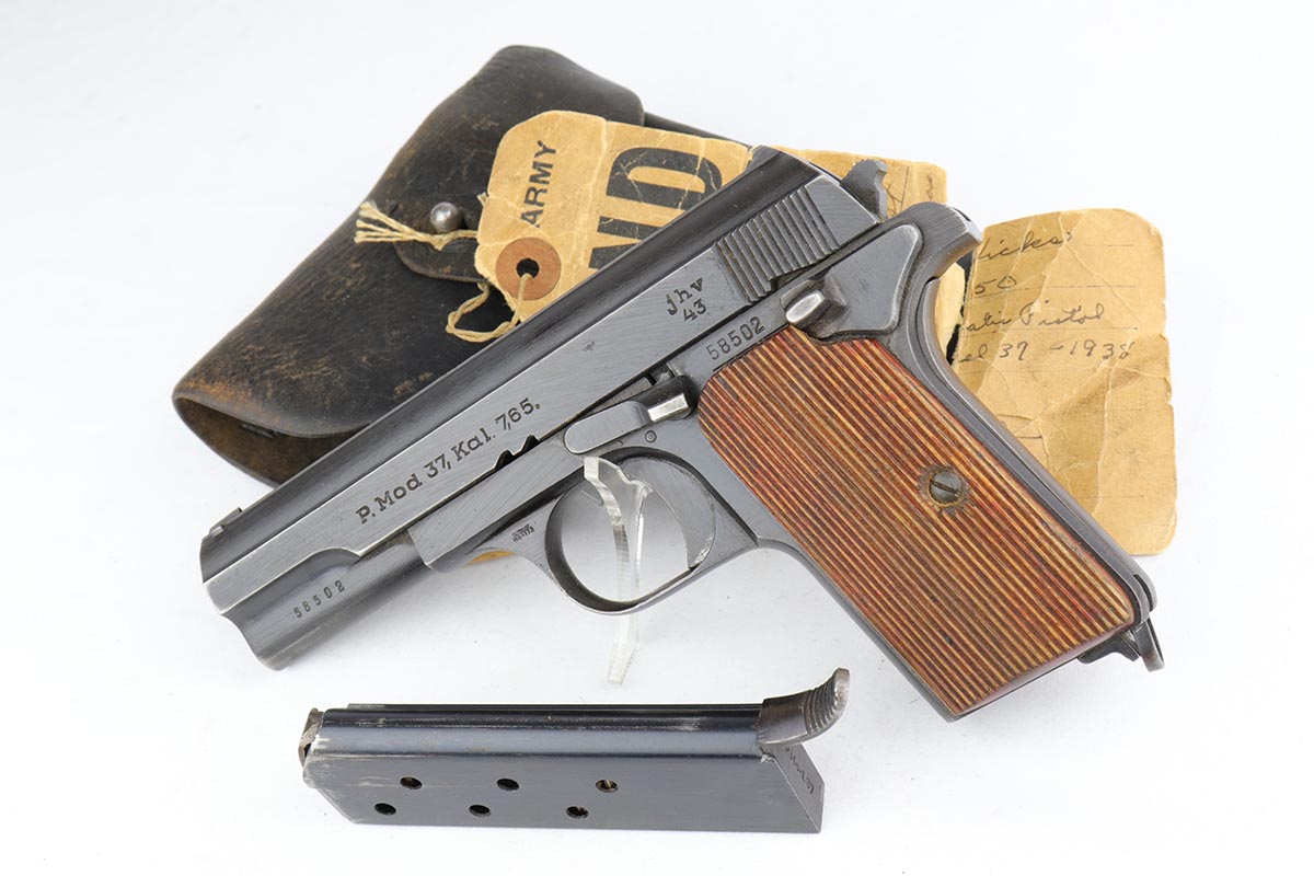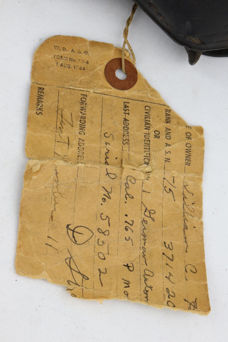 4/1/19 – This is a very nice Femaru M37 rig that was issued to the Nazi Army in 1943. The pistol is all matching and original, including the magazine, holster and GI tag. The pistol retains 92-93% bluing and is in excellent condition aside from the grip safety, which shows thinning and browning throughout. The original GI tag has been torn in two but is still present, and has the serial number of the pistol on it, as well as the name of the GI who brought it back. The GI also scratched his name into the holster, showing this to be an original bringback from the 1940s. Pistol has excellent bore and grips. Holster is worn with some modifications but helps to complete the assembly.