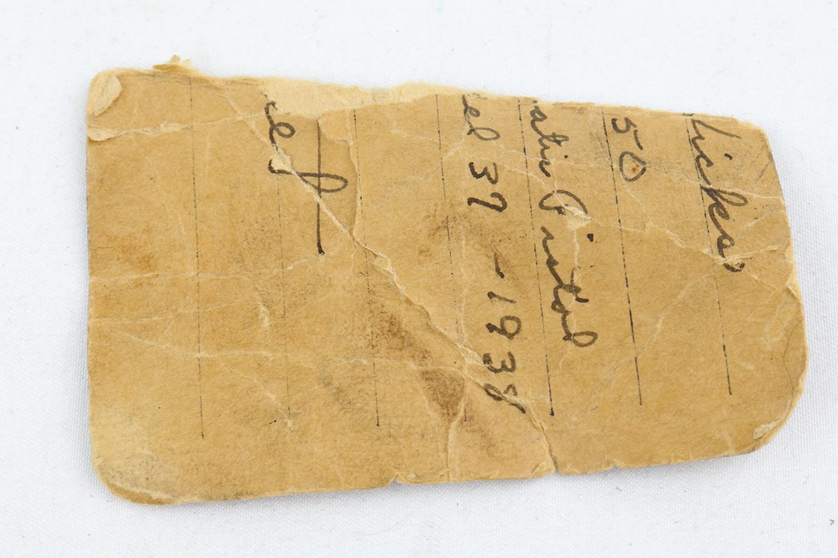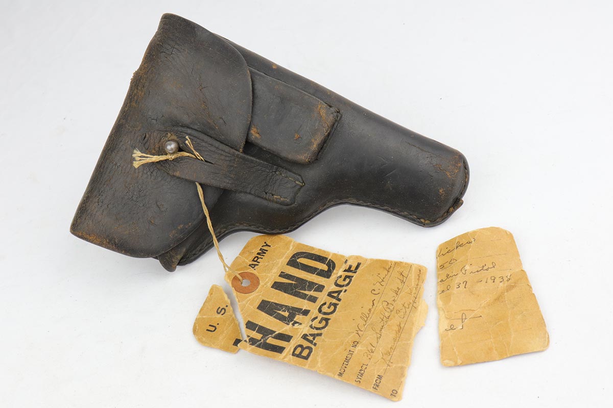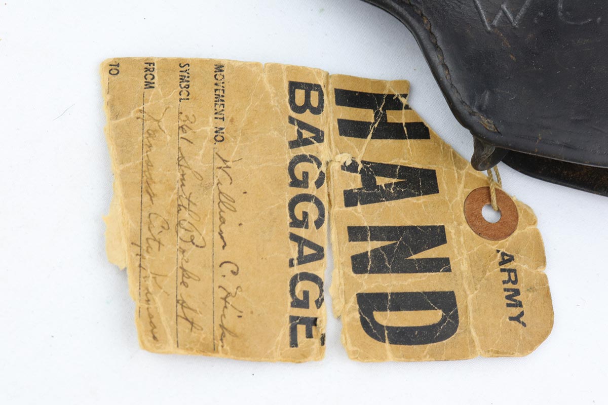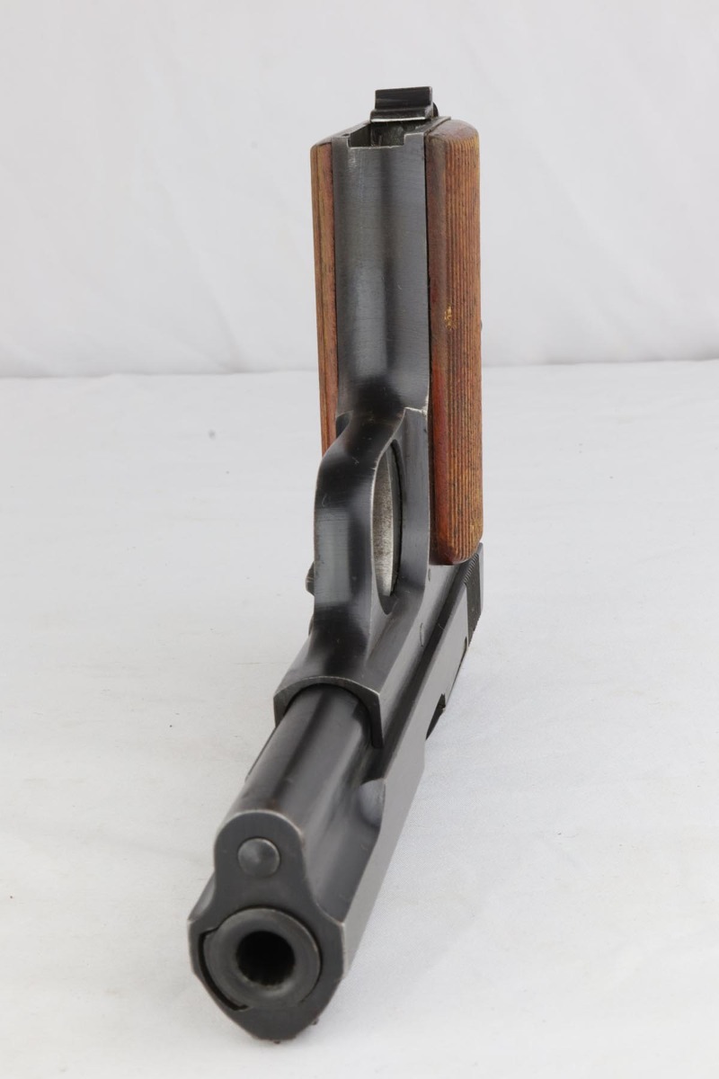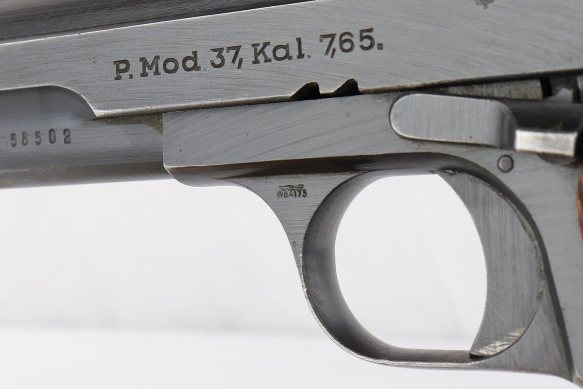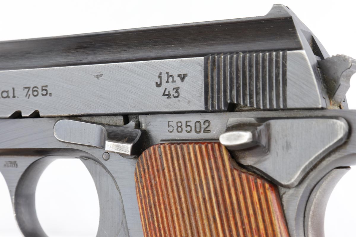 4/1/19 – This is a very nice Femaru M37 rig that was issued to the Nazi Army in 1943. The pistol is all matching and original, including the magazine, holster and GI tag. The pistol retains 92-93% bluing and is in excellent condition aside from the grip safety, which shows thinning and browning throughout. The original GI tag has been torn in two but is still present, and has the serial number of the pistol on it, as well as the name of the GI who brought it back. The GI also scratched his name into the holster, showing this to be an original bringback from the 1940s. Pistol has excellent bore and grips. Holster is worn with some modifications but helps to complete the assembly.