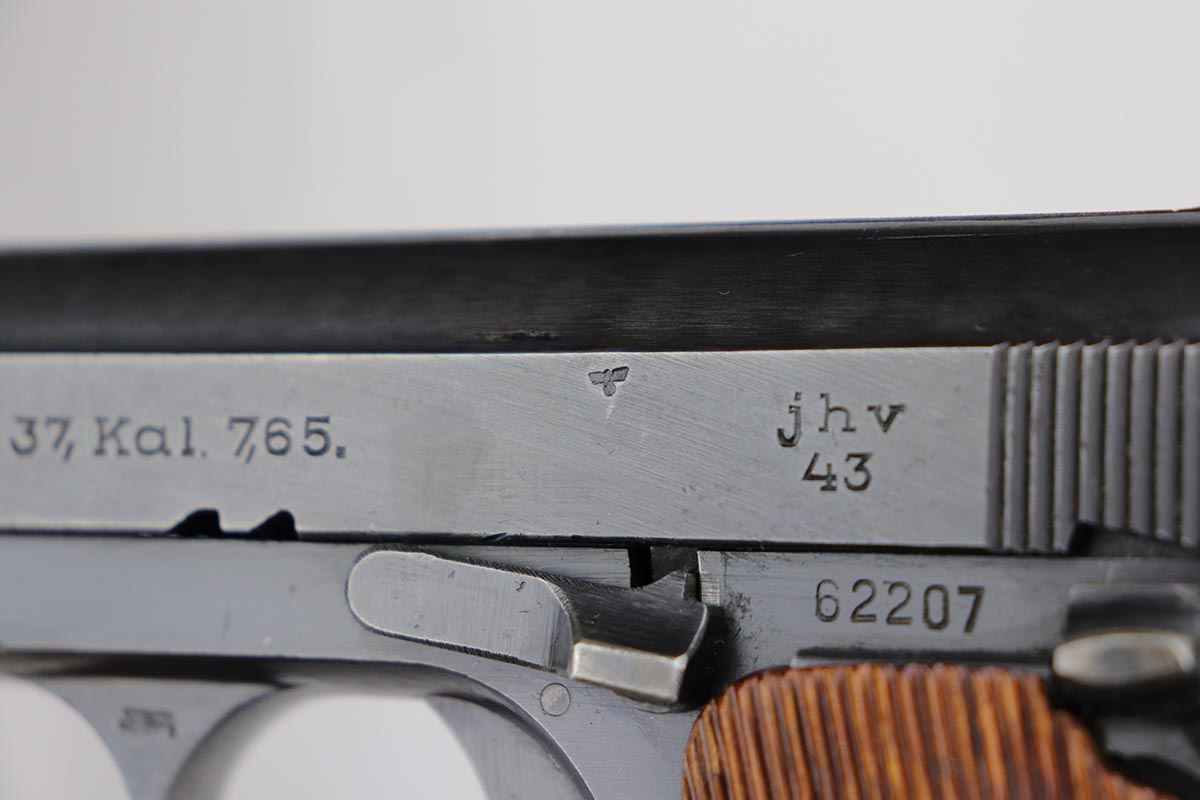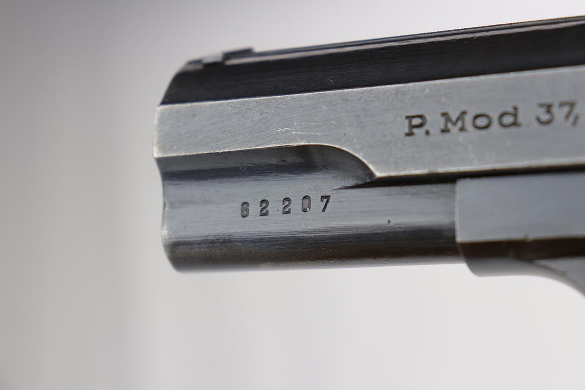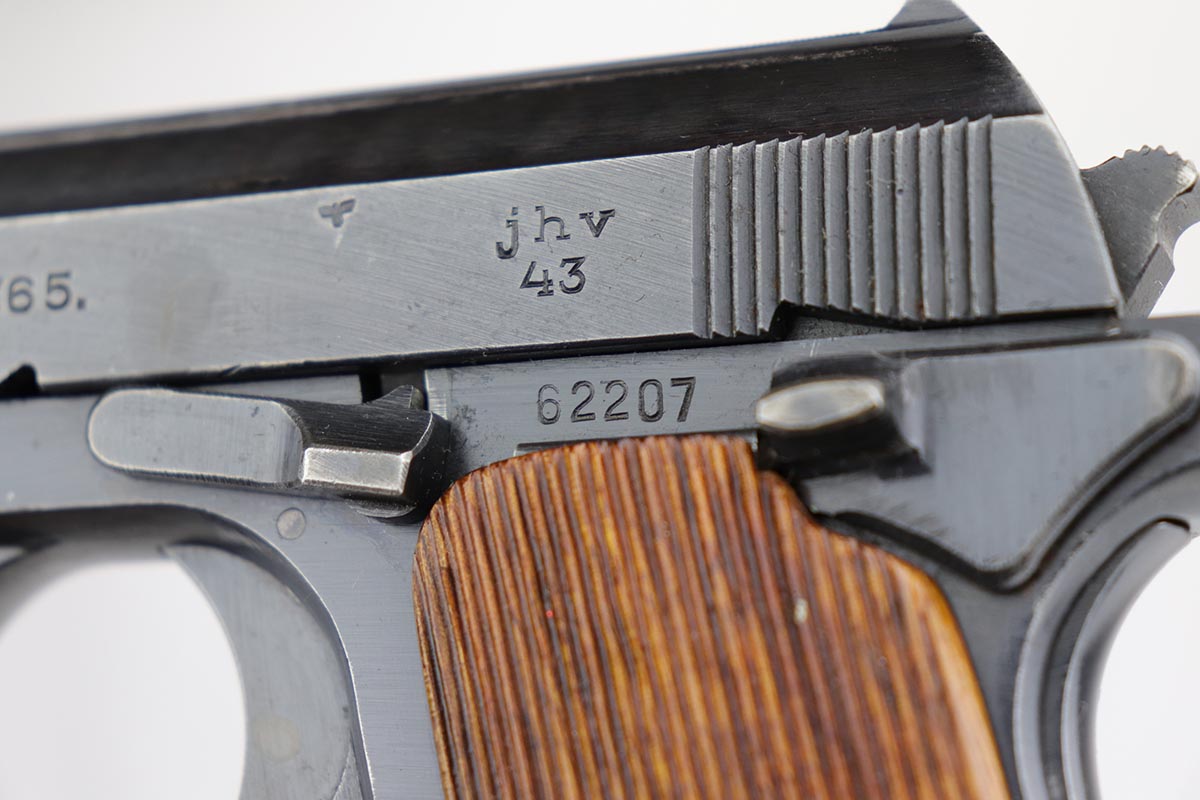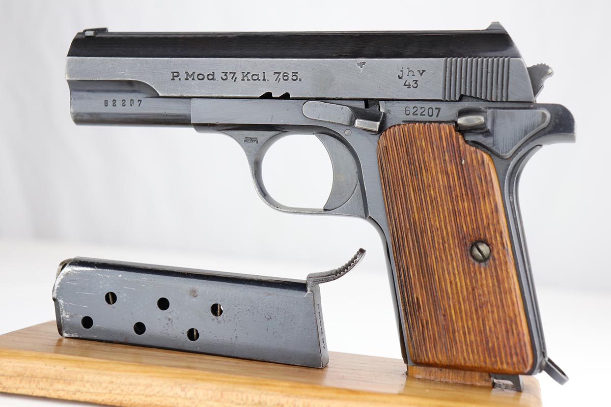 10/24/19 – This is a very nice Femaru M37 with its original matching magazine. It was manufactured in 1943 and issued to the Nazi Army, as indicated by waffenamt on the trigger guard. The original blue rates at about 95% with a beautiful frame, but minor thinning on either side of the slide, and minor oxidation on the right side. Minty bore and grips.