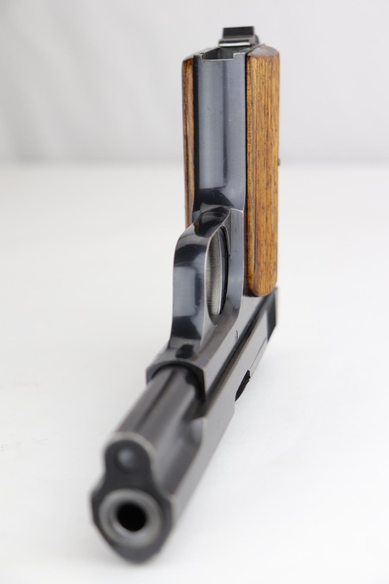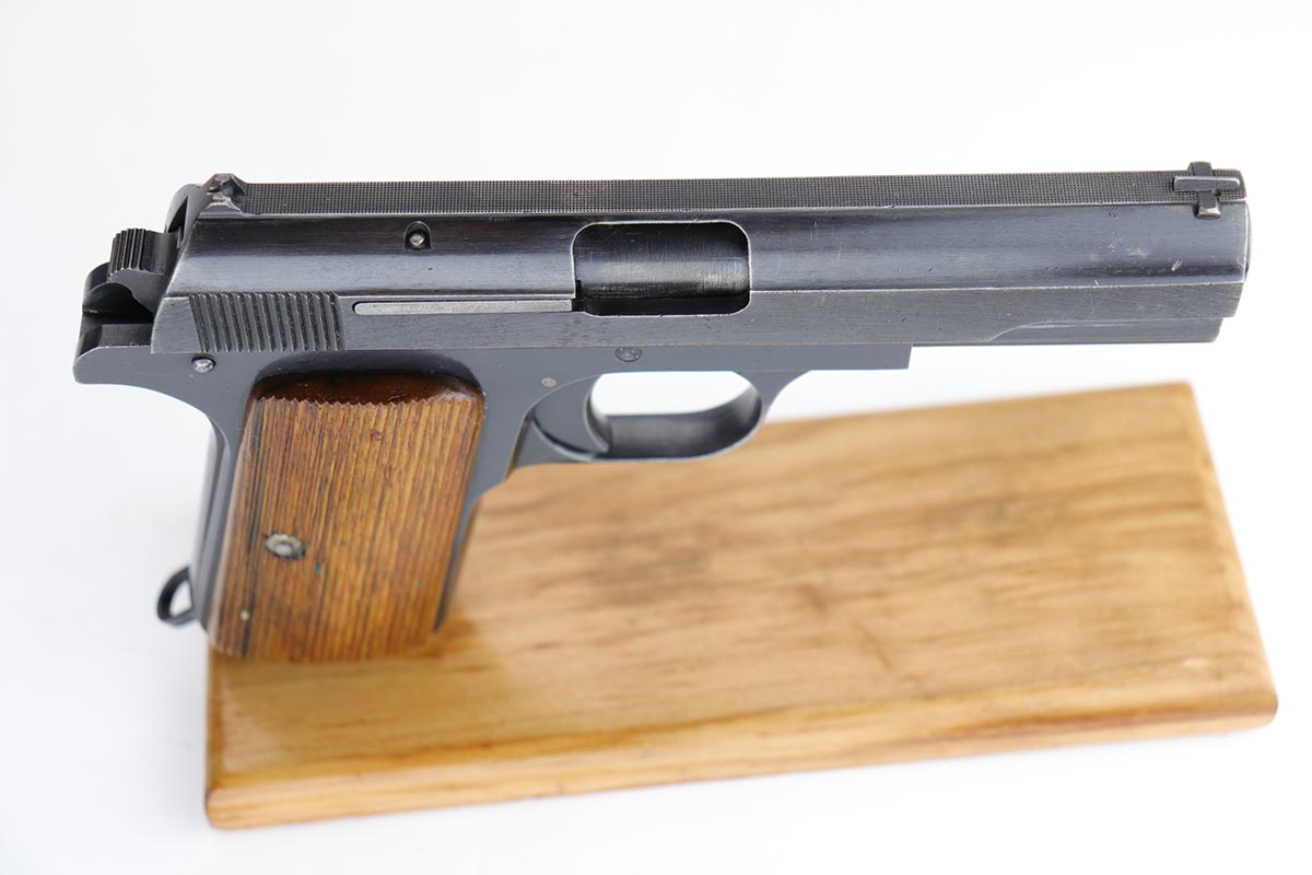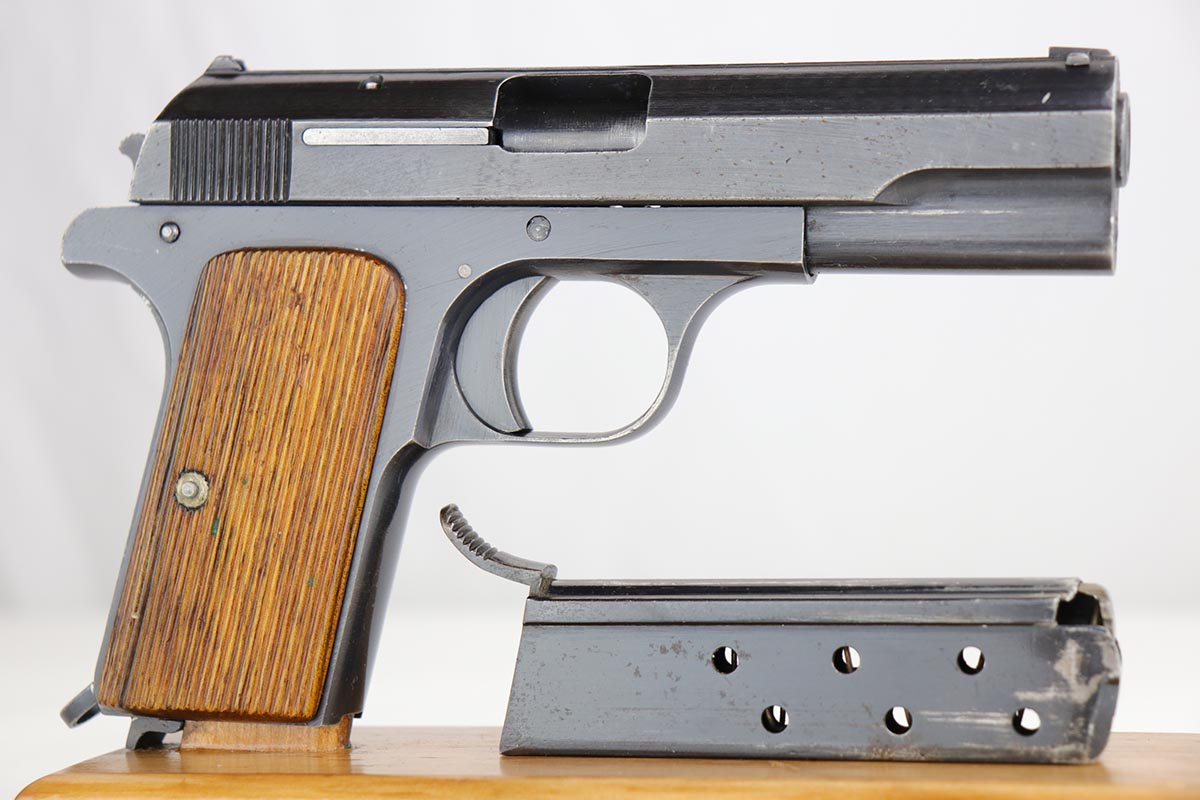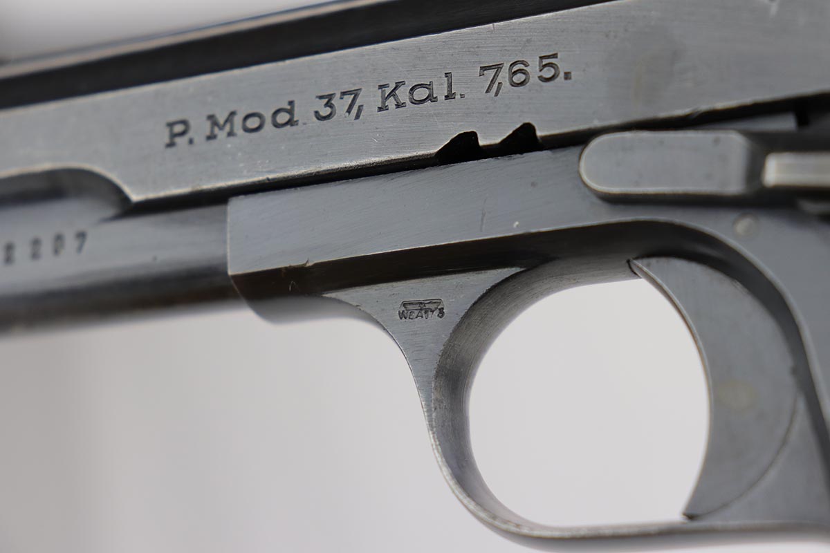 10/24/19 – This is a very nice Femaru M37 with its original matching magazine. It was manufactured in 1943 and issued to the Nazi Army, as indicated by waffenamt on the trigger guard. The original blue rates at about 95% with a beautiful frame, but minor thinning on either side of the slide, and minor oxidation on the right side. Minty bore and grips.