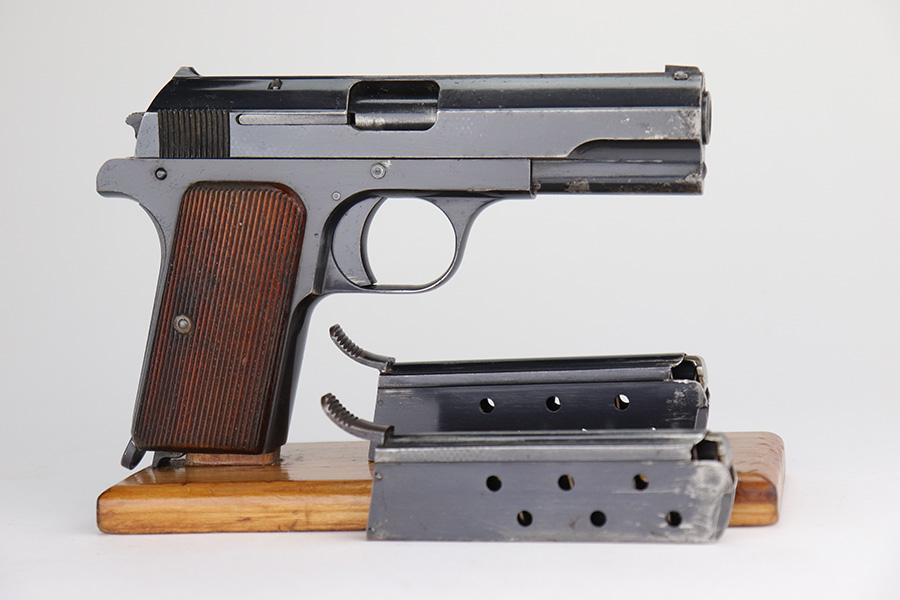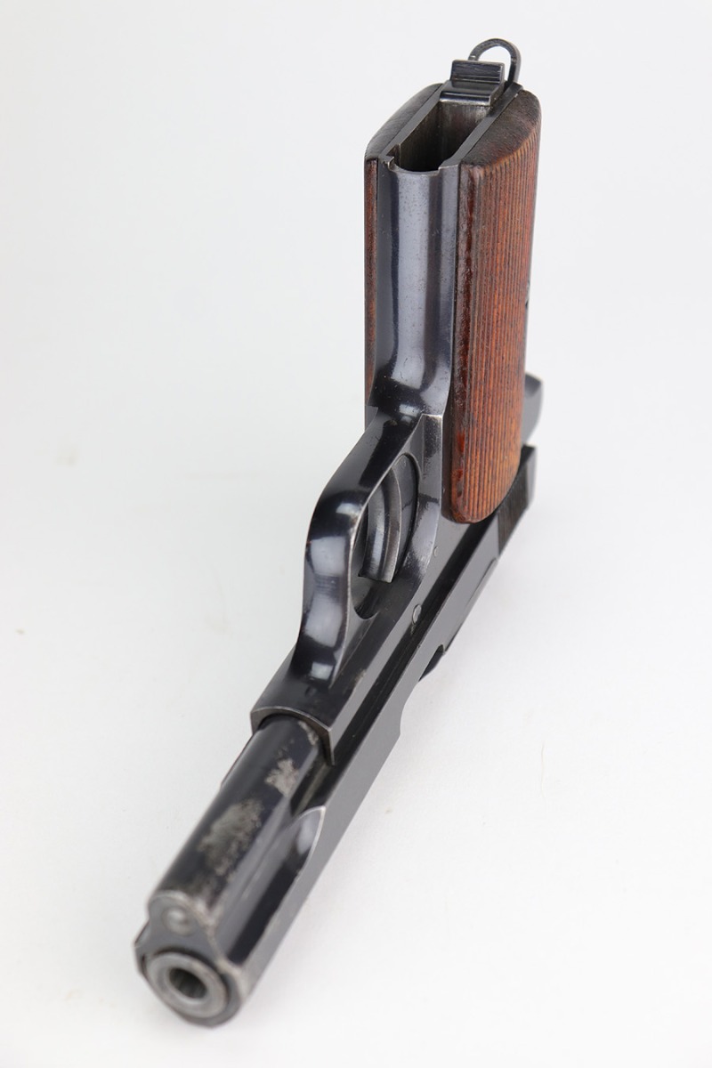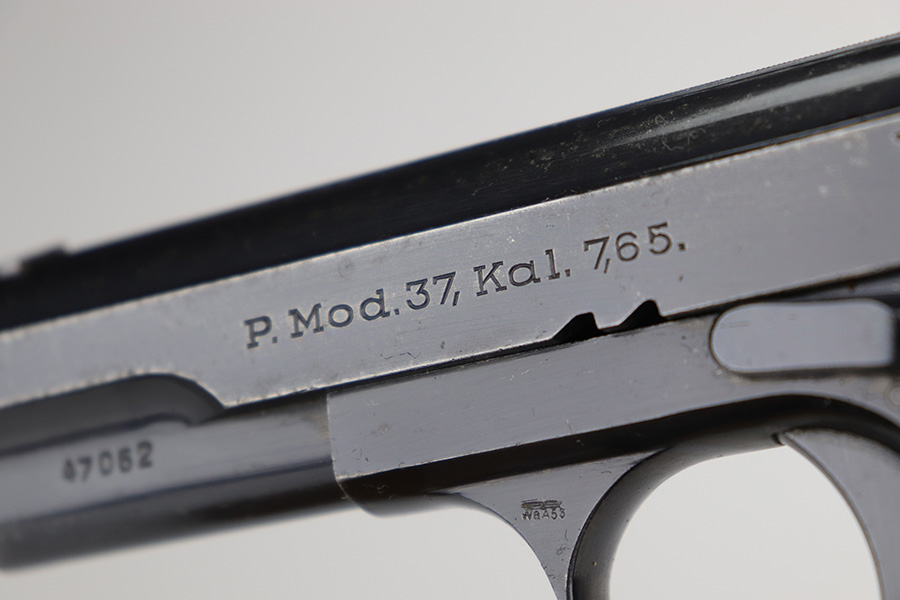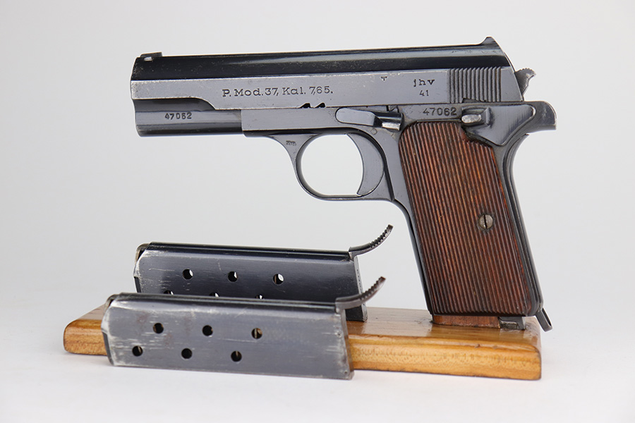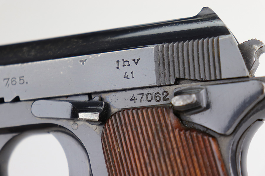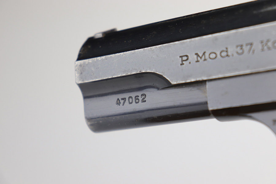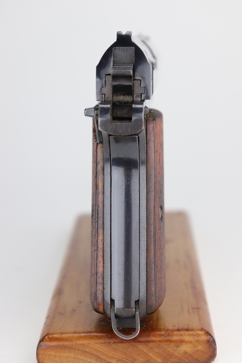 5/3/24 – This is an original Nazi Femaru Model 37 from 1941, with one of the original matching magazines. All matching and original with about 85% of the blue remaining. There’s freckling all along the left side of the slide, but most of the finish loss is on the underside and right side of slide. Strong bore with just a little frost in the grooves. Excellent grips. NOTE: The listing includes only ONE magazine.