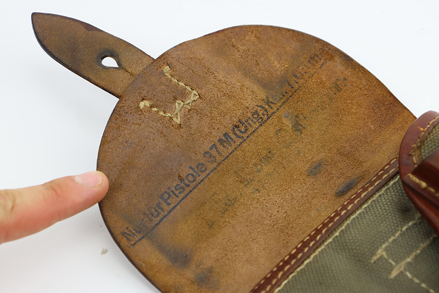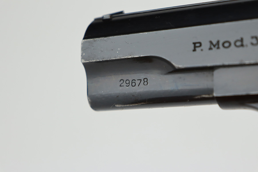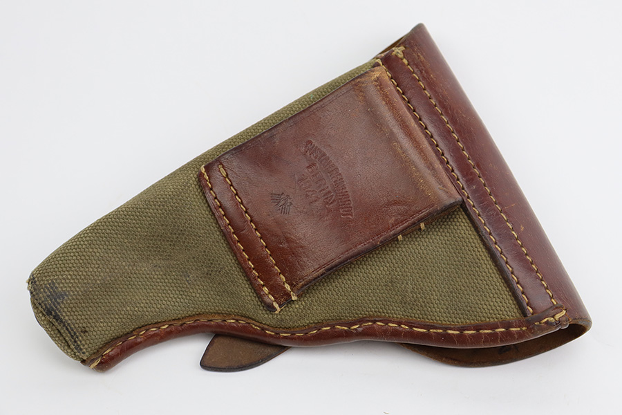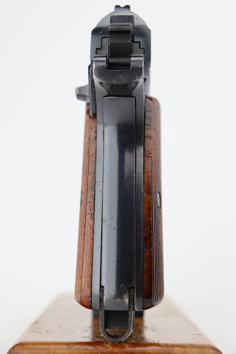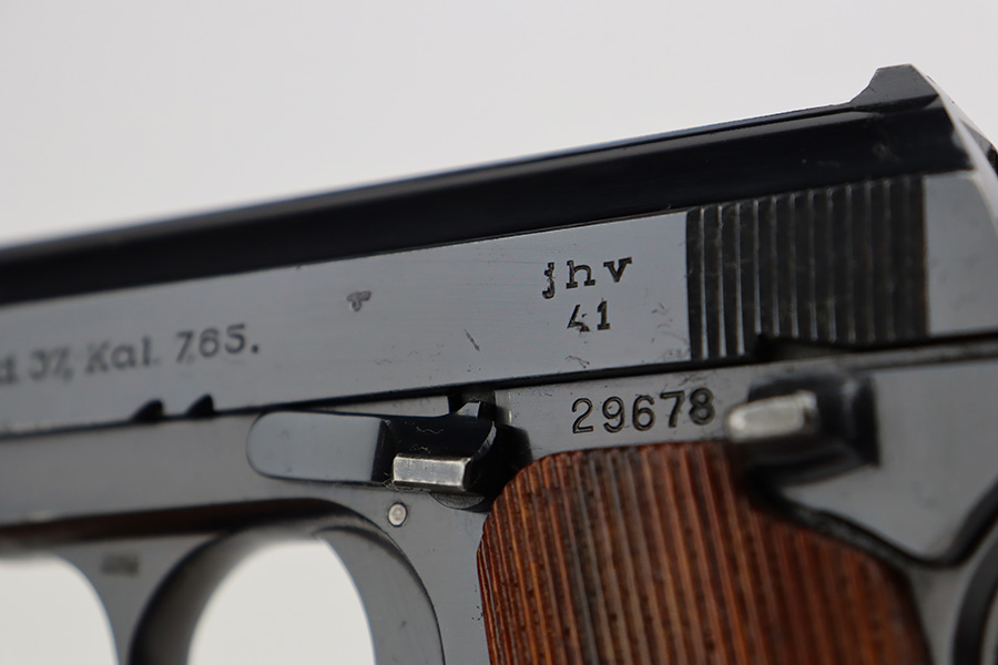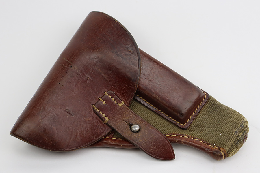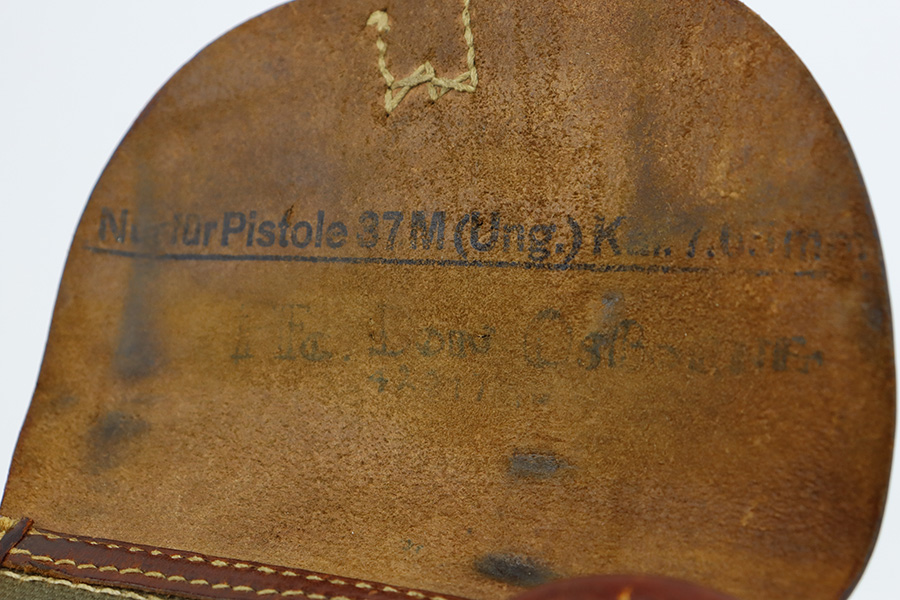 8/10/23 – This is an excellent and complete Nazi Femaru M37 rig from 1941. It’s matching and original with 96-97% of the blue remaining. Nearly all of the wear is near the muzzle and on the underside of the slide, with a tiny bit of pinpricking on the slide, as well. Excellent grips with no defects. A total of two original magazines, both numbered but mismatched to this pistol. Strong, shiny bore with only minor signs of use. The rig is completed by the scarce and desirable tropical-style canvas holster, which is maker marked and was also made in 1941. It’s in great condition, with minor wear around the toe, and a few minor surface holes/impacts on the top flap. It is also clearly inkstamped internally.