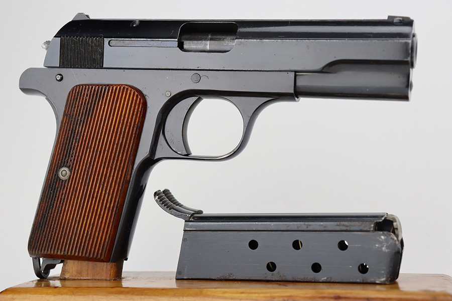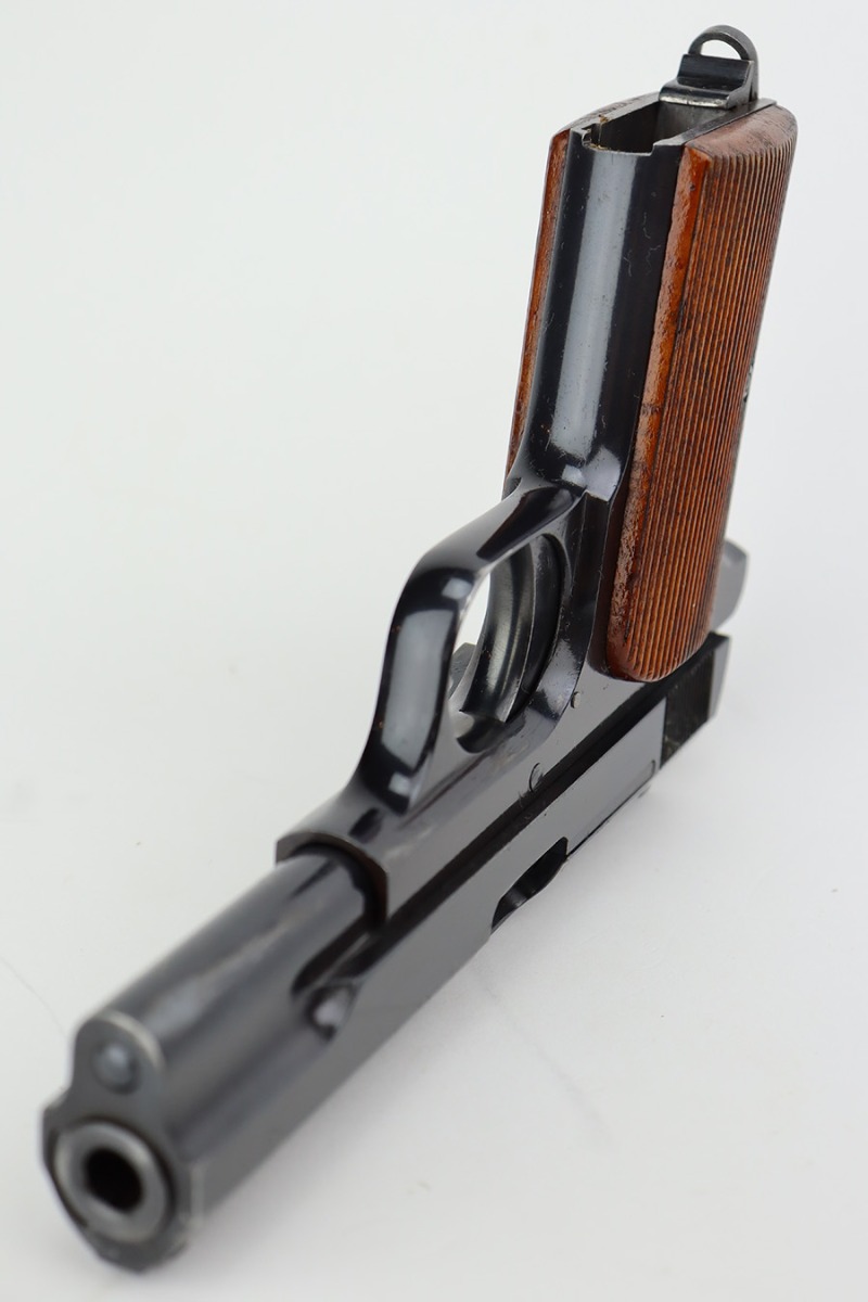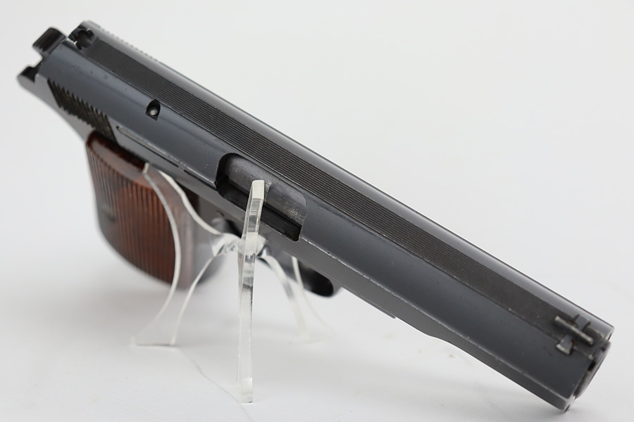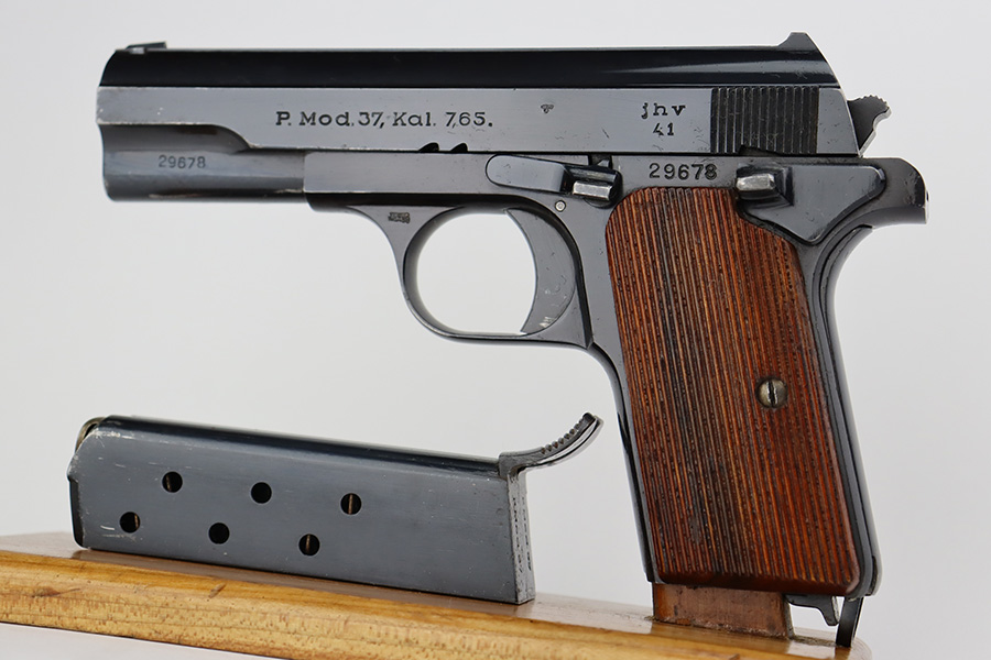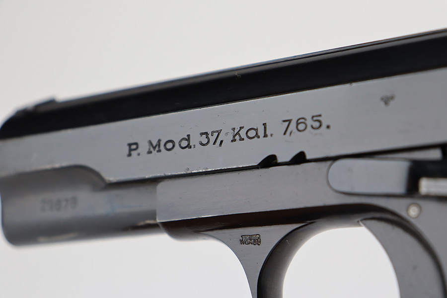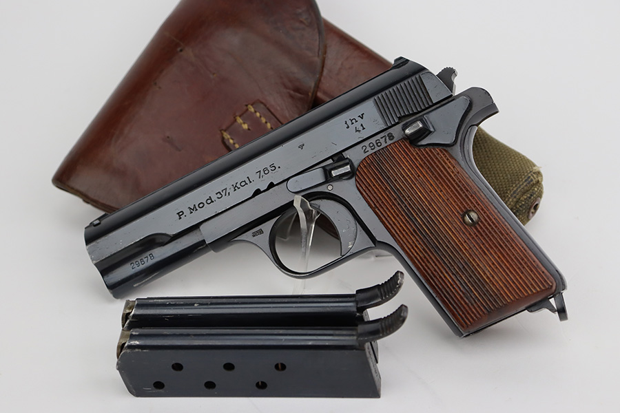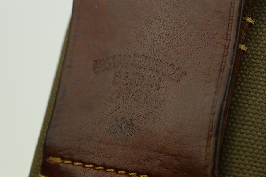 8/10/23 – This is an excellent and complete Nazi Femaru M37 rig from 1941. It’s matching and original with 96-97% of the blue remaining. Nearly all of the wear is near the muzzle and on the underside of the slide, with a tiny bit of pinpricking on the slide, as well. Excellent grips with no defects. A total of two original magazines, both numbered but mismatched to this pistol. Strong, shiny bore with only minor signs of use. The rig is completed by the scarce and desirable tropical-style canvas holster, which is maker marked and was also made in 1941. It’s in great condition, with minor wear around the toe, and a few minor surface holes/impacts on the top flap. It is also clearly inkstamped internally.