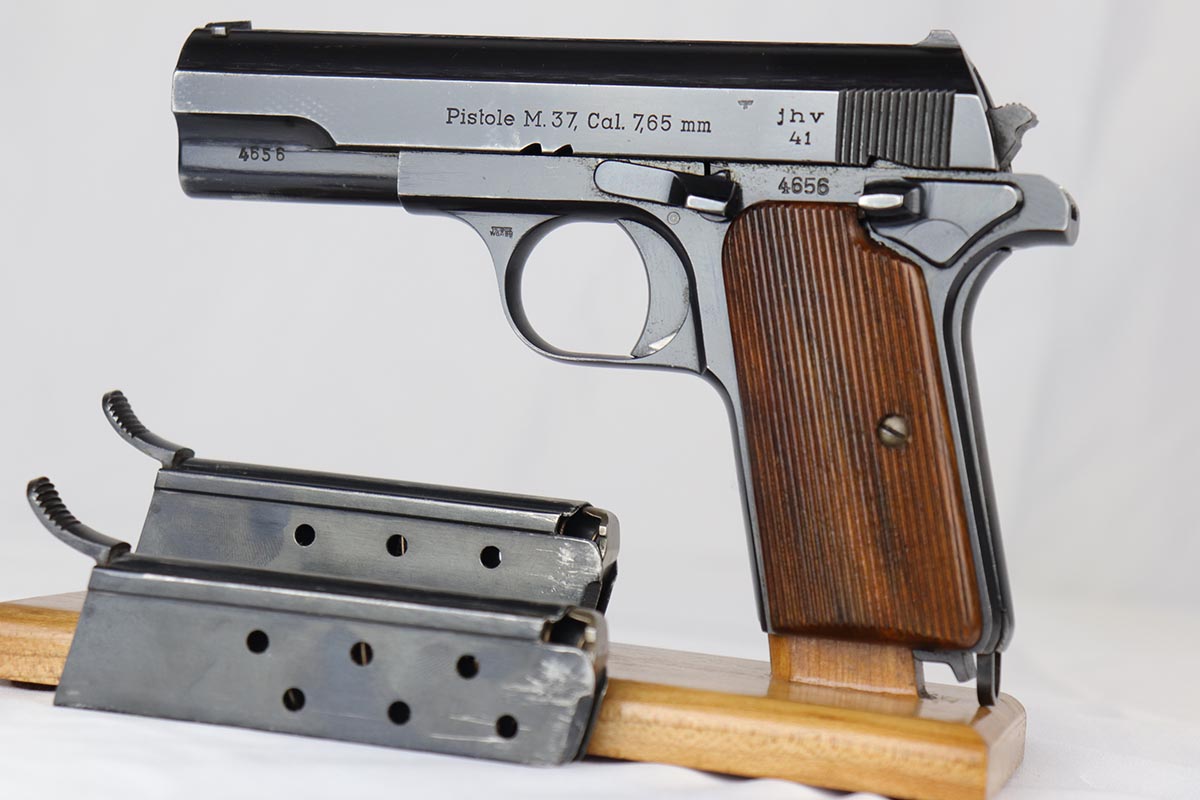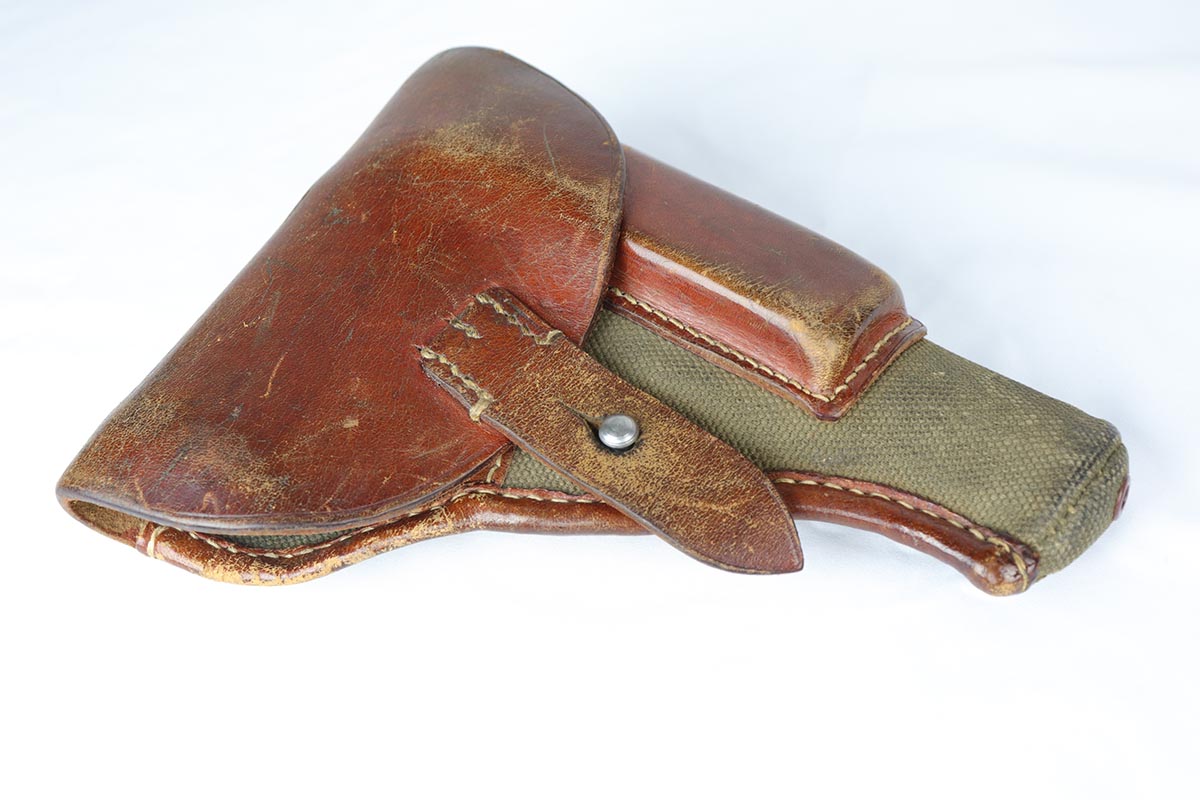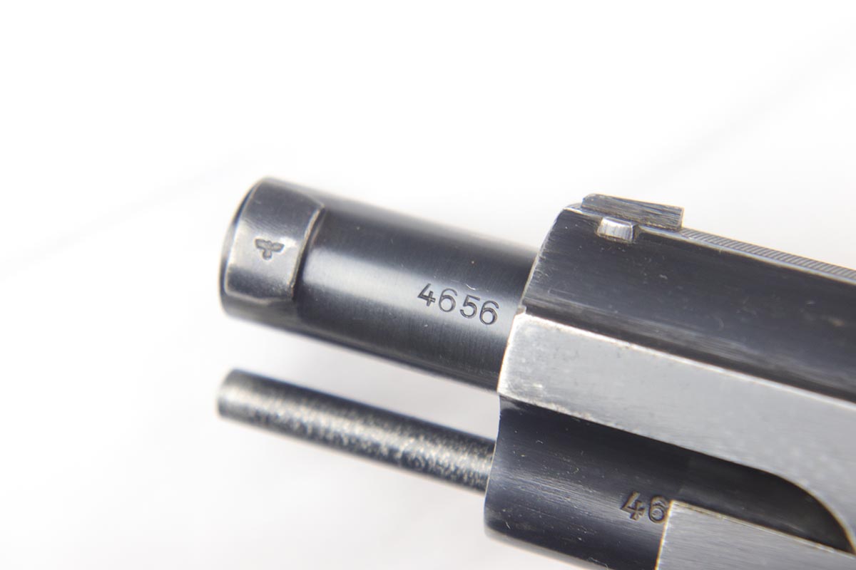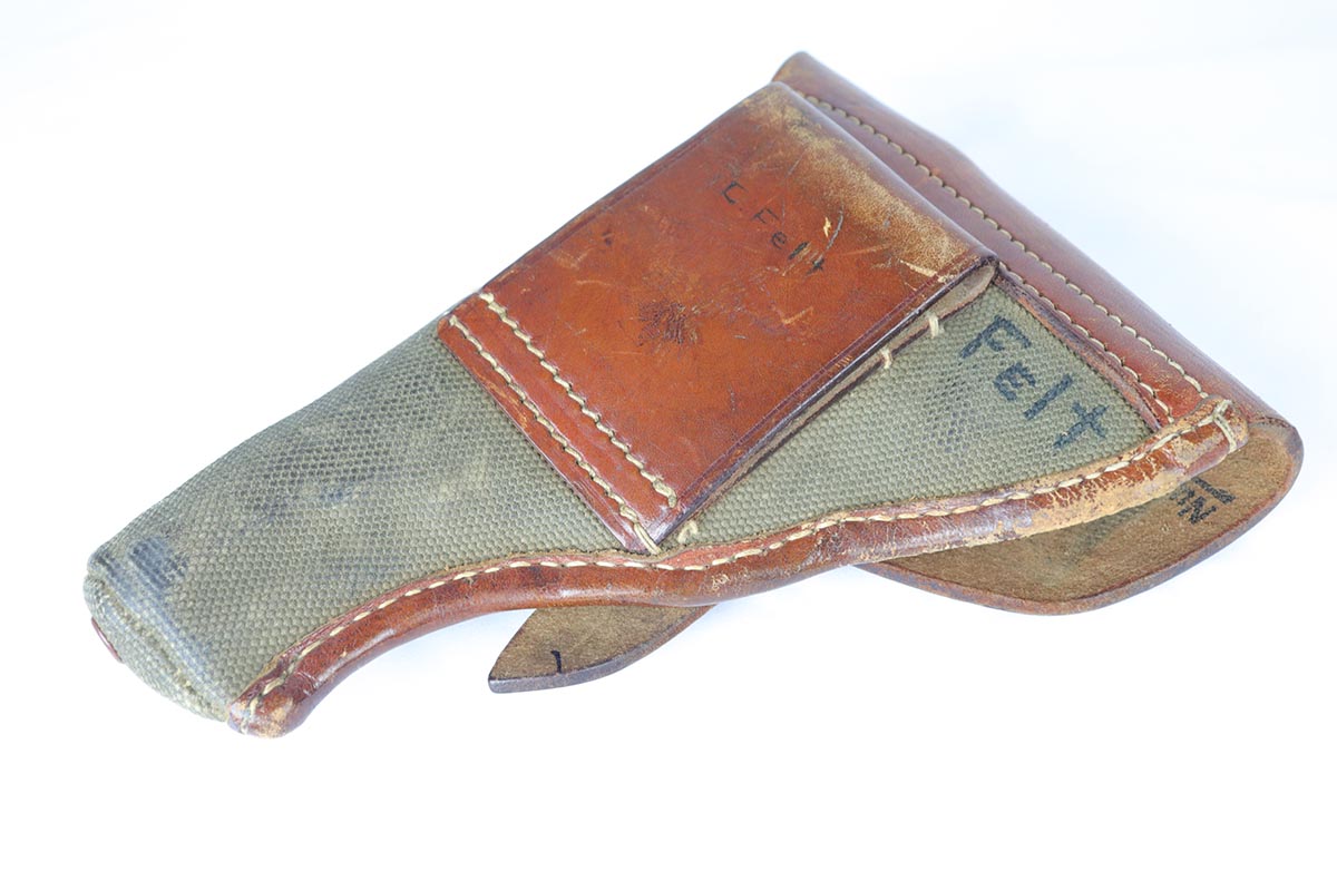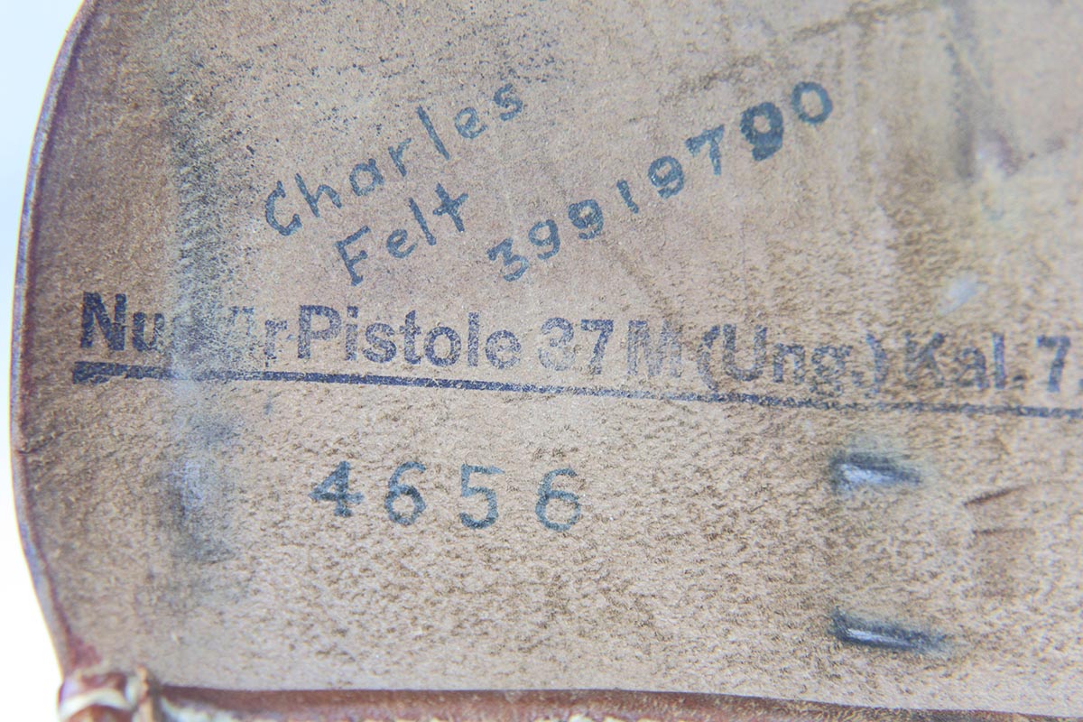 8/3/18 – This is an all matching and complete Femaru Model 37 pistol rig, with both original matching magazines and a scarce canvas holster. Both the pistol and holster are 1941 dated, and the holster shows an Eagle/7 proof. The pistol rig was Nazi Army issued and retains about 90-92% original blue. There is minor wear on the left side slide, trigger guard and underside of the slide, but the majority of finish loss is on the back strap. Excellent bore and original grips. The holster is also numbered to the pistol internally, along with the name of the vet who brought it back.