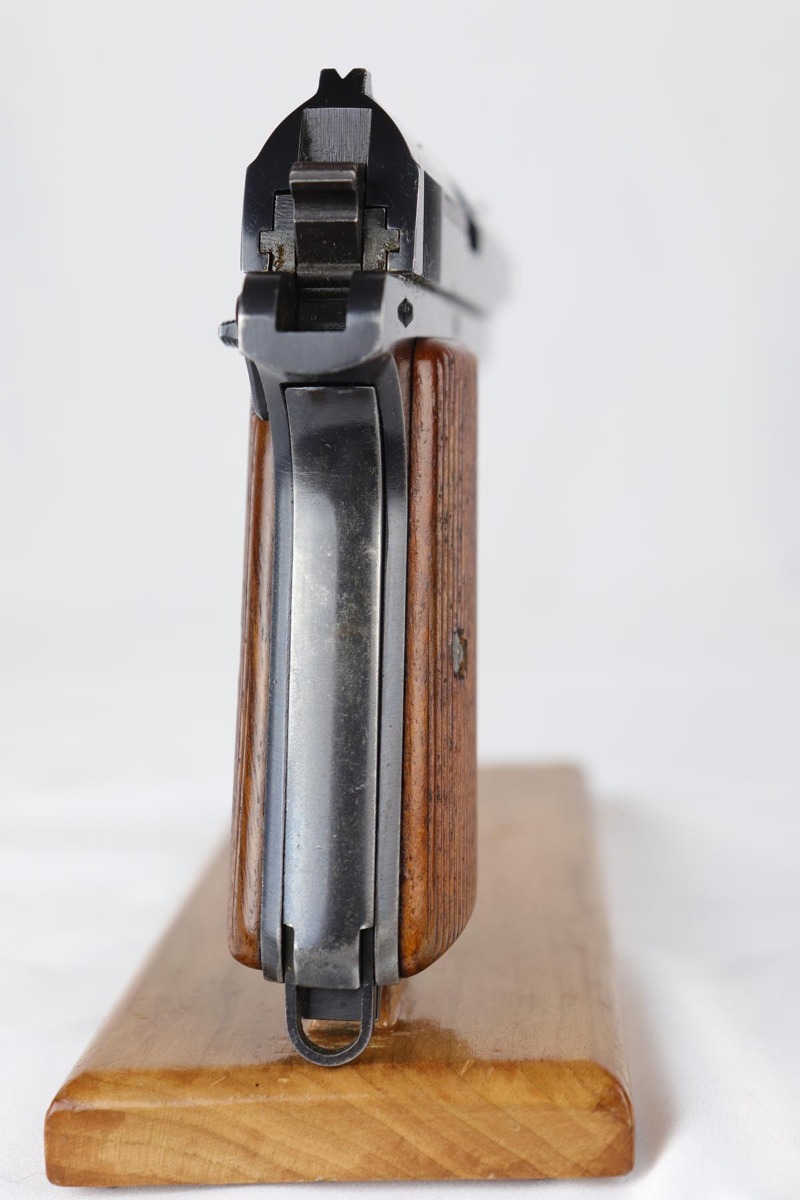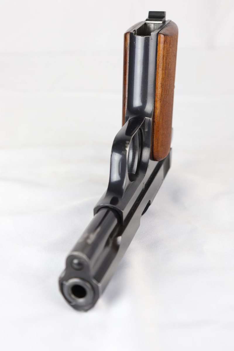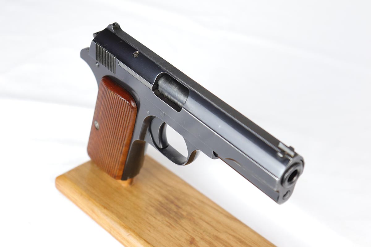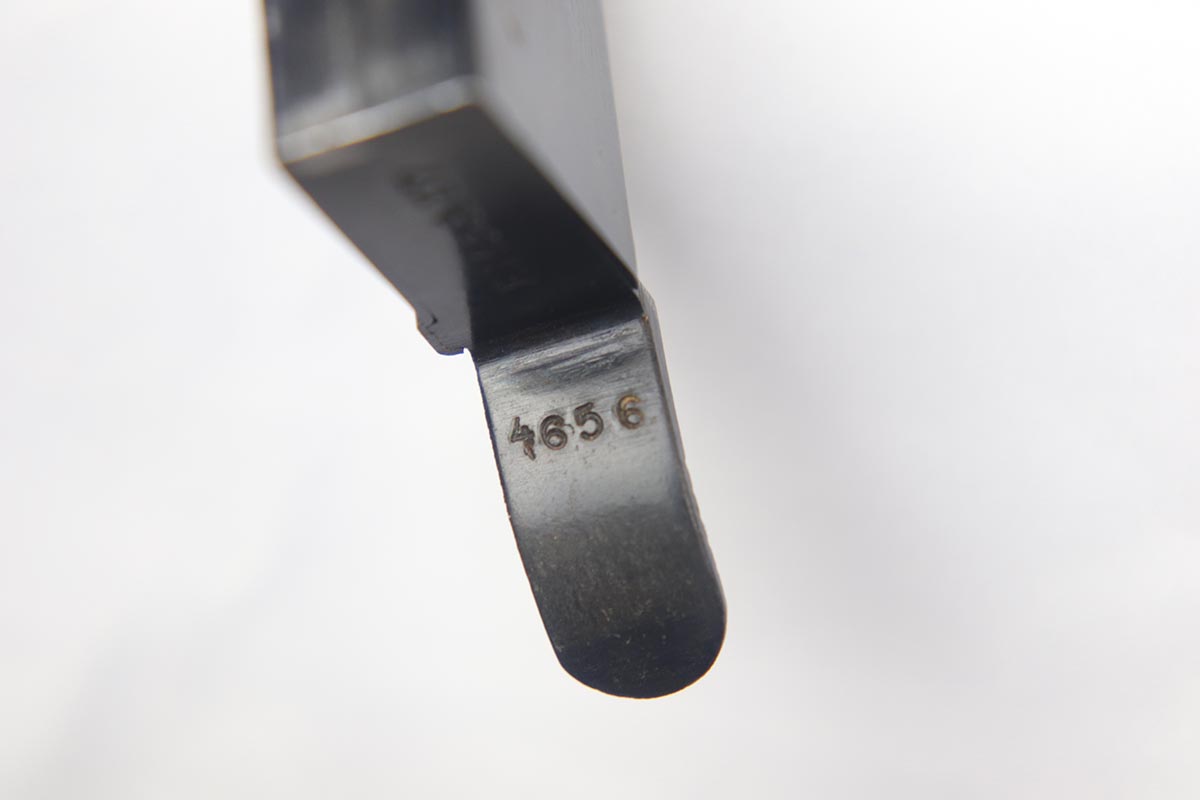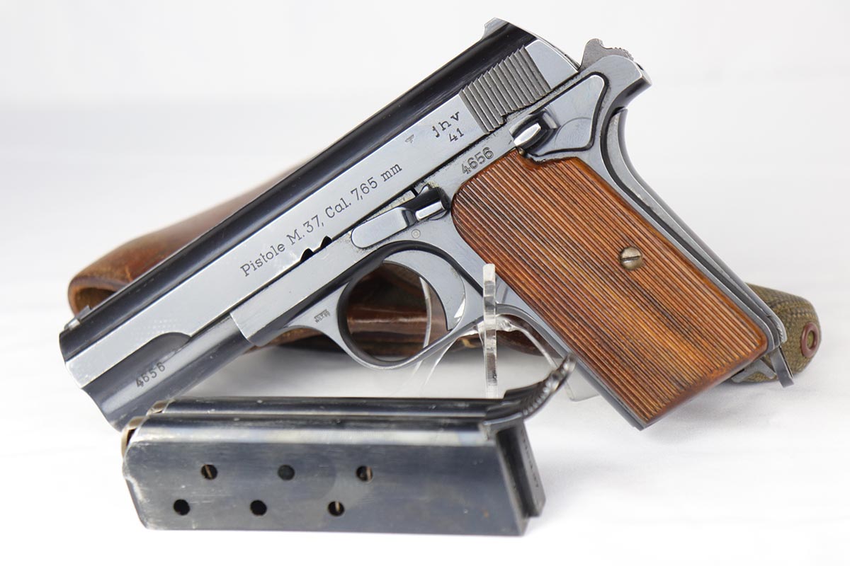 8/3/18 – This is an all matching and complete Femaru Model 37 pistol rig, with both original matching magazines and a scarce canvas holster. Both the pistol and holster are 1941 dated, and the holster shows an Eagle/7 proof. The pistol rig was Nazi Army issued and retains about 90-92% original blue. There is minor wear on the left side slide, trigger guard and underside of the slide, but the majority of finish loss is on the back strap. Excellent bore and original grips. The holster is also numbered to the pistol internally, along with the name of the vet who brought it back.