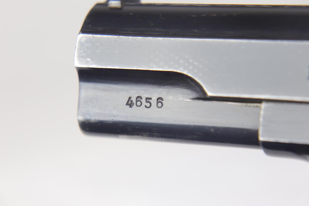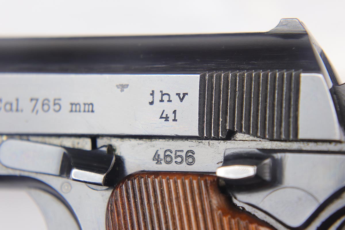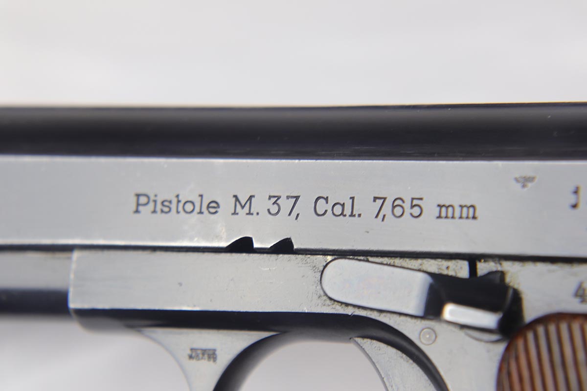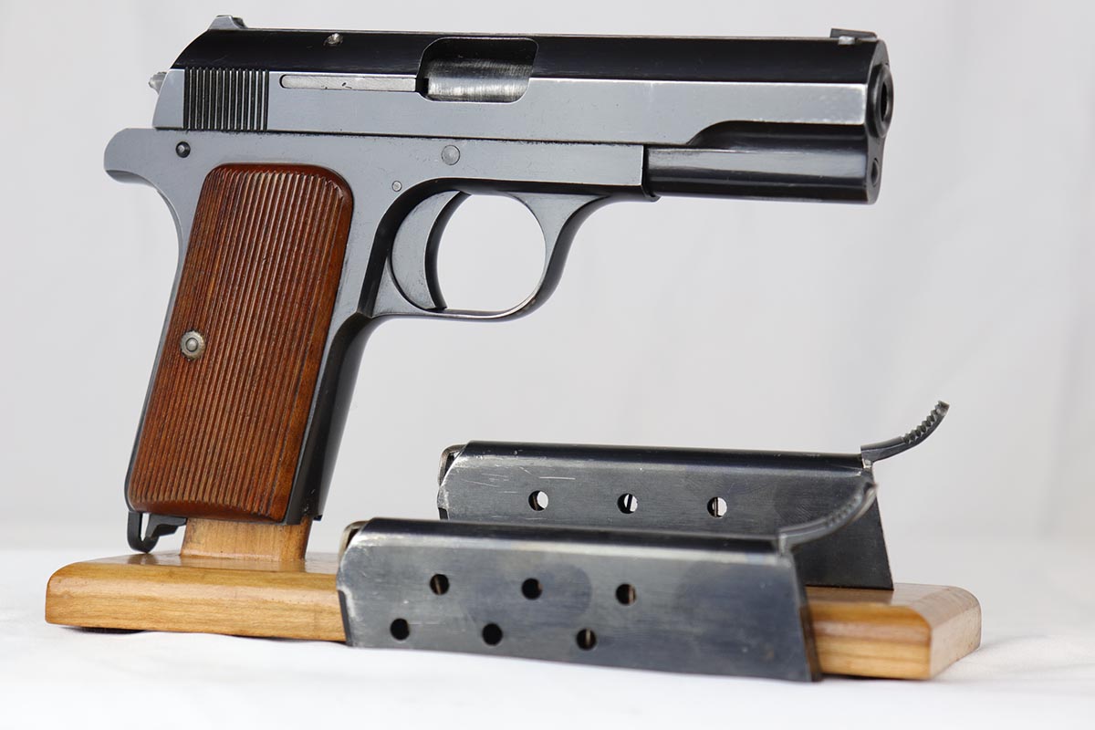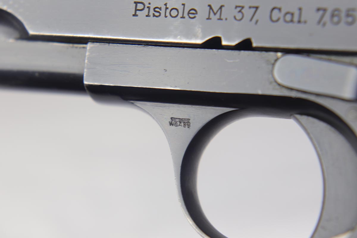 8/3/18 – This is an all matching and complete Femaru Model 37 pistol rig, with both original matching magazines and a scarce canvas holster. Both the pistol and holster are 1941 dated, and the holster shows an Eagle/7 proof. The pistol rig was Nazi Army issued and retains about 90-92% original blue. There is minor wear on the left side slide, trigger guard and underside of the slide, but the majority of finish loss is on the back strap. Excellent bore and original grips. The holster is also numbered to the pistol internally, along with the name of the vet who brought it back.