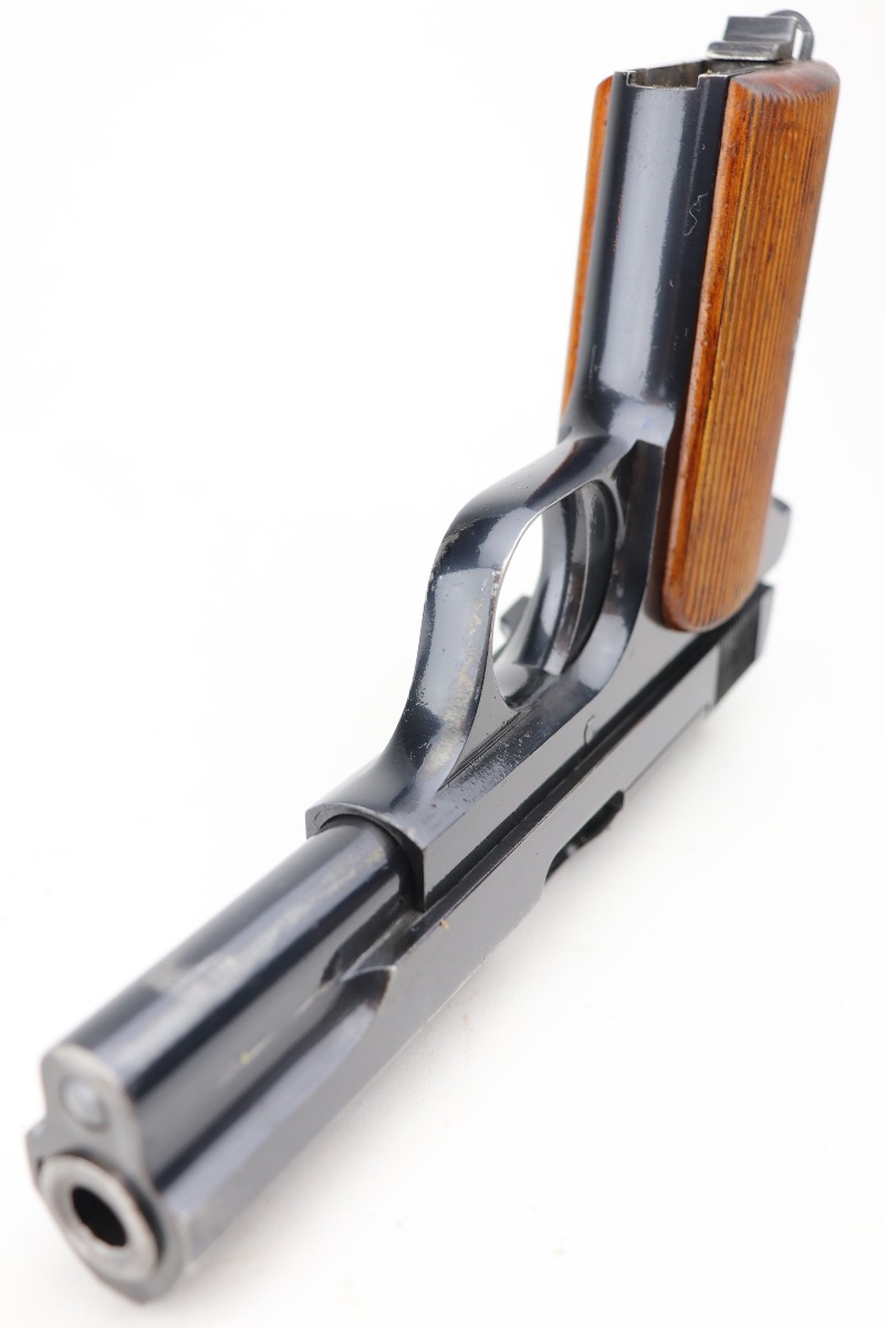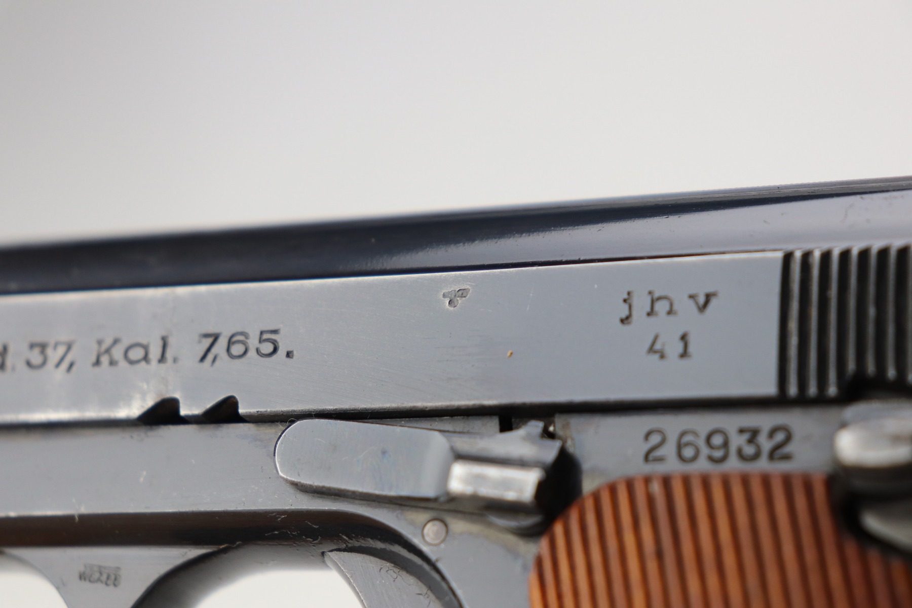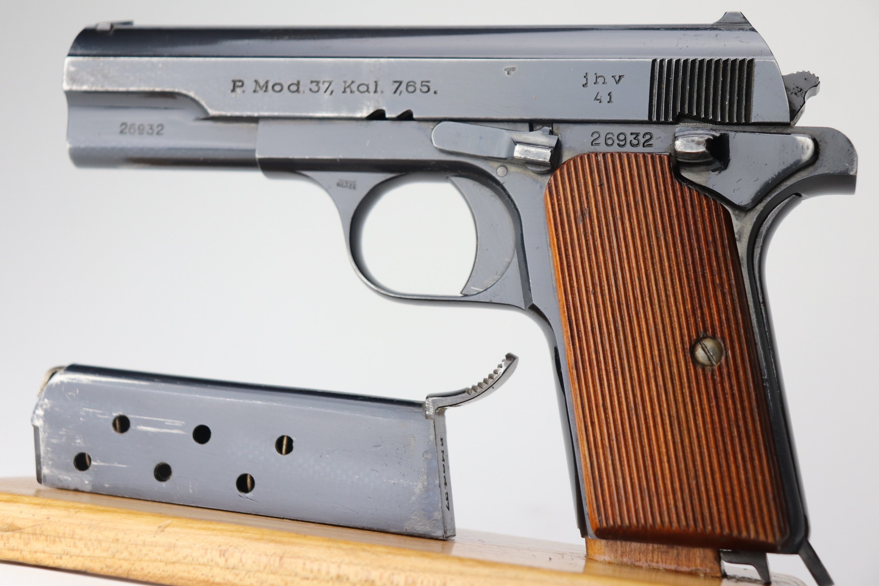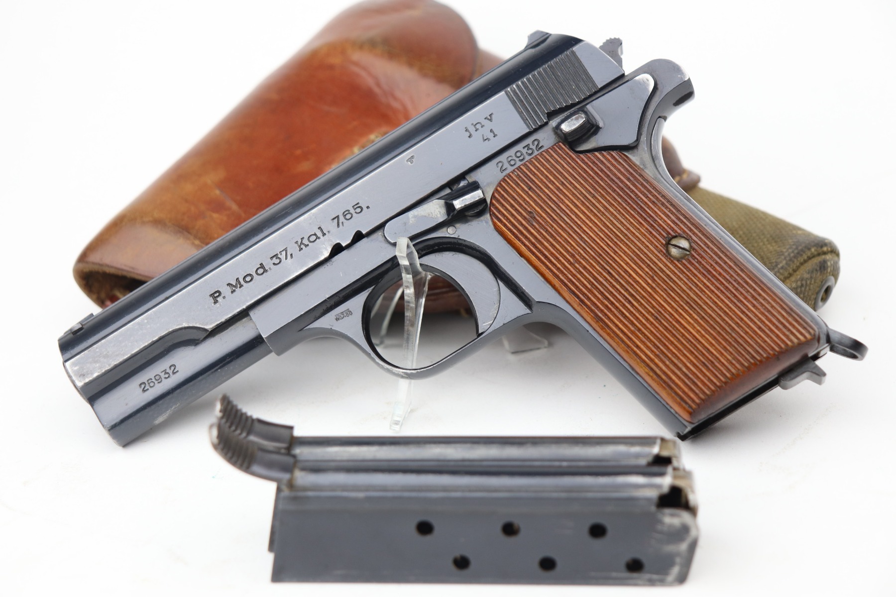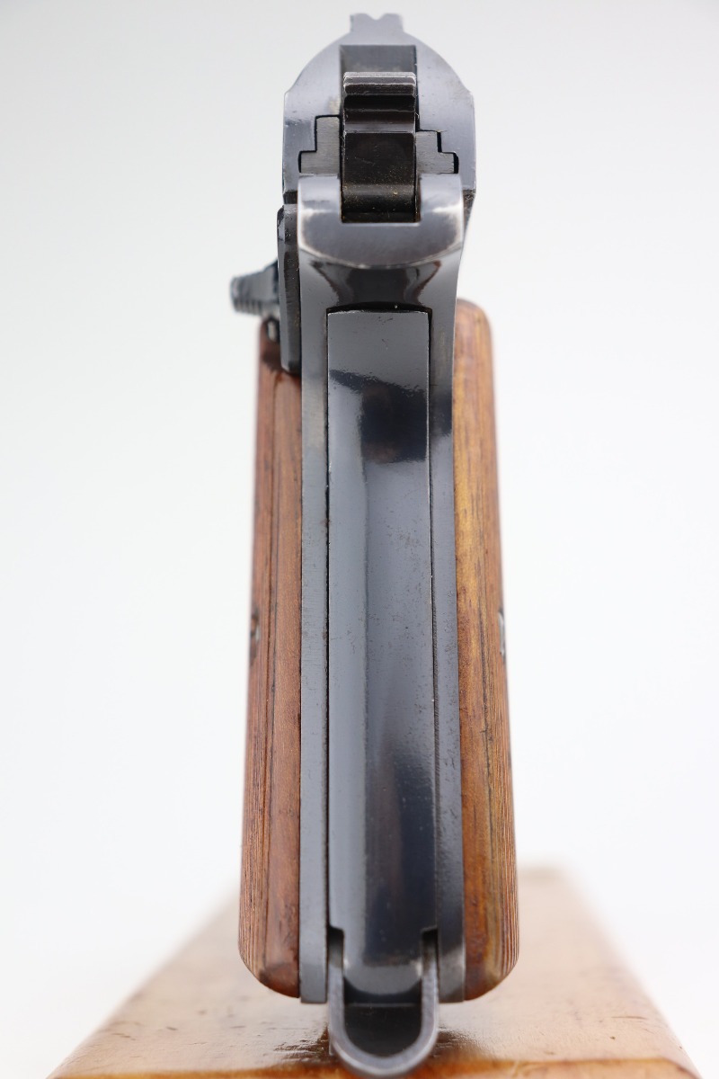 2/25/21 – This is an excellent example of a Femaru M37 Rig issued to the Luftwaffe in 1941. It comes with a 1941-dated Luftwaffe-marked holster and two matching magazines. It is all matching and has the proper military proofs. It has retained about 94-95% of its original finish. There is minor wear around the high edges and top edges of the slide. One area of wear on the underside of the slide. Excellent original grips. Minty bore.