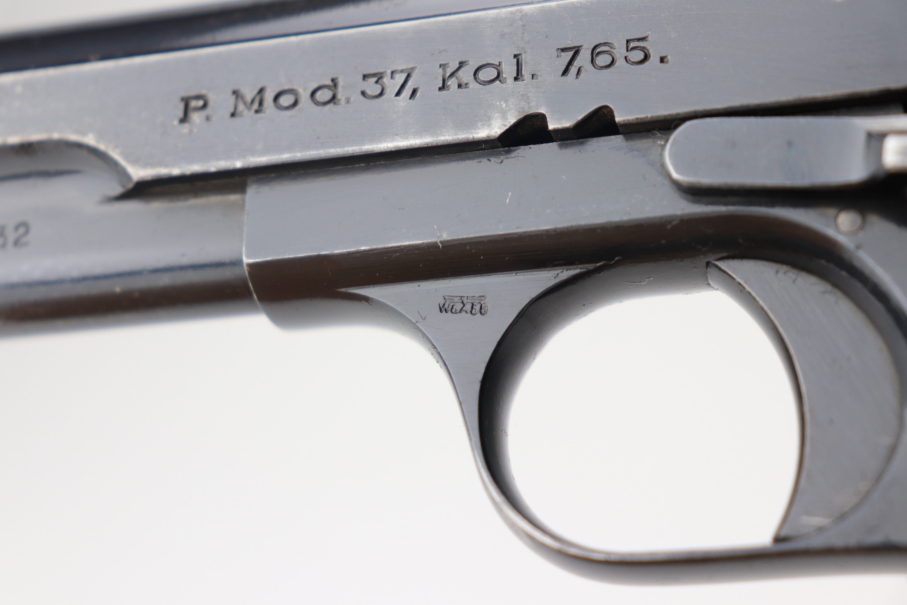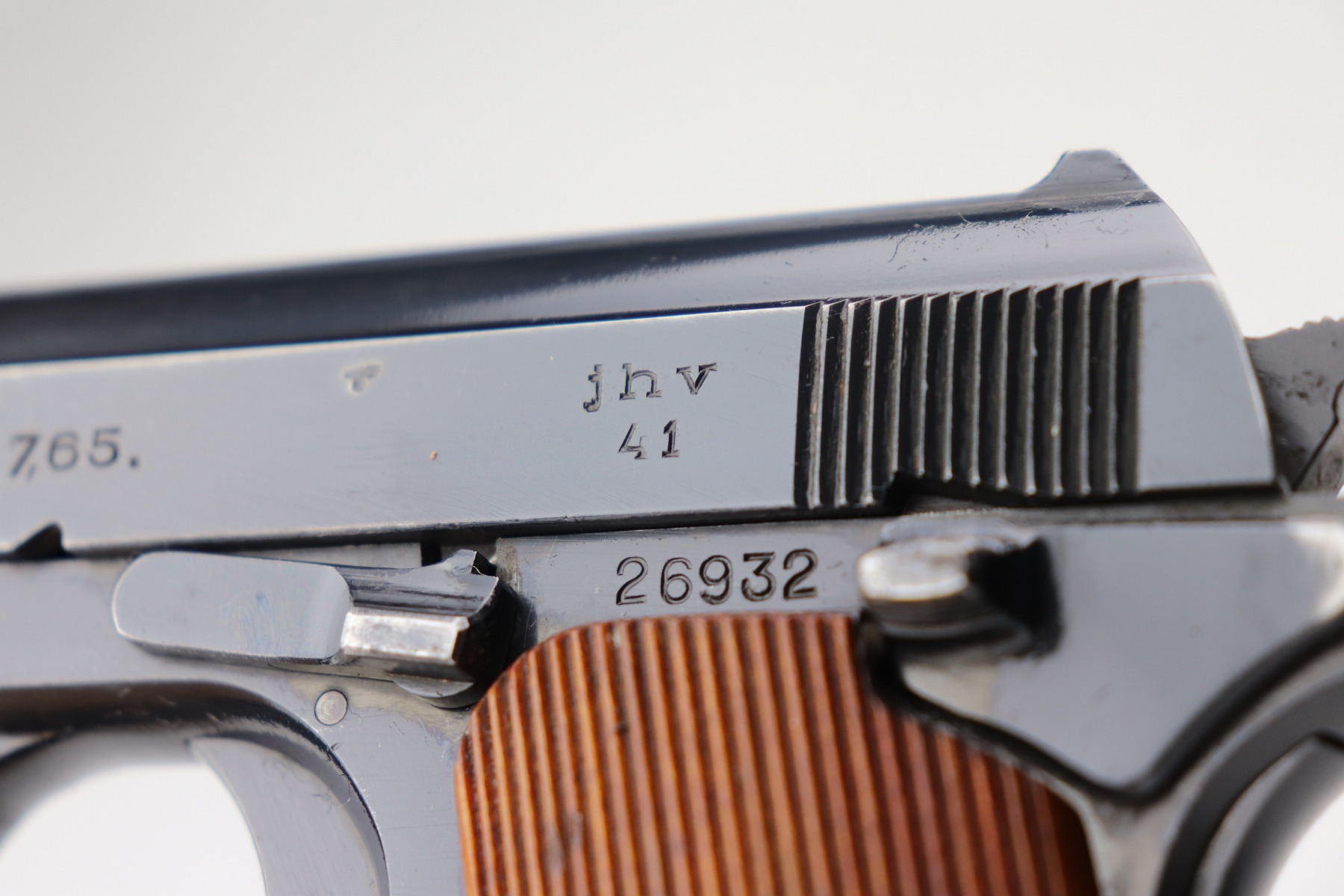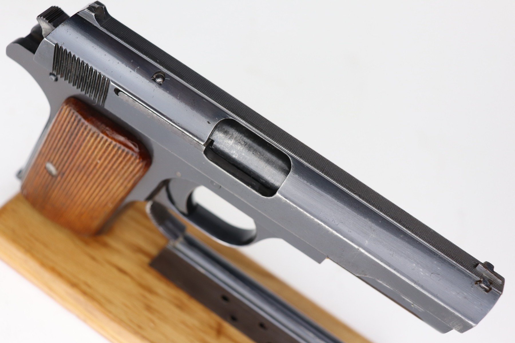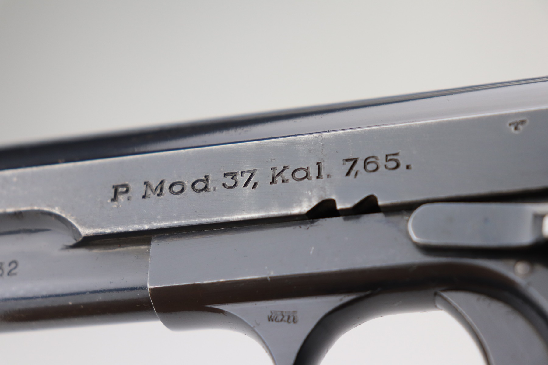 2/25/21 – This is an excellent example of a Femaru M37 Rig issued to the Luftwaffe in 1941. It comes with a 1941-dated Luftwaffe-marked holster and two matching magazines. It is all matching and has the proper military proofs. It has retained about 94-95% of its original finish. There is minor wear around the high edges and top edges of the slide. One area of wear on the underside of the slide. Excellent original grips. Minty bore.