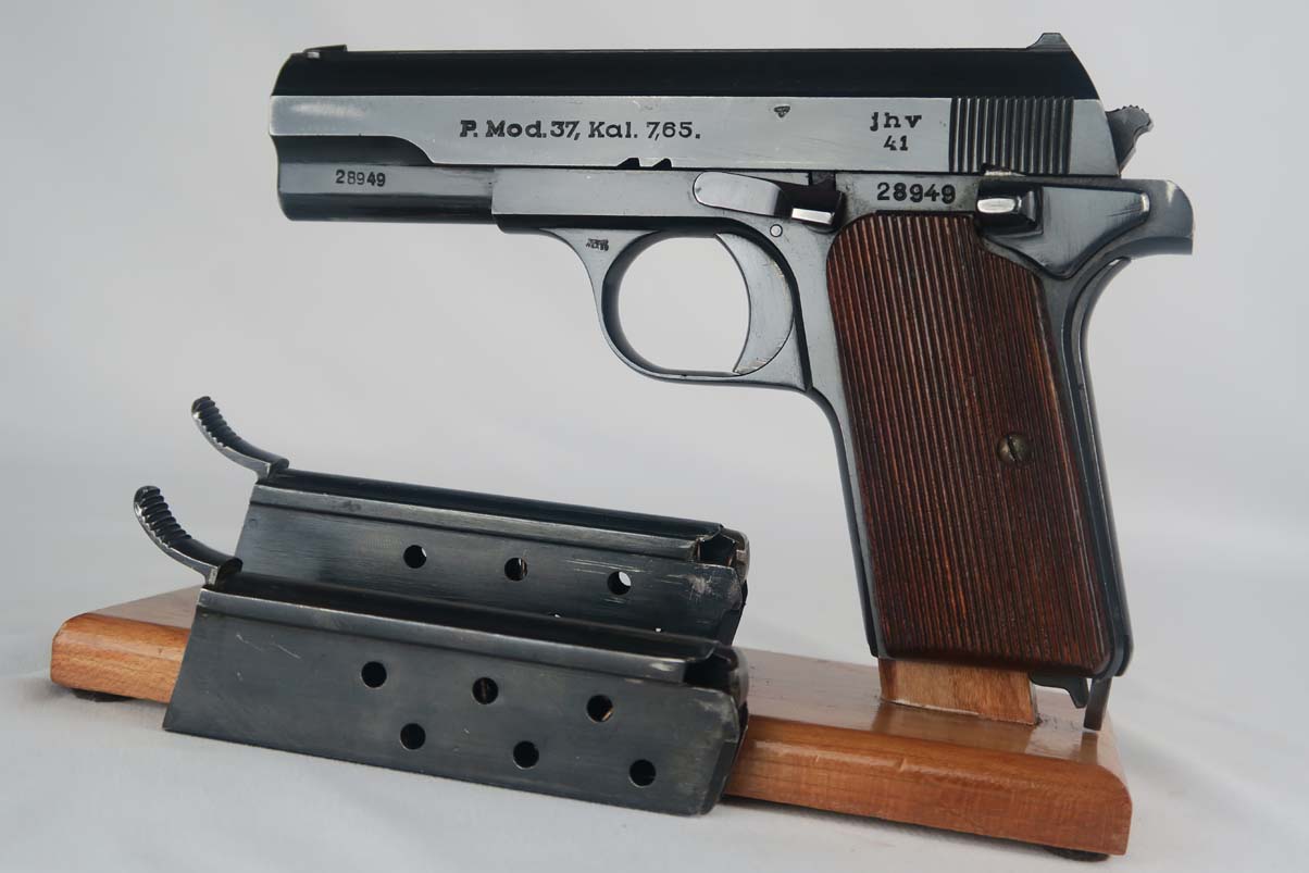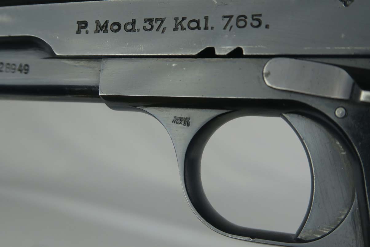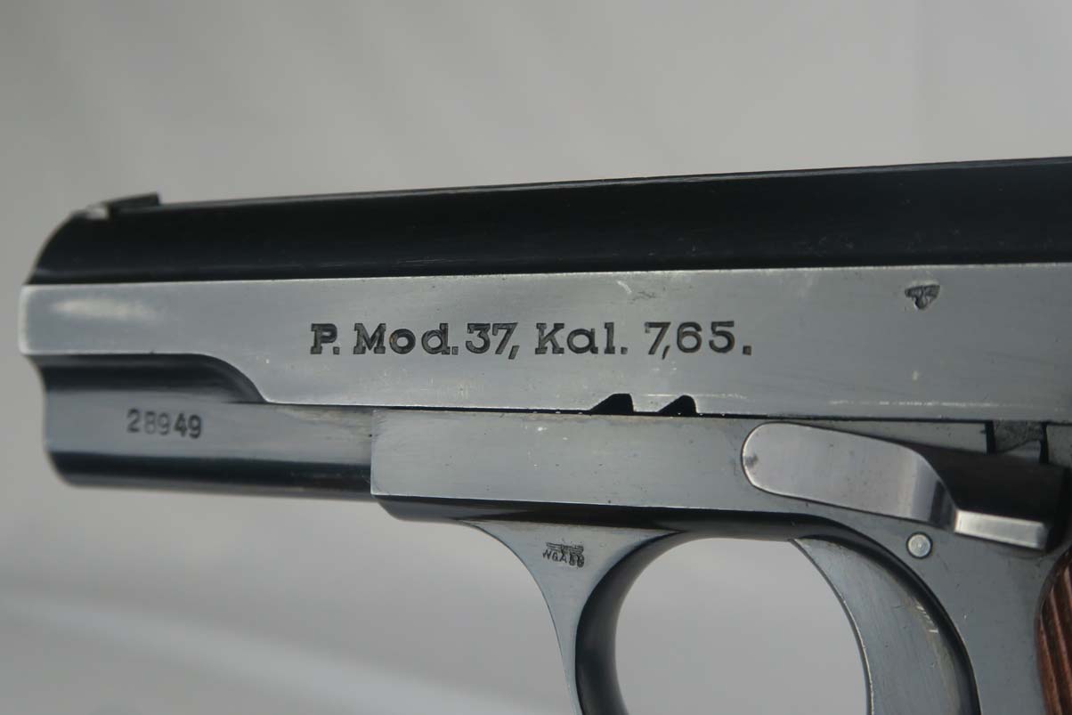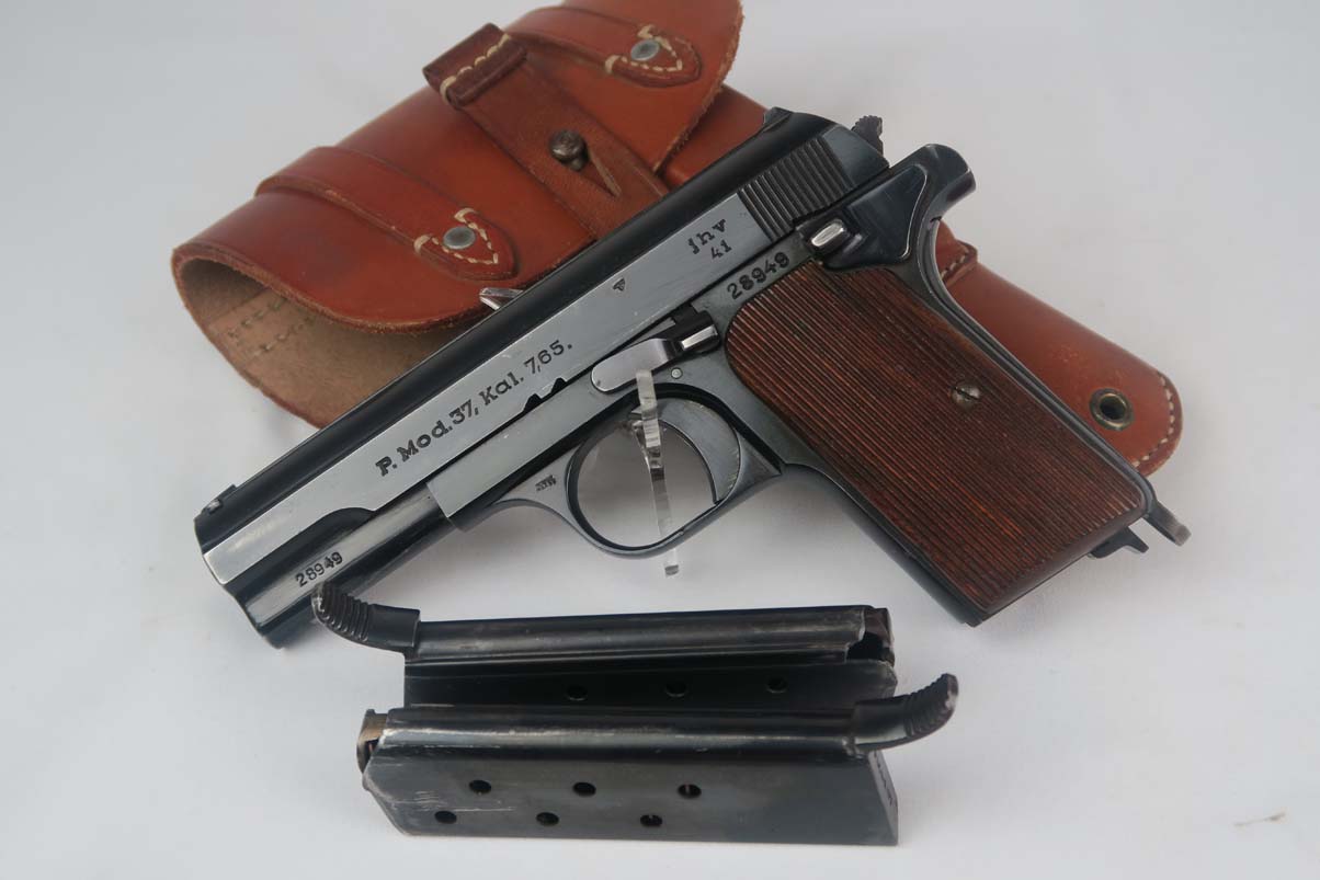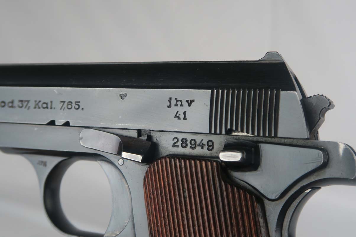 7/24/17 – This is a 1941 Femaru mod 37 rig with two matching magazines. It is a Nazi-issued pistol with jhv 41 proof on the slide and WaA89 proof on the trigger guard. The original finish rates at about 95% with a few minor spots of wear on both the slide and frame. The holster included in this listing is near-mint, with 1942 date and maker mark on the back, as well as the Eagle/21 proof. It also has a proper inkstamp on the interior. Minty bore.