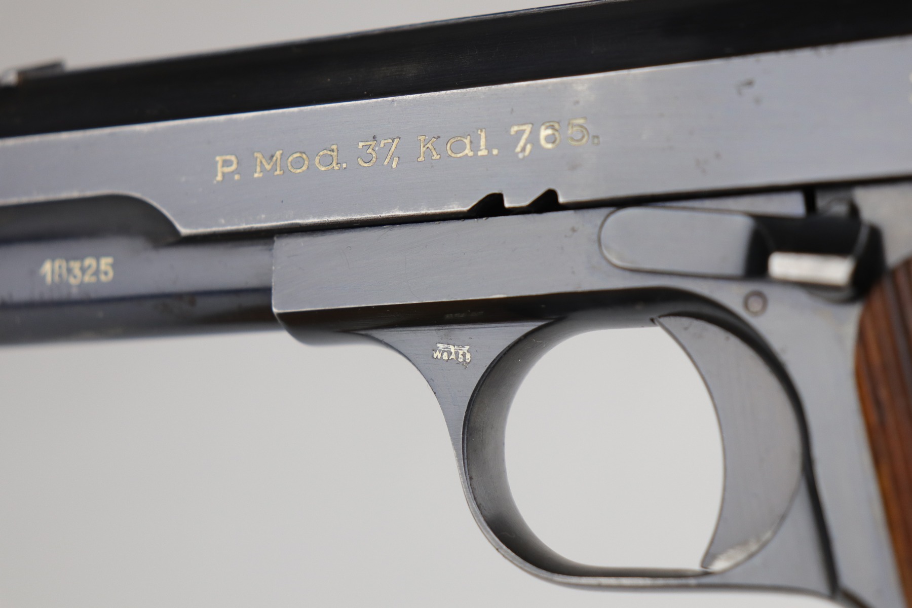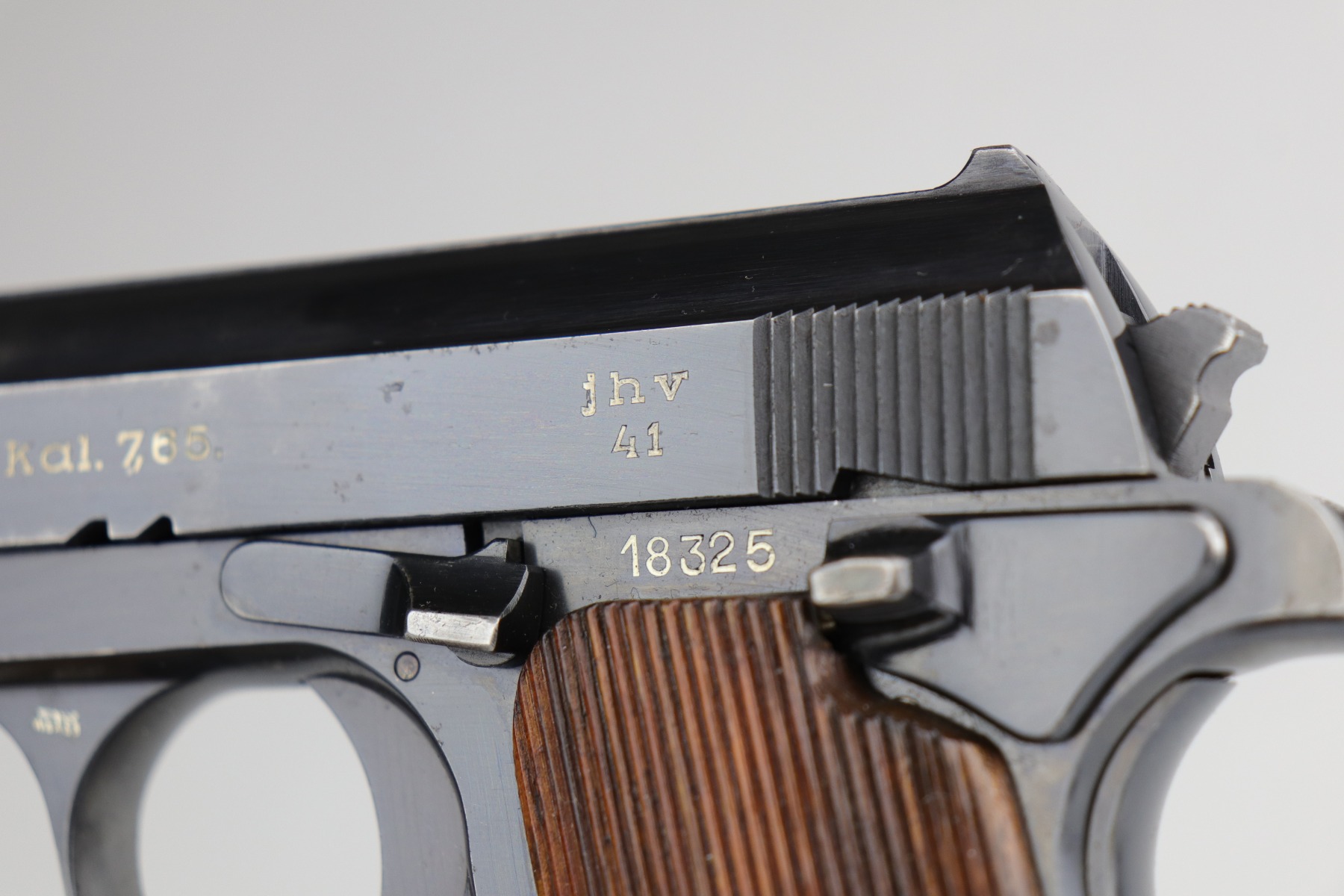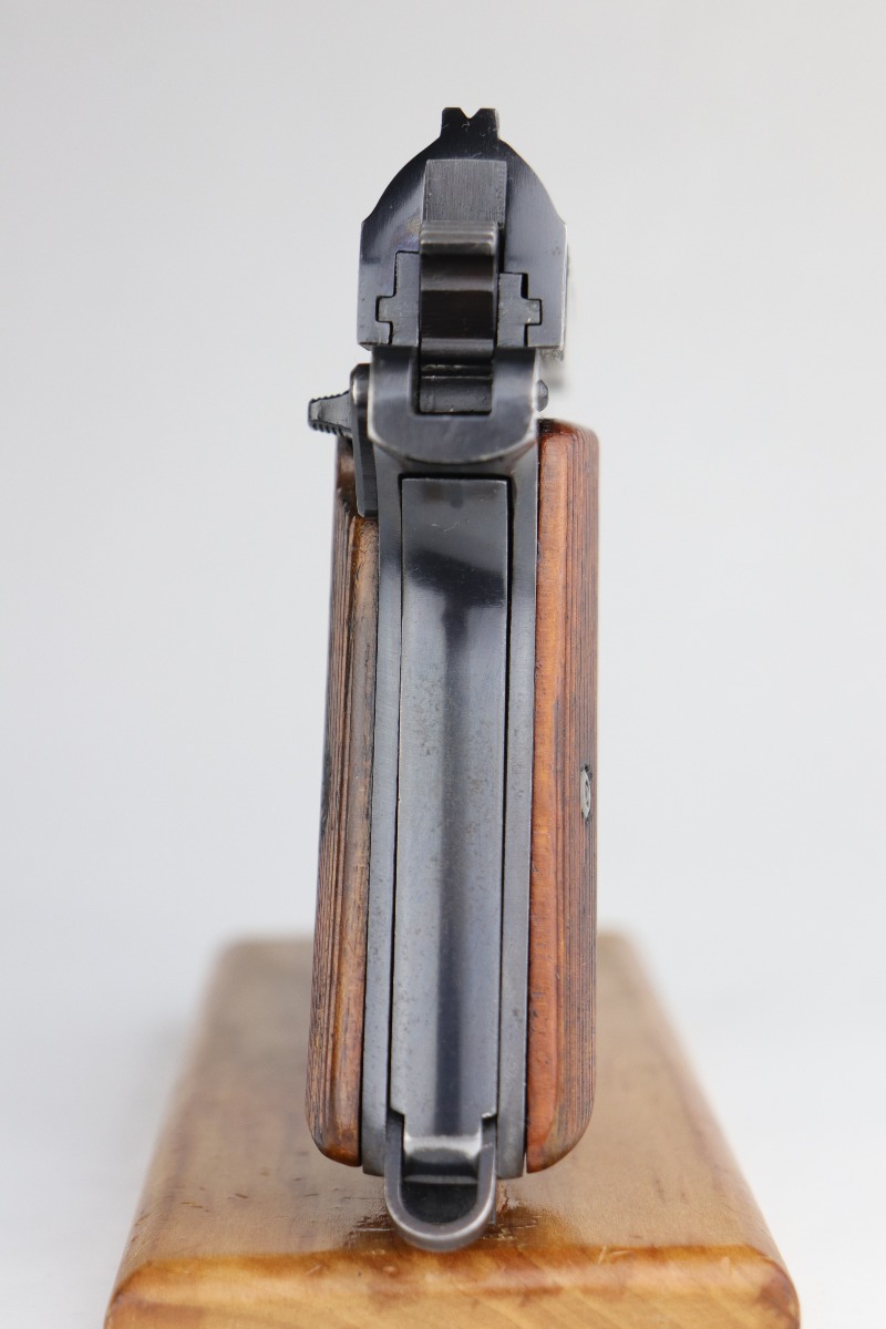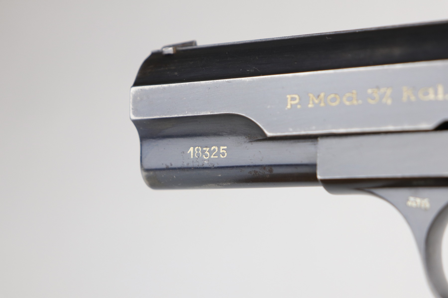 5/21/20 – This is an all matching and original Nazi Femaru Model 37 from 1941 with one original, matching magazine. The gun has retained about 95-96% of its original high-polish finish. Most of the wear is on the front strap. There very light pin-pricking on the straps. There is very minor high edge wear on the slide. There are also just a couple of very small areas of thinning on the slide. Excellent grips and minty bore.