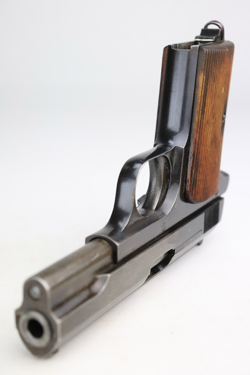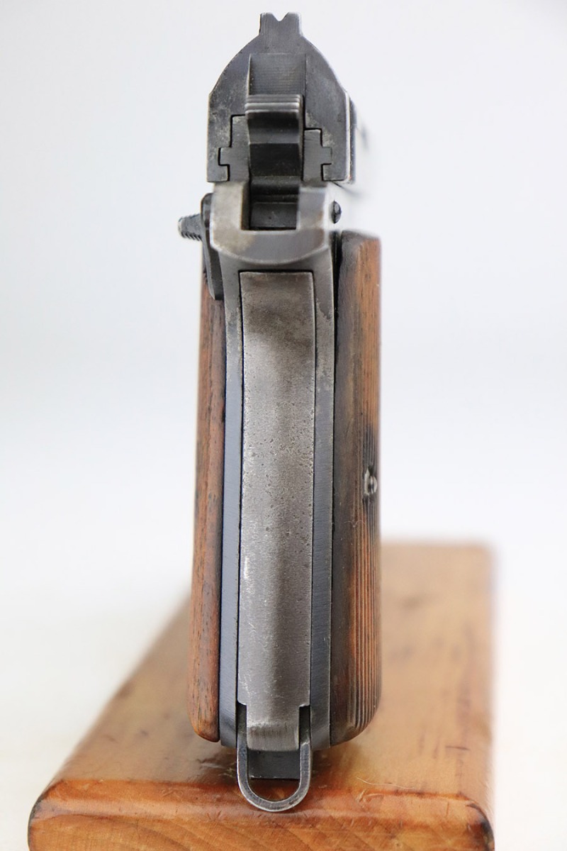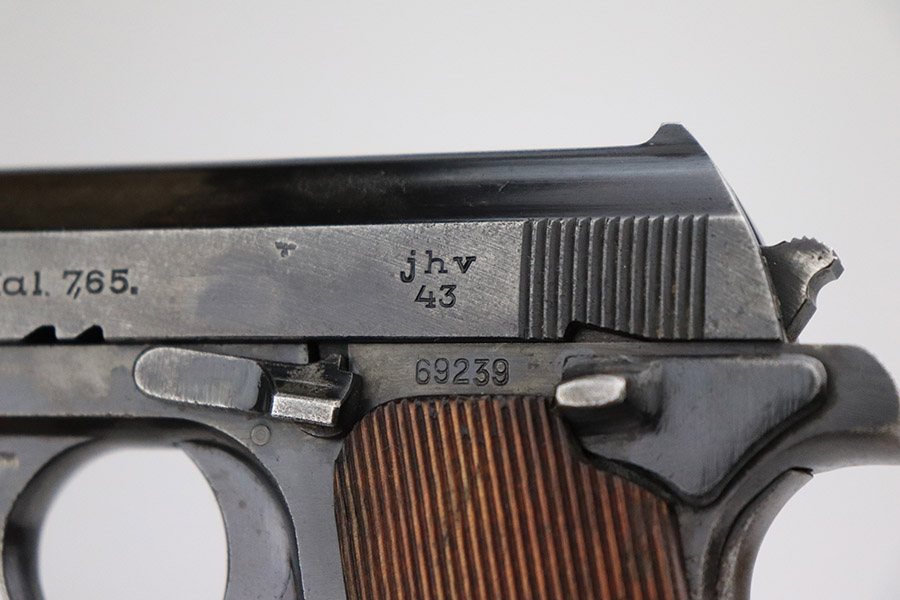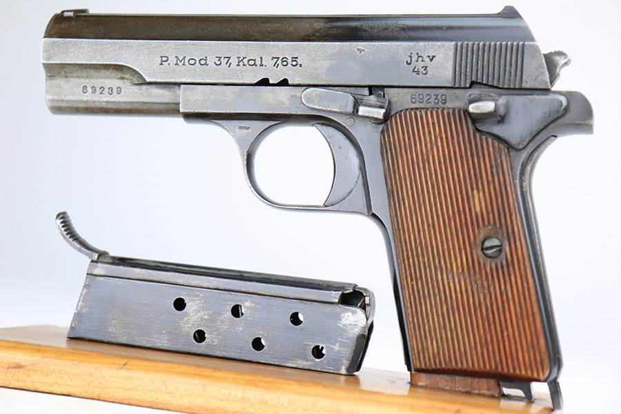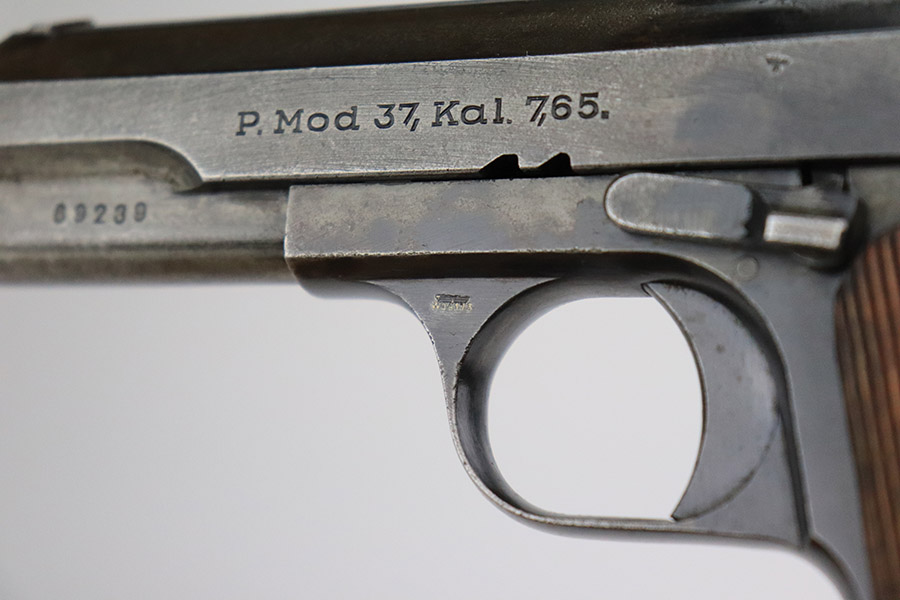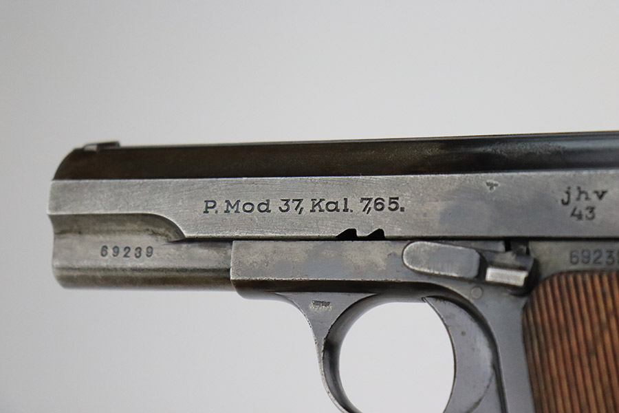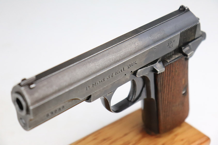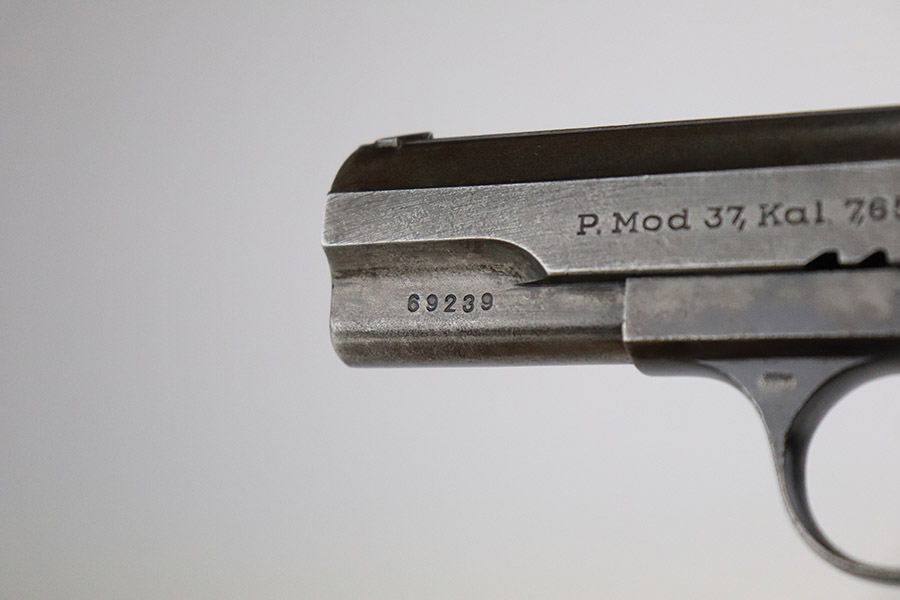 11/8/22 – This is a Hungarian Femaru Model 37 issued to the Luftwaffe in 1943. It is all matching and has the proper waffen military acceptance proof on the left side of the trigger guard. This one also comes with one original matching-numbered magazine. Unfortunately, it has lost the majority of its original finish with obvious wear and minor pitting on the front half of the slide (both sides) and on the back strap. Comes with nice period-correct wood grips – minor bruising on the left side. Very nice bore with strong rifling and some tiny pits here and there in the grooves.