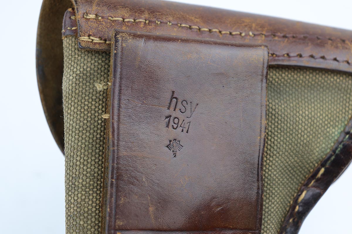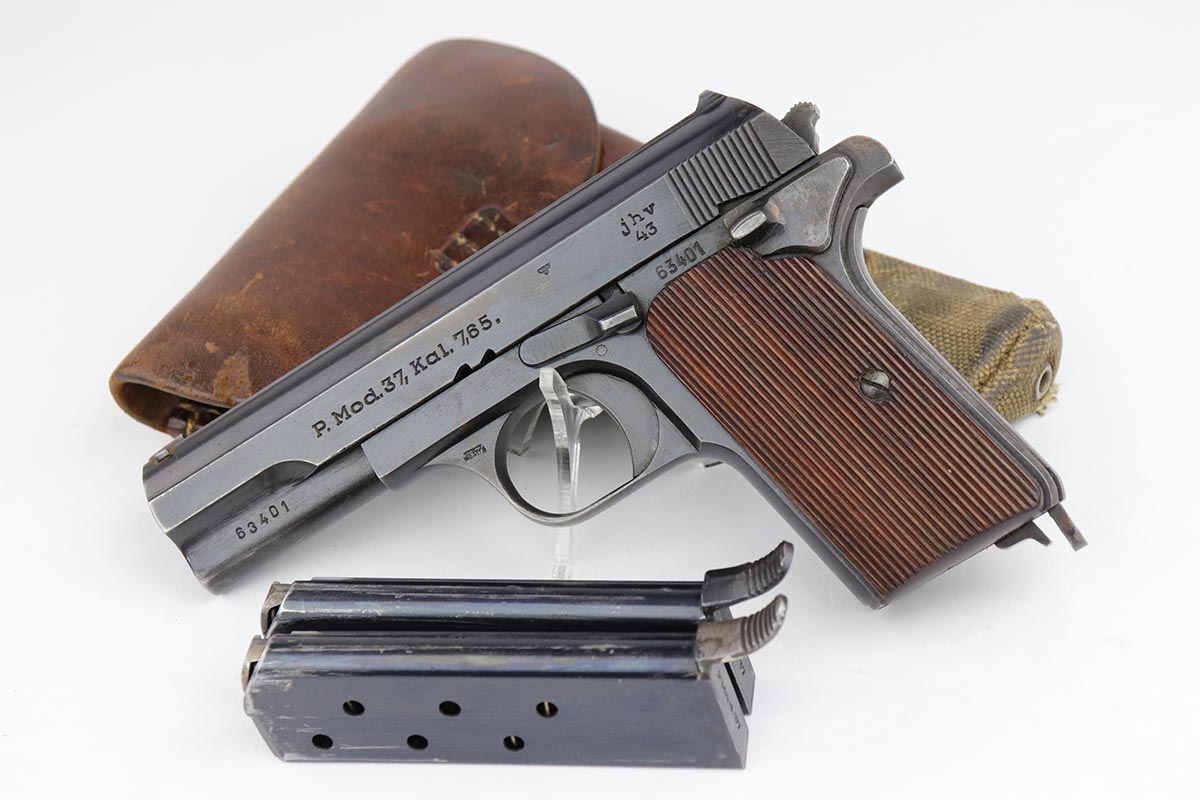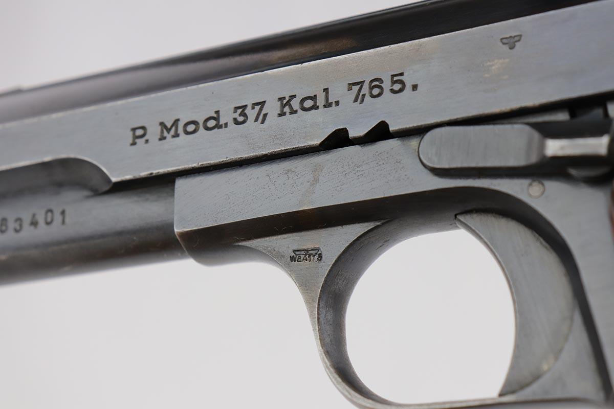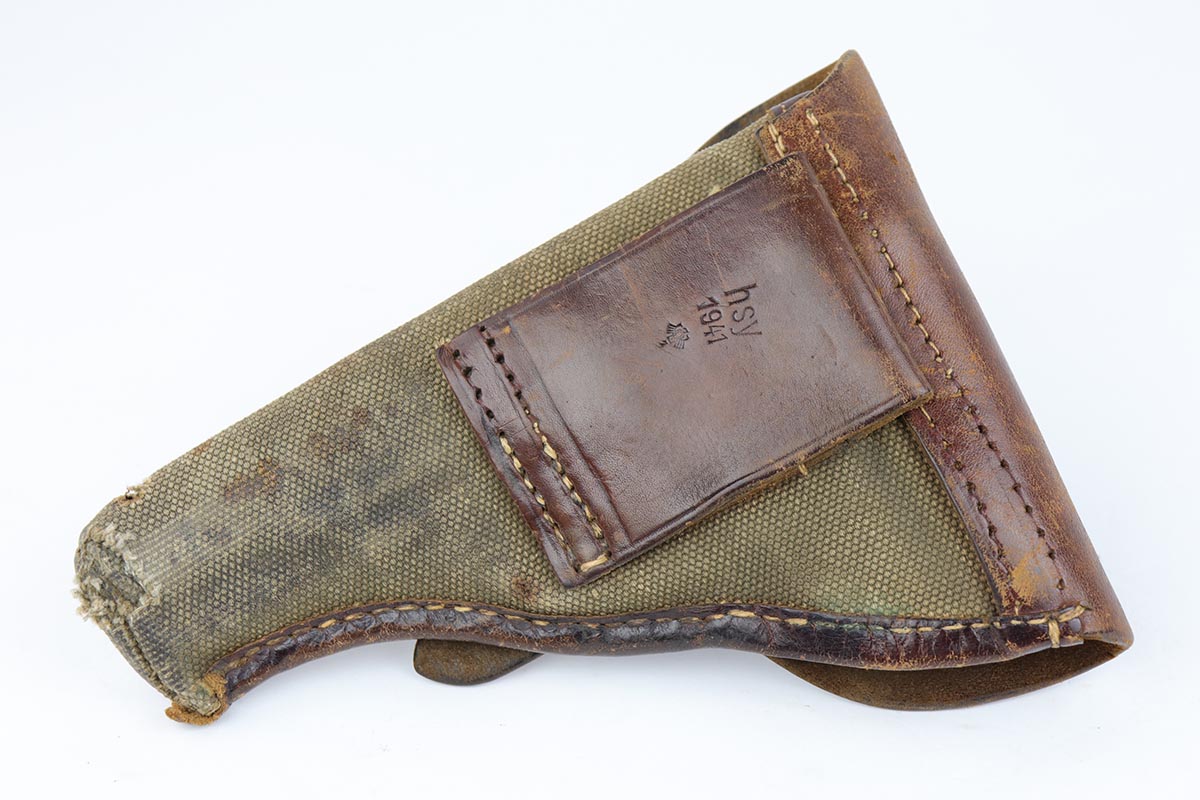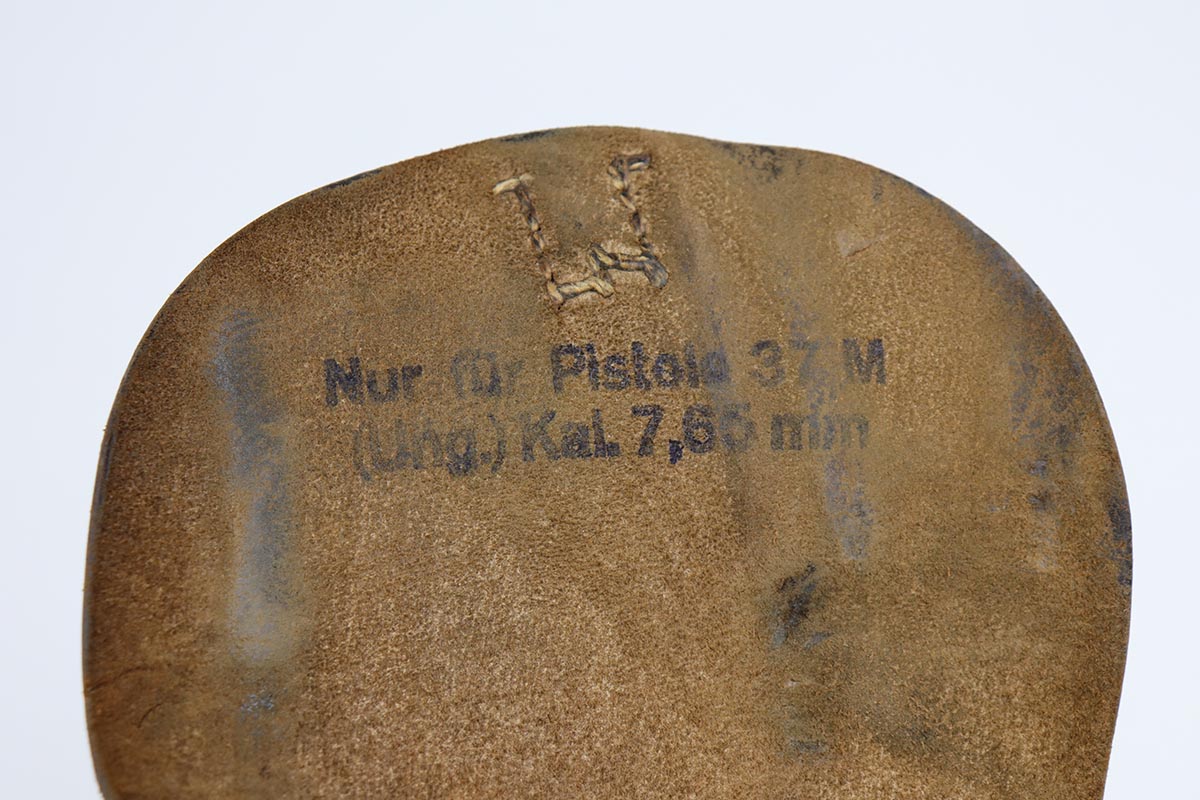8/6/19 – This is a complete and original Femaru Model 37 rig that was manufactured in 1943 and issued to the German Army. The pistol retains one of the original matching magazines, and the spare is only six digits off! The gun itself has about 80-85% of the original bluing, as it has a nice profile view but the grip safety and front strap show notable thinning/browning. Excellent bore and grips. The rig is completed by a scarce canvas style holster, with ‘hsy’ maker mark and 1941 date over top of sharp waffenamt. It also has a fairly sharp internal inkstamp. The holster does show notable age and wear, with a small hole near the toe and some missing stitches in the top flap.