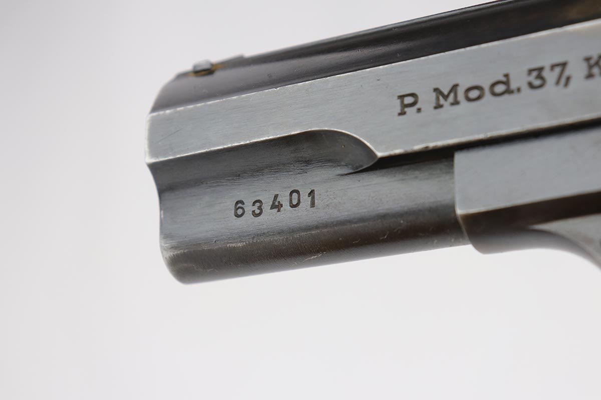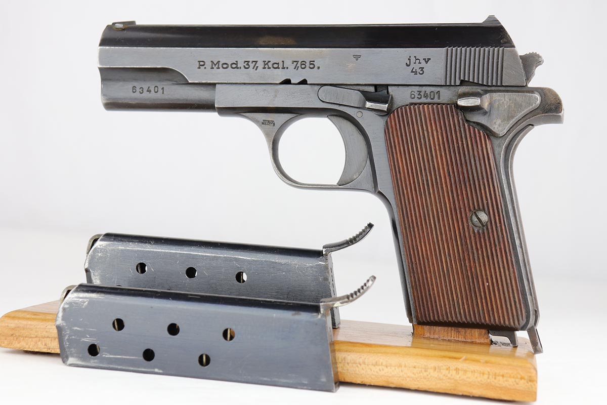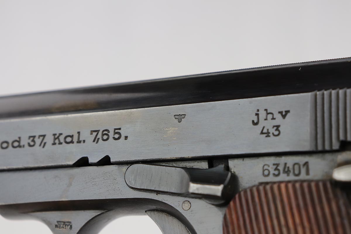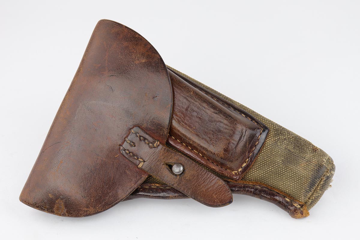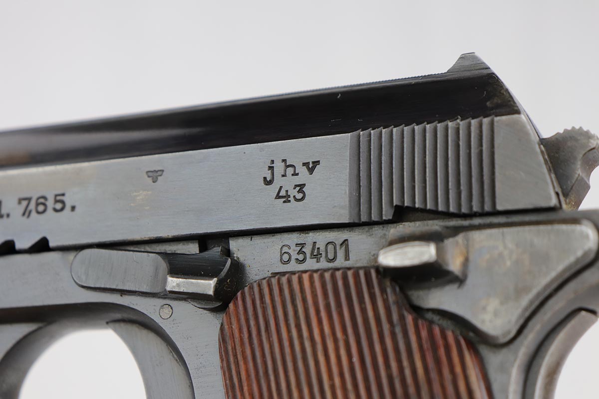 8/6/19 – This is a complete and original Femaru Model 37 rig that was manufactured in 1943 and issued to the German Army. The pistol retains one of the original matching magazines, and the spare is only six digits off! The gun itself has about 80-85% of the original bluing, as it has a nice profile view but the grip safety and front strap show notable thinning/browning. Excellent bore and grips. The rig is completed by a scarce canvas style holster, with ‘hsy’ maker mark and 1941 date over top of sharp waffenamt. It also has a fairly sharp internal inkstamp. The holster does show notable age and wear, with a small hole near the toe and some missing stitches in the top flap.