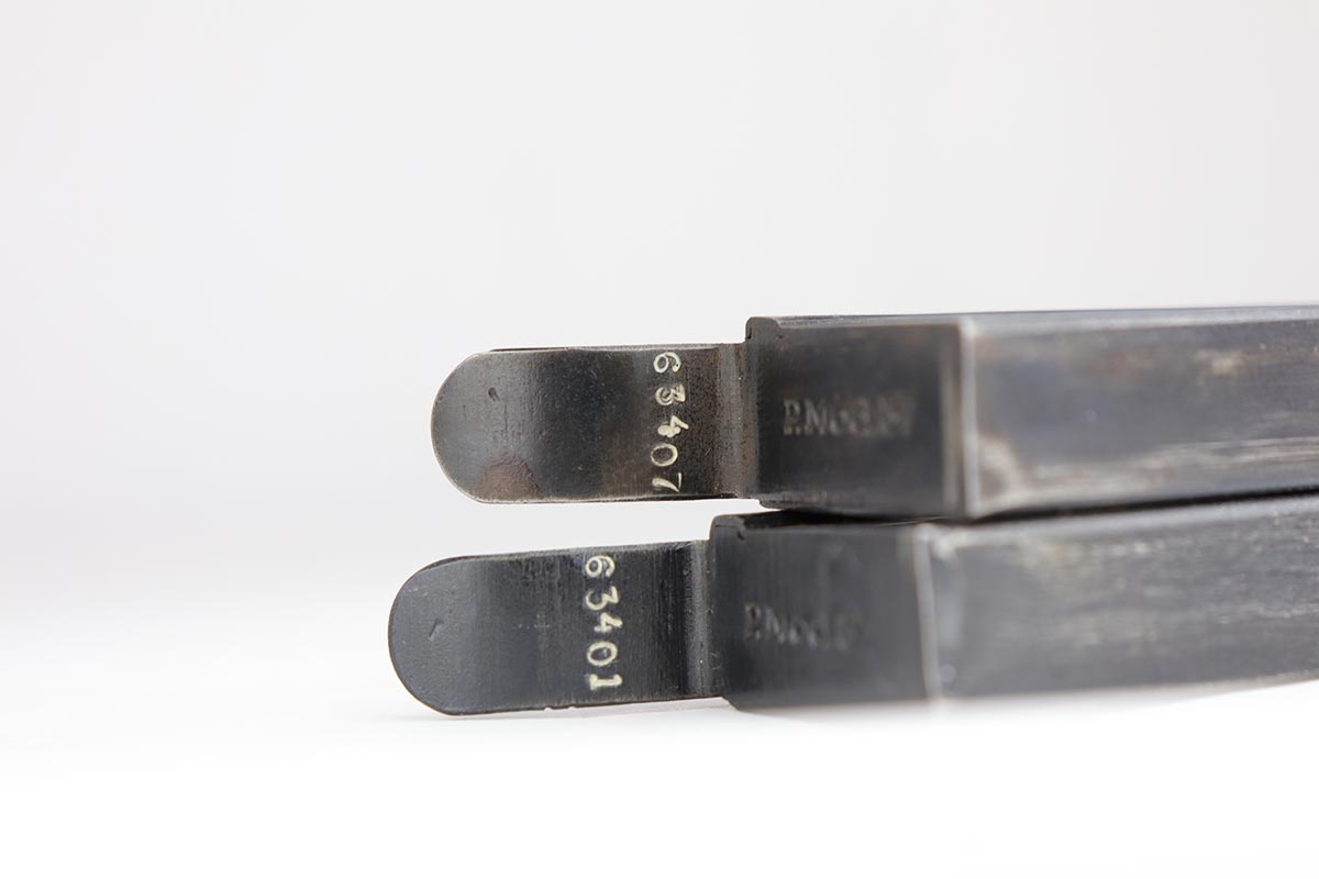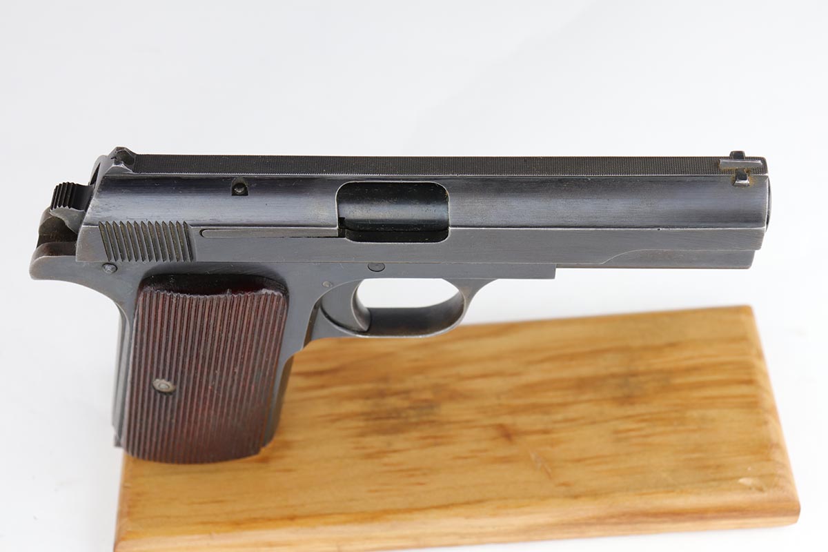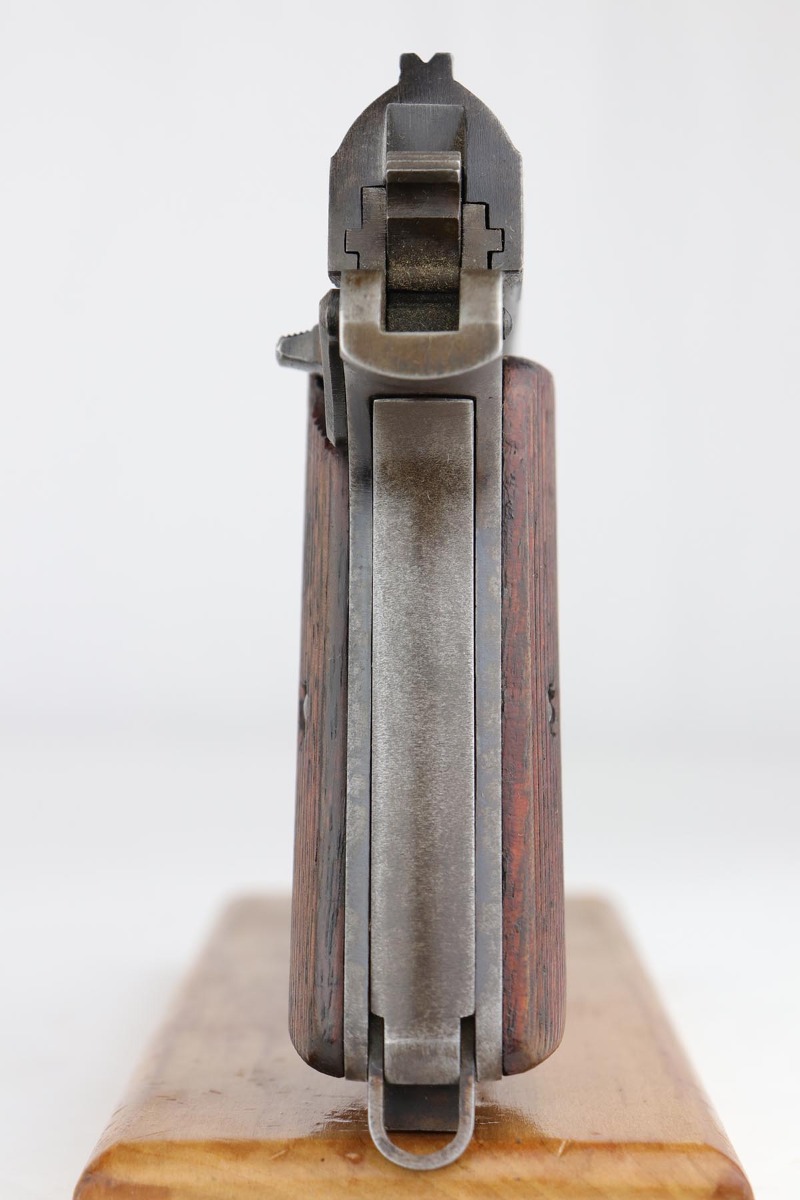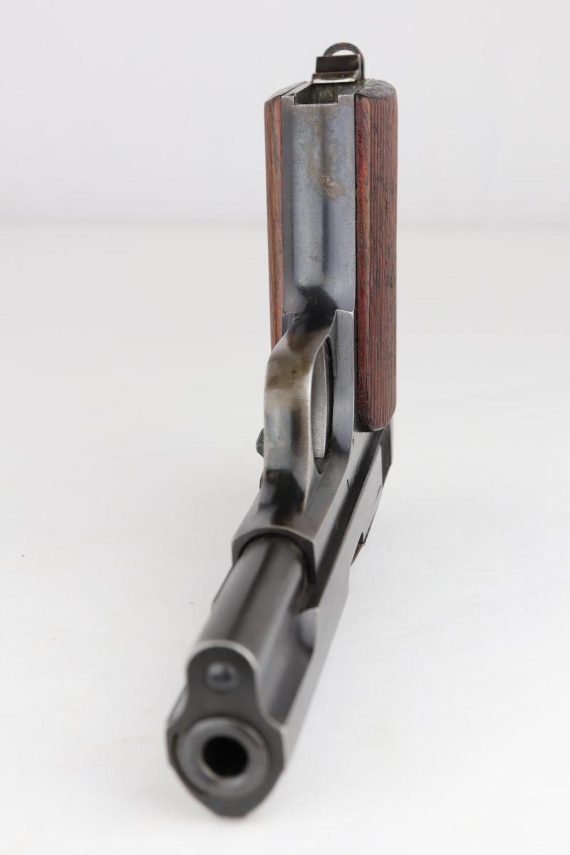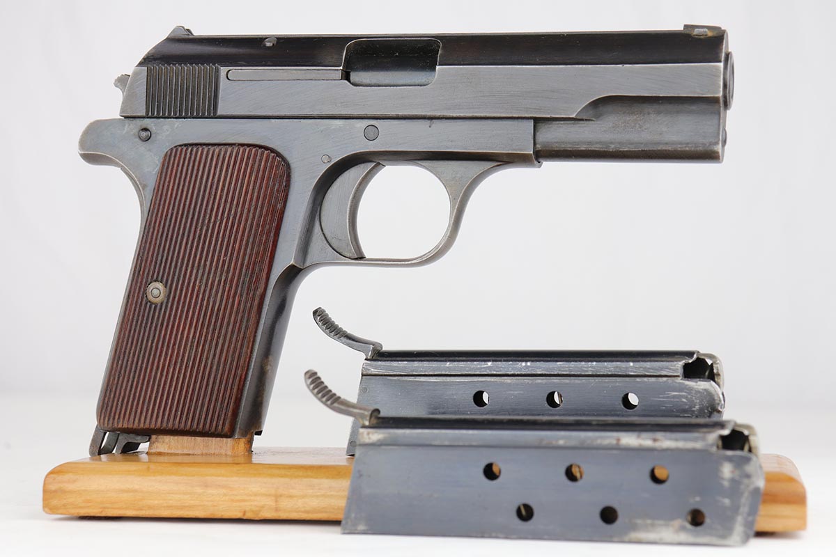 8/6/19 – This is a complete and original Femaru Model 37 rig that was manufactured in 1943 and issued to the German Army. The pistol retains one of the original matching magazines, and the spare is only six digits off! The gun itself has about 80-85% of the original bluing, as it has a nice profile view but the grip safety and front strap show notable thinning/browning. Excellent bore and grips. The rig is completed by a scarce canvas style holster, with ‘hsy’ maker mark and 1941 date over top of sharp waffenamt. It also has a fairly sharp internal inkstamp. The holster does show notable age and wear, with a small hole near the toe and some missing stitches in the top flap.