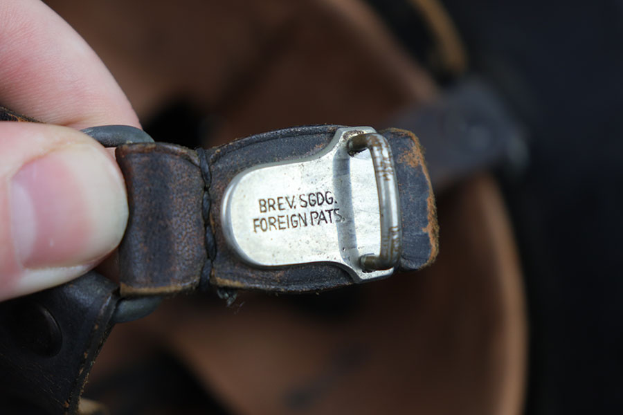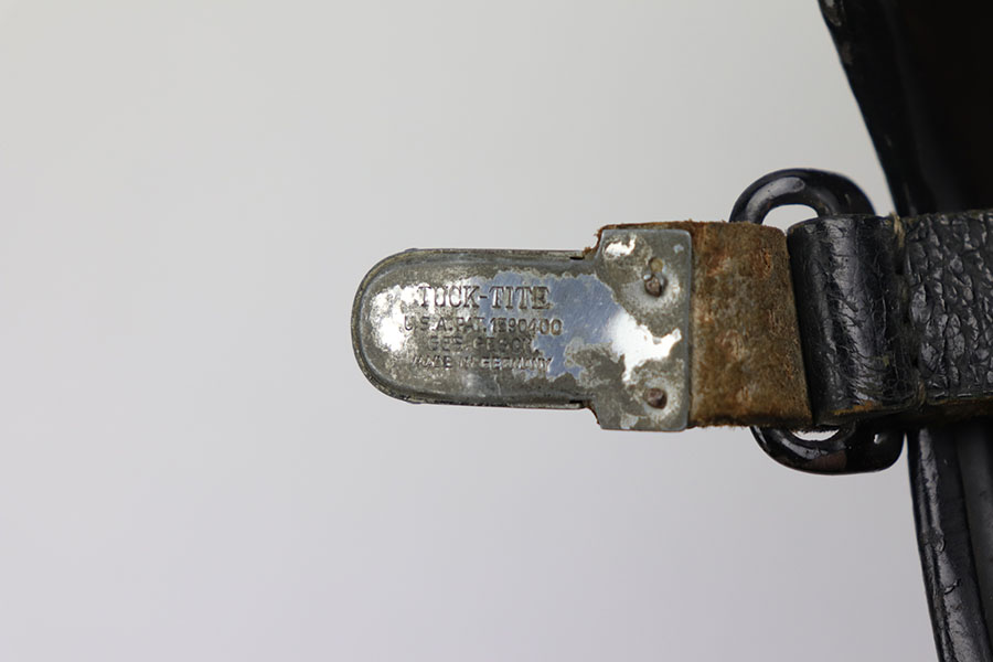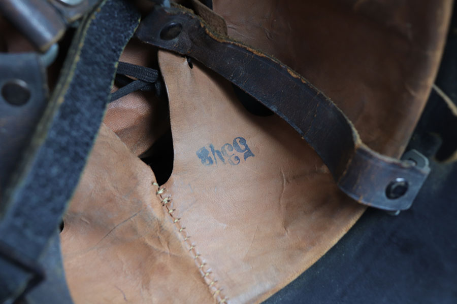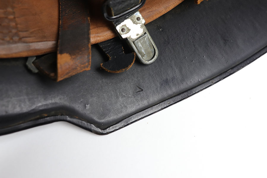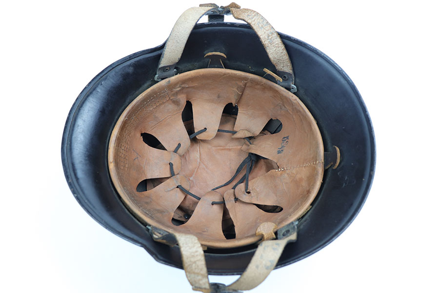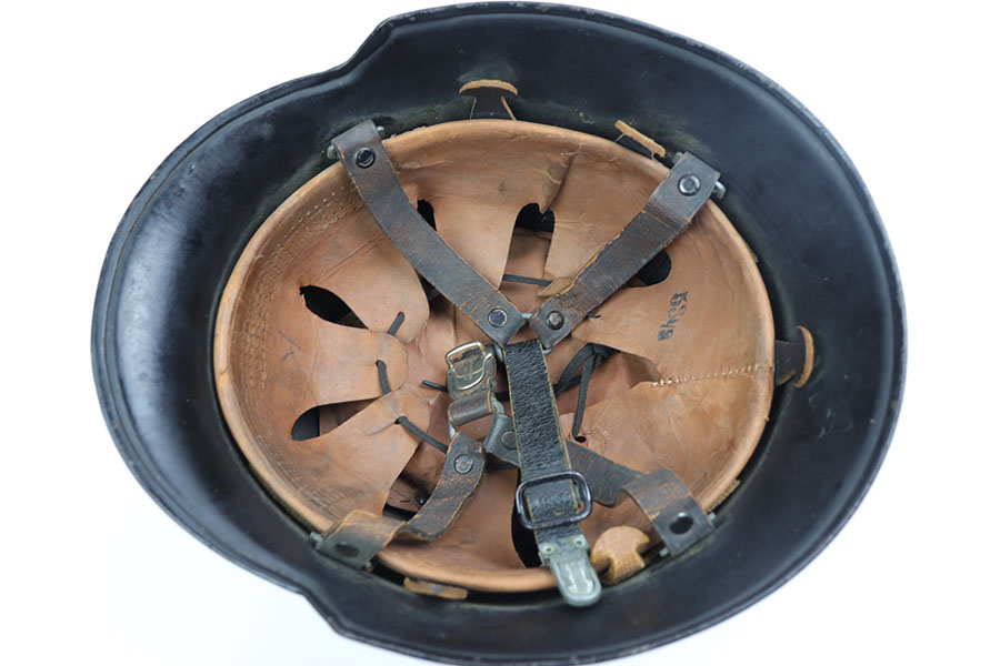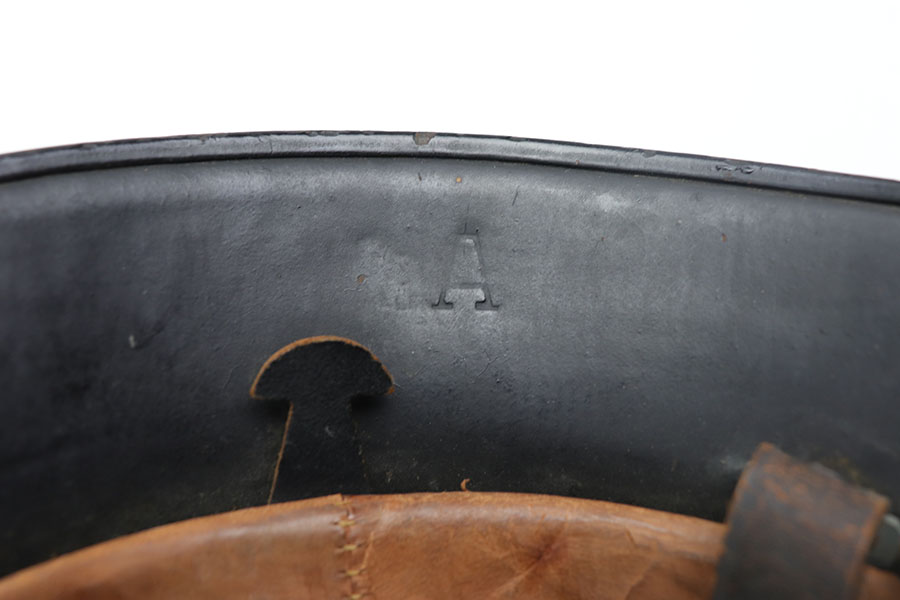 12/9/20 – This is an original WW2 production nazi fire police helmet or FEUERSCHUTZPOLIZEI. The steel helmet has two exterior decals, both of which are excellent with minimal wear. The helmet has no dents, and some light surface wear and paint loss in various spots but no major wear. Original leather liner is still in tact on the interior of the helmet. Leather chin strap is in tact as well and in great condition.