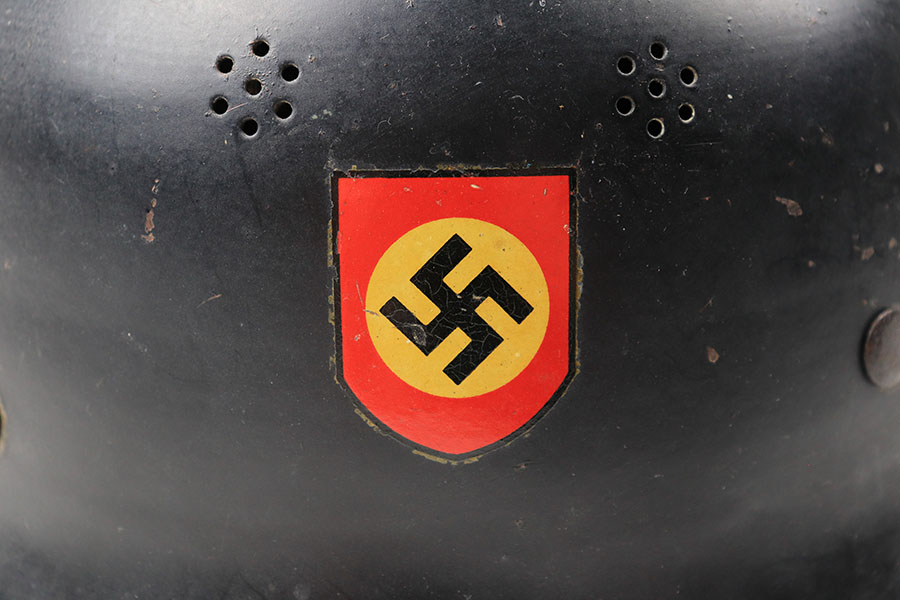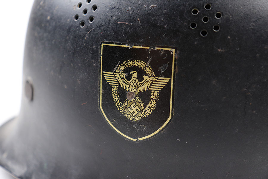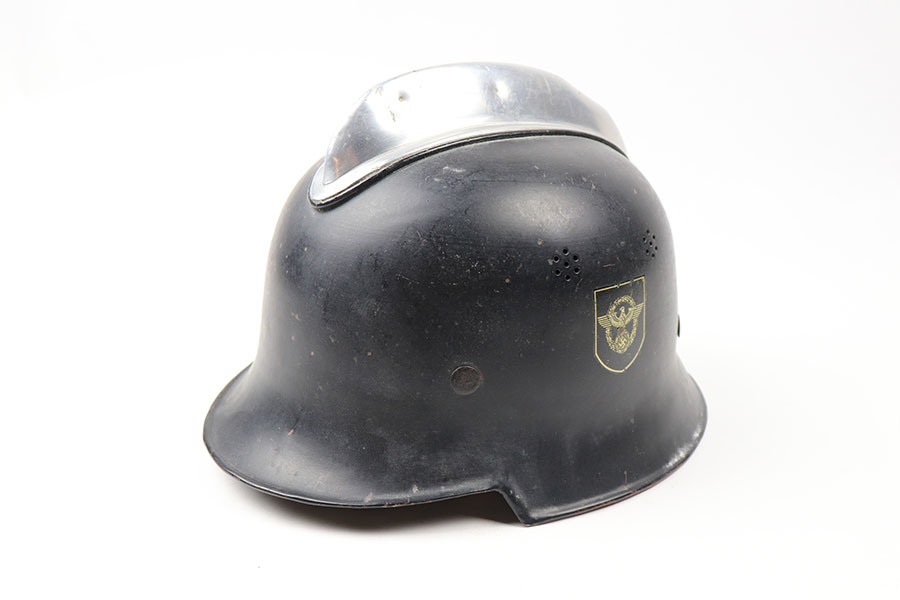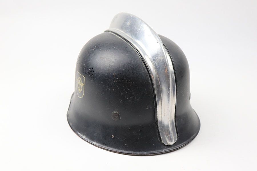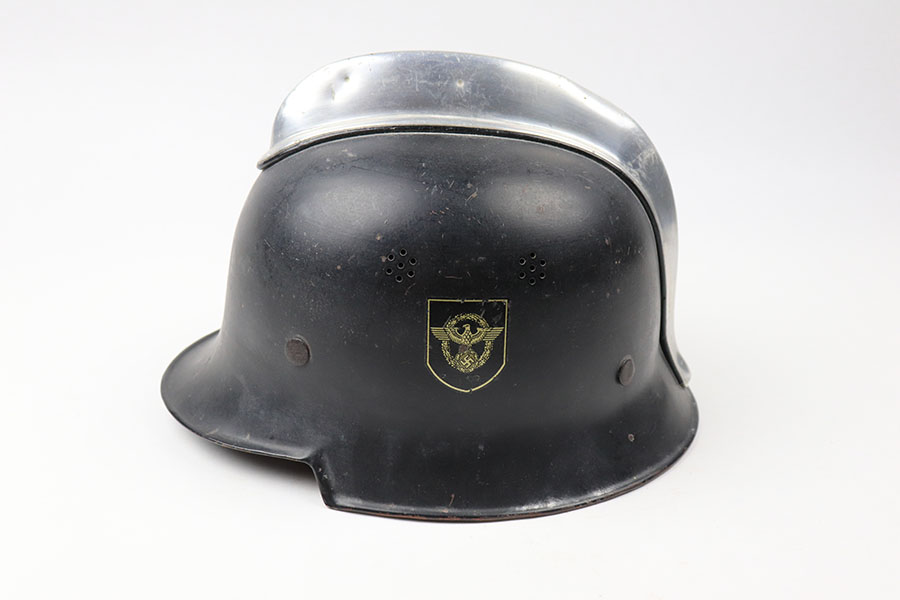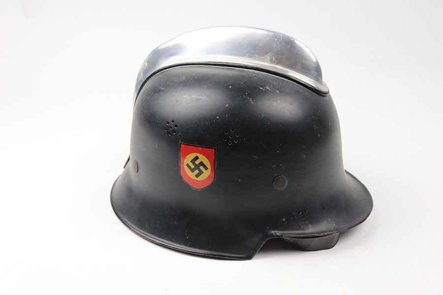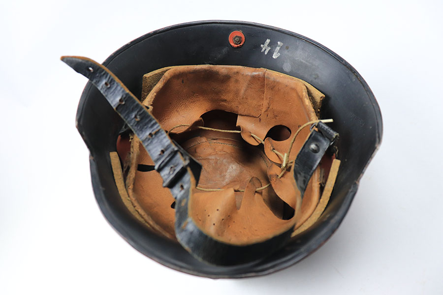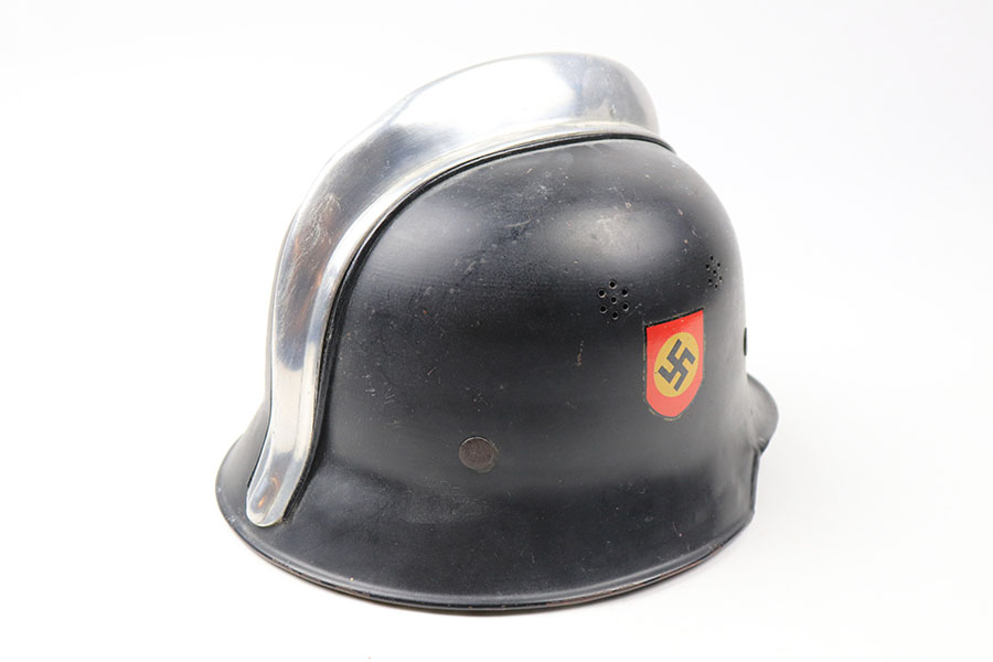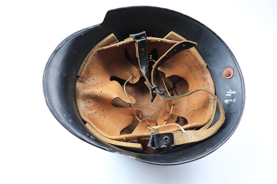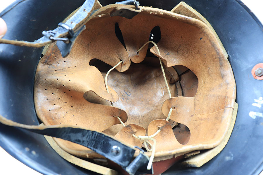 8/13/21 – This is an original WW2 Nazi Fire Police helmet with comb. The helmet has minimal paint loss and no major dents in the shell. The comb has a few small dents and imperfections, and there are exterior scuffs throughout the exterior of the helmet. Both logos are in great condition. The interior leather liner has very nice leather with some surface wear and aging throughout. Chin strap has surface cracking but is still in tact. Interior shell is stamped “Edelstahl”.