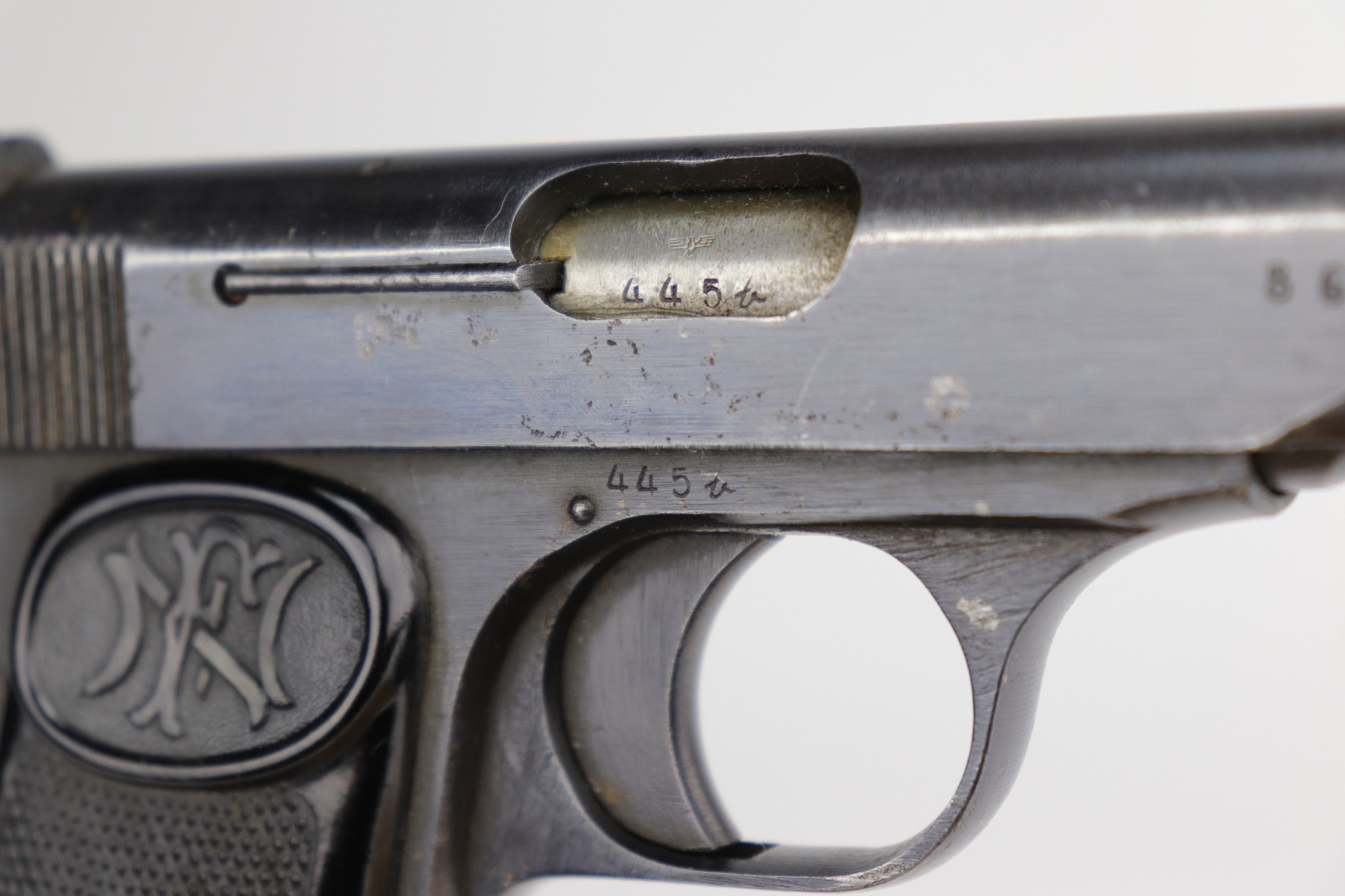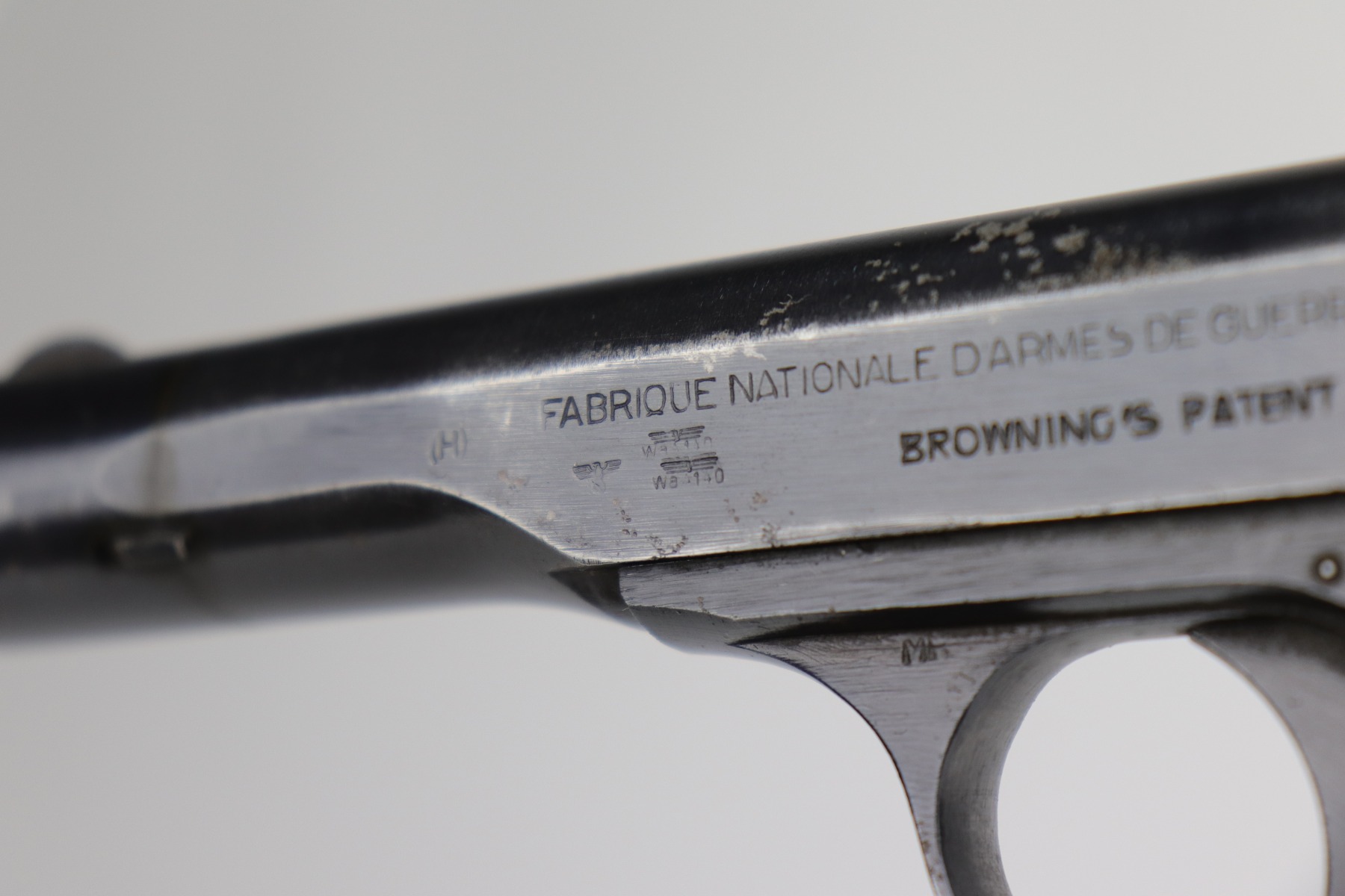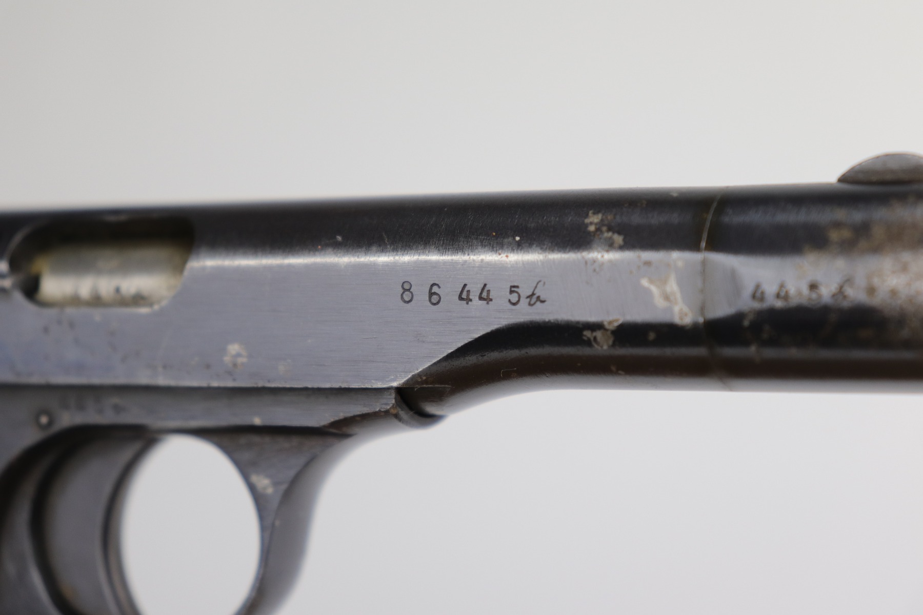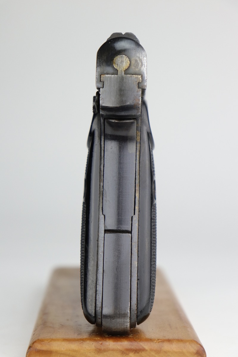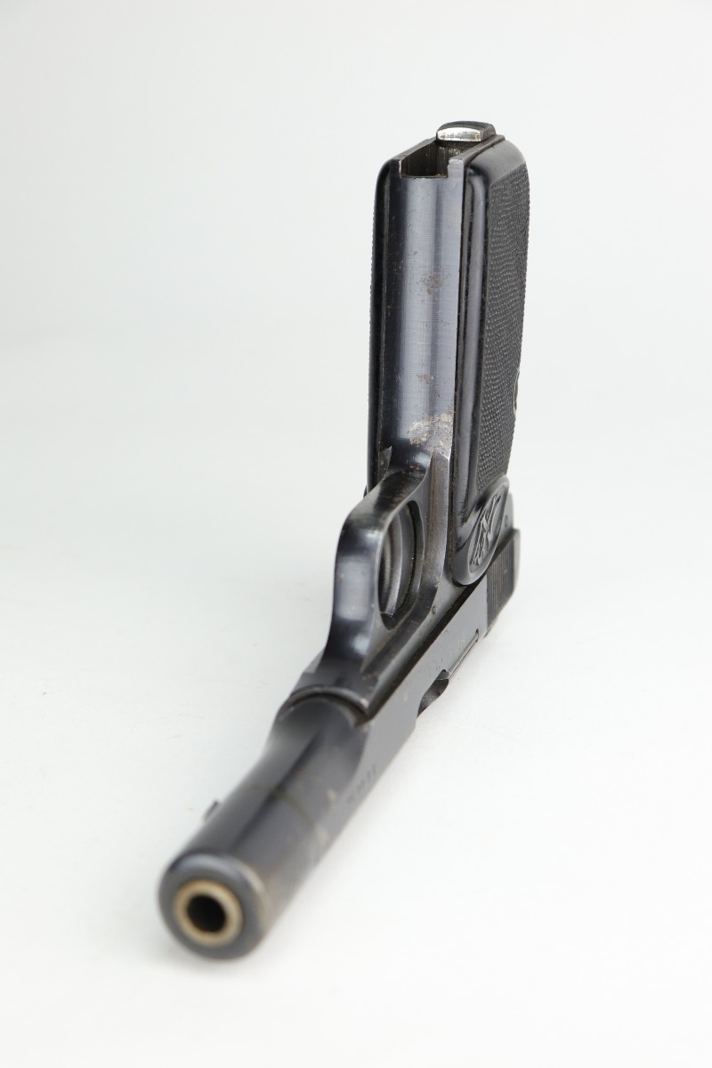 9/25/20 – This is an FN Browning Model 1922 issued to the Nazi military during WW2. It is all matching and has the proper “Eagle 140” Nazi military acceptance proofs. This particular gun has retained roughly 92% of its original bluing. There is splotchy wear and discoloration on every side of the slide, at the back of the frame, underside of the trigger guard, and on the front strap. There are also small areas of minor pitting here and there, most noticeable around the muzzle. It comes with one magazine and excellent period-correct grips. The bore is excellent – shiny with strong rifling.