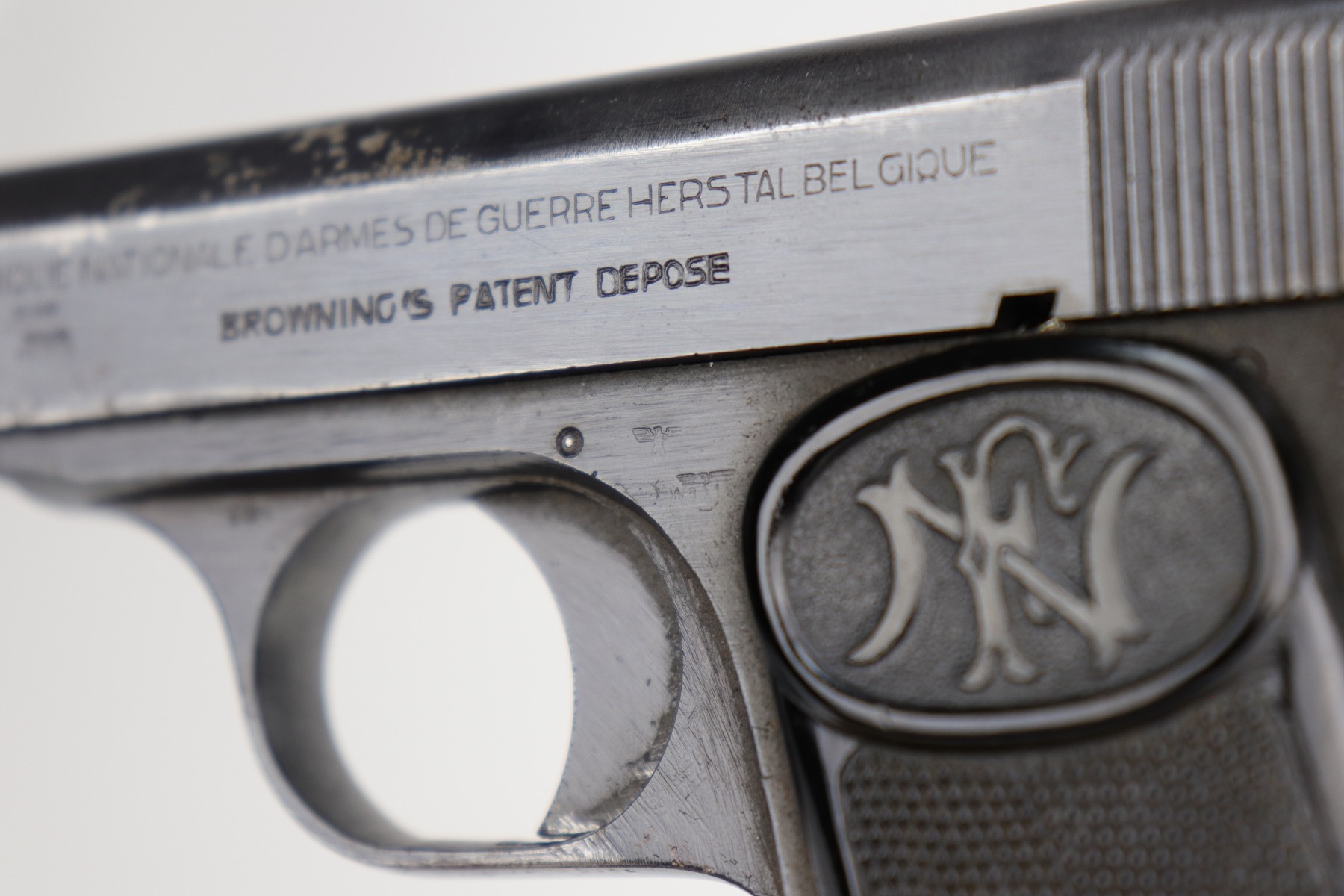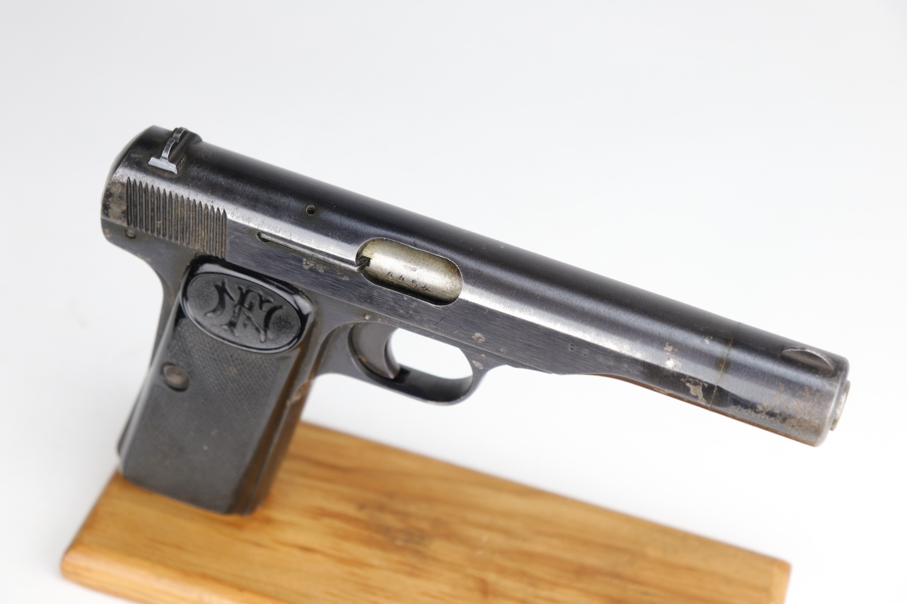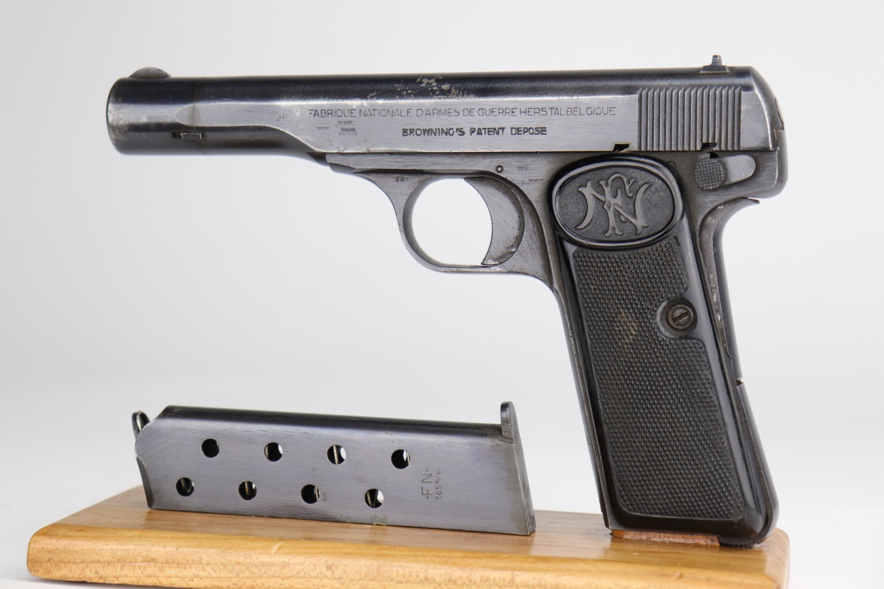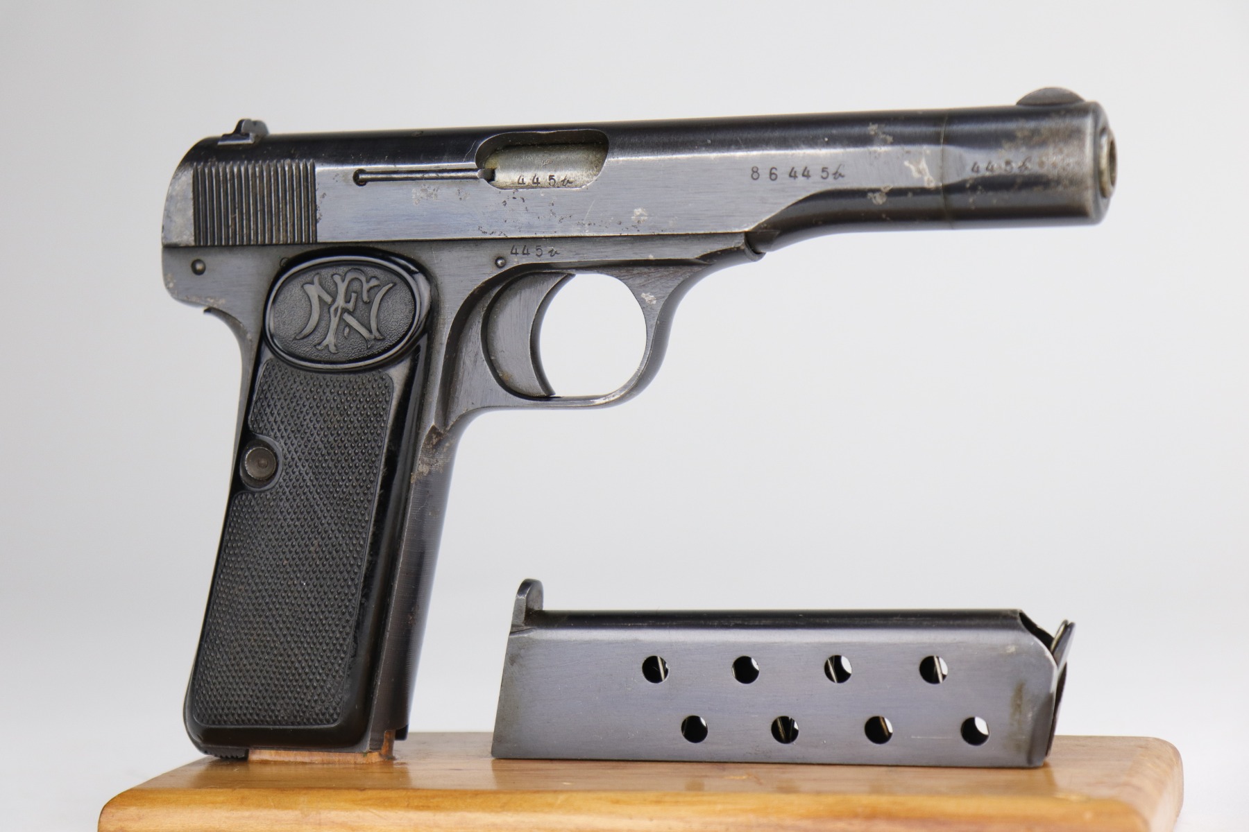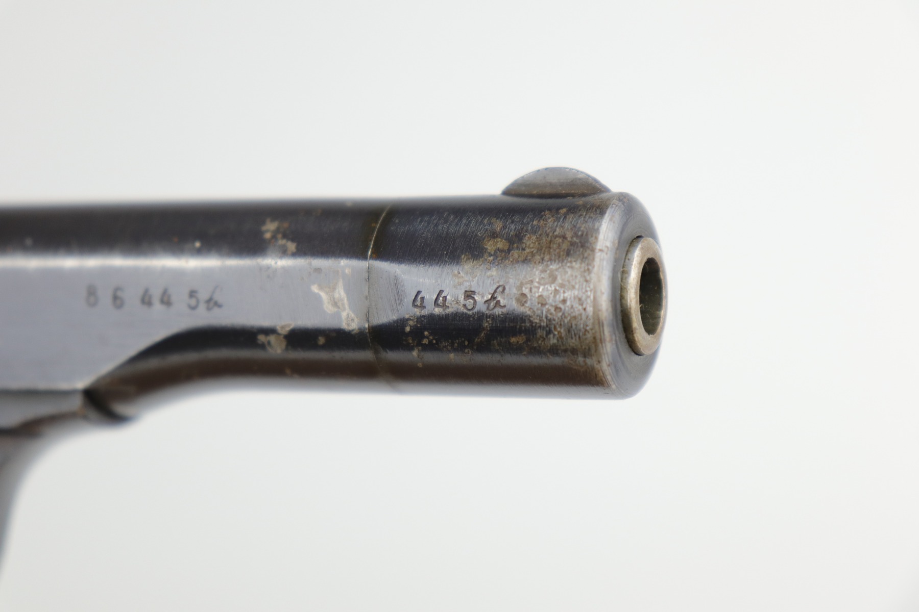 9/25/20 – This is an FN Browning Model 1922 issued to the Nazi military during WW2. It is all matching and has the proper “Eagle 140” Nazi military acceptance proofs. This particular gun has retained roughly 92% of its original bluing. There is splotchy wear and discoloration on every side of the slide, at the back of the frame, underside of the trigger guard, and on the front strap. There are also small areas of minor pitting here and there, most noticeable around the muzzle. It comes with one magazine and excellent period-correct grips. The bore is excellent – shiny with strong rifling.