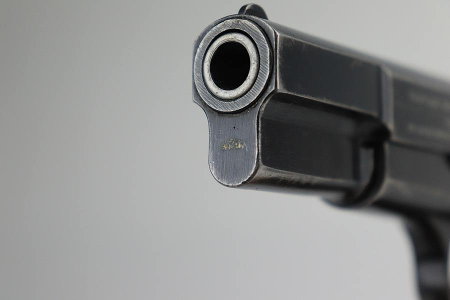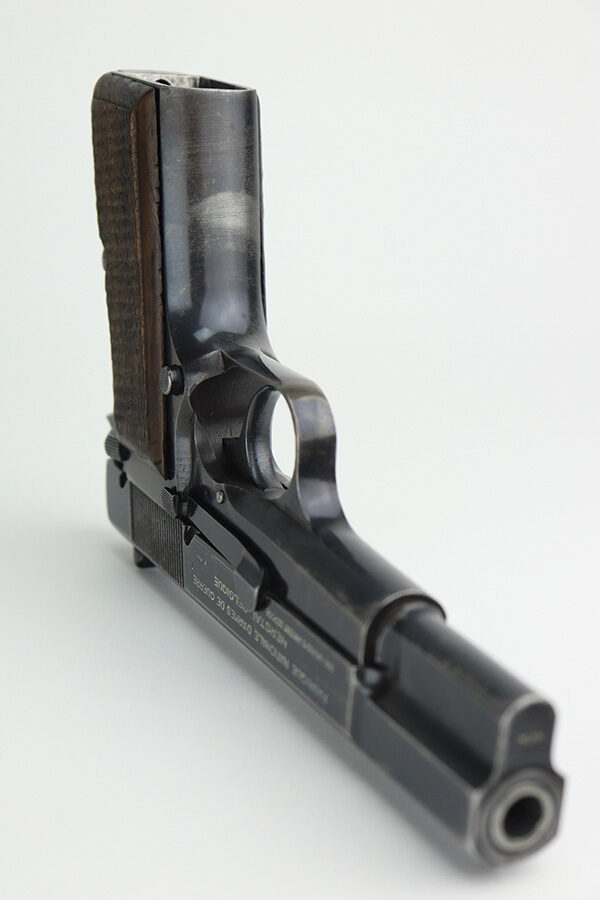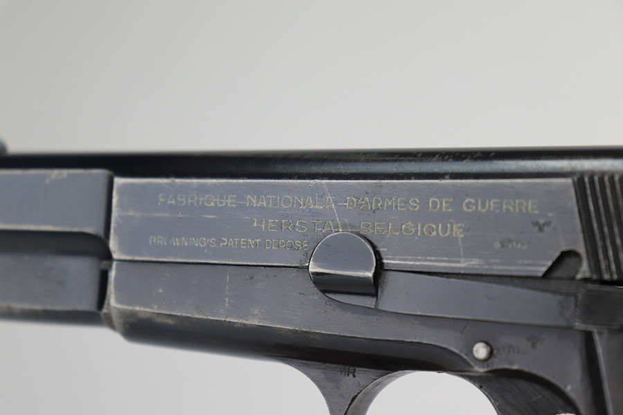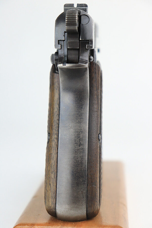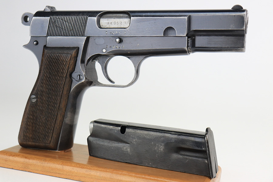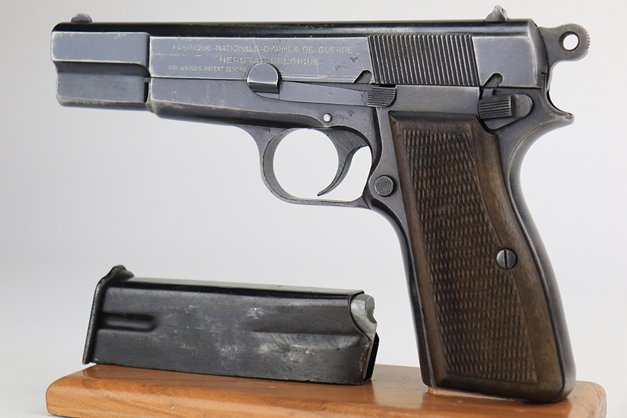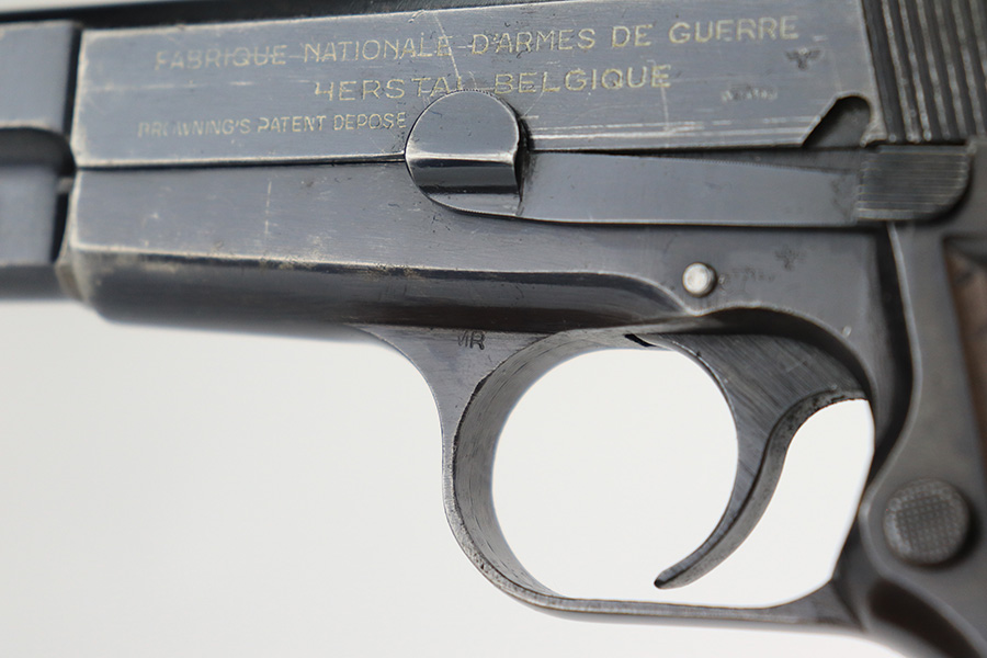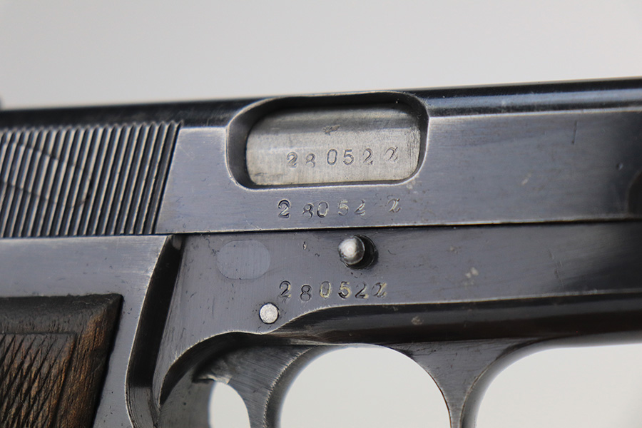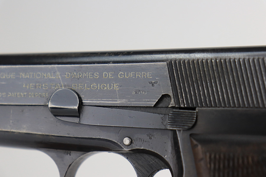 12/13/21 – This is a very nice example of an FN Browning Hi Power issued to the Nazi military during WW2. This is the later variation with a fixed rear sight and no slot in the back of the frame. It is all matching and has the proper “Waffen 140” Nazi military acceptance proofs throughout. It has retained roughly 80-85% of its original finish. There is minor wear concentrated around the high edges of the slide and around the muzzle. Spotty wear and thinning on both grip straps. There is a streak of wear that runs along the top of the slide. An area of minor spotty wear under the front edge of the frame. A few very light scratches around the takedown lever. Comes with nice wood grips (minor bruising here and there) and an un-marked period-correct magazine. The bore has strong rifling with very minor pin-pricking in the grooves.