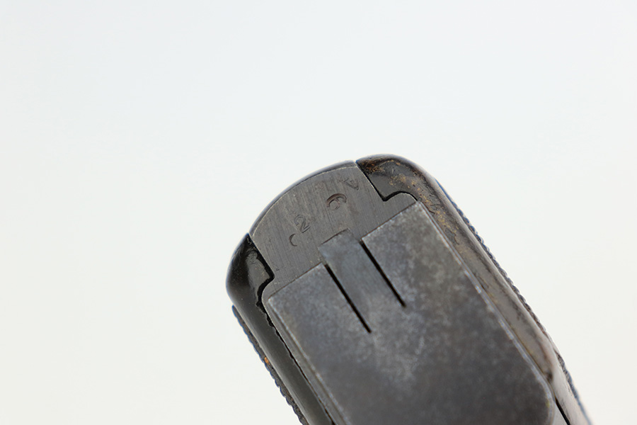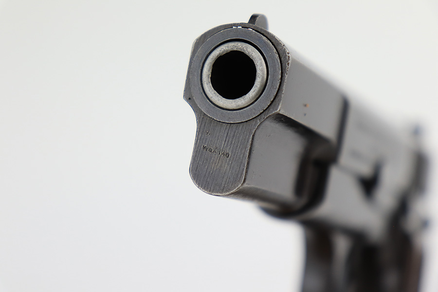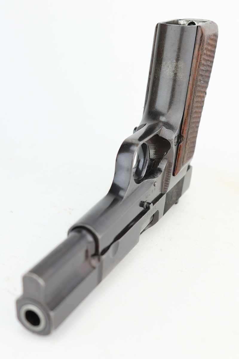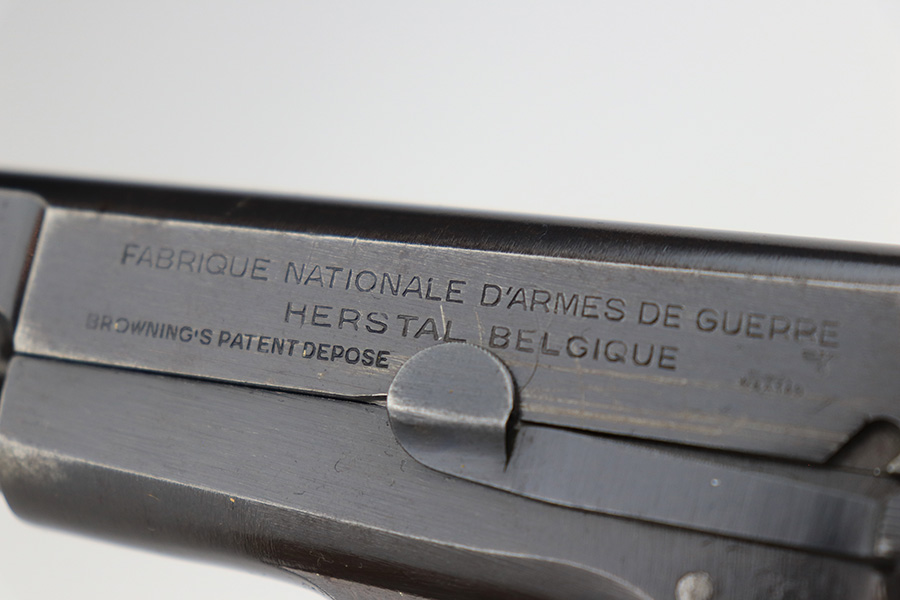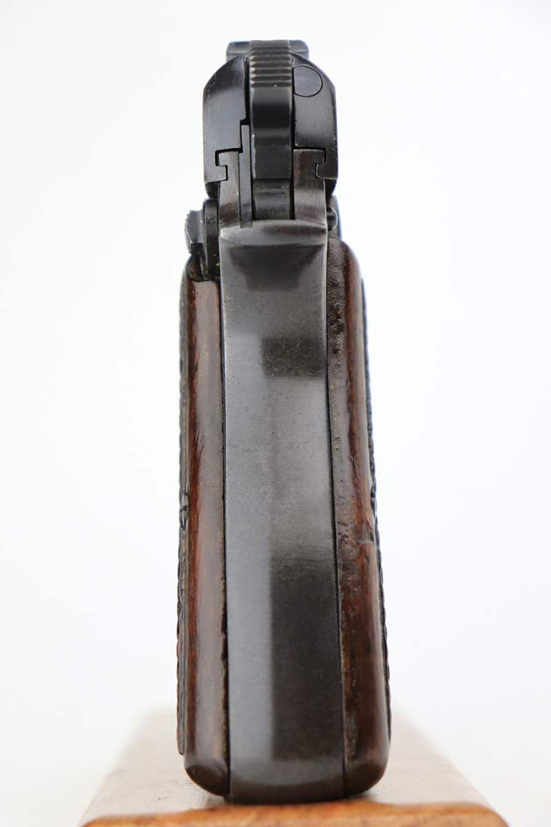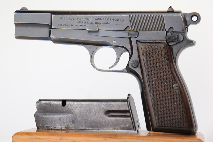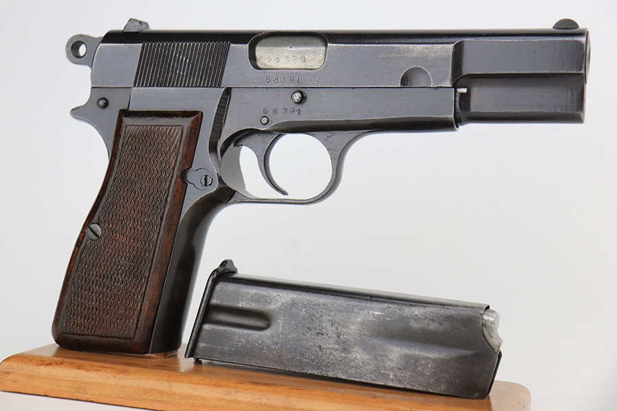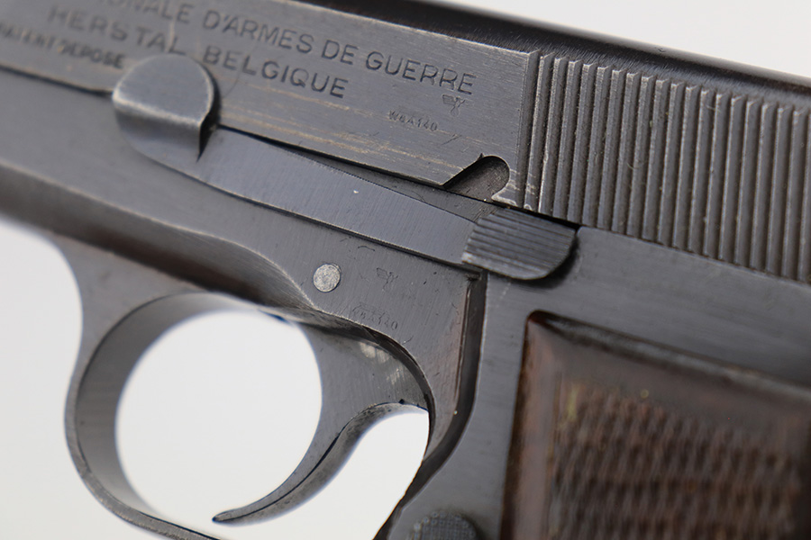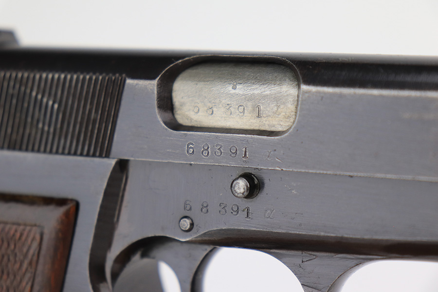 4/21/23 – This is an excellent example of an FN Browning High Power issued to the Nazi military during WW2. It is all matching and has the proper “Waffen 140” military acceptance proofs throughout. It has retained about 95% of its original finish with minor thinning and freckling on the grip straps, minor wear around the muzzle and on the high edges of the slide, and some light scratches on the left side of the slide. Fitted with very nice period-correct wood grips – a bruise on the right side. Comes with a period-correct “Waffen 140” proofed magazine. The bore has great rifling with very minor frosting in the grooves.