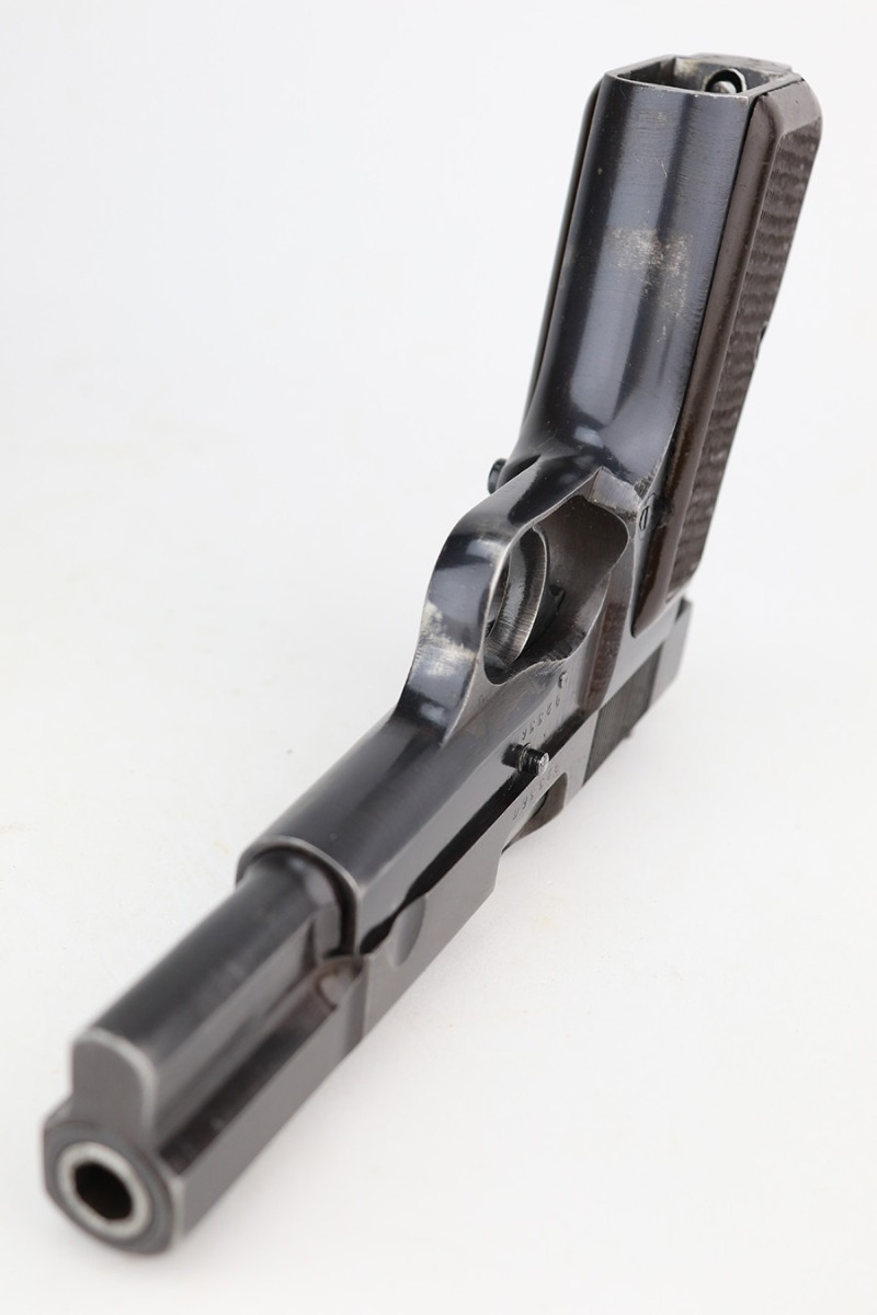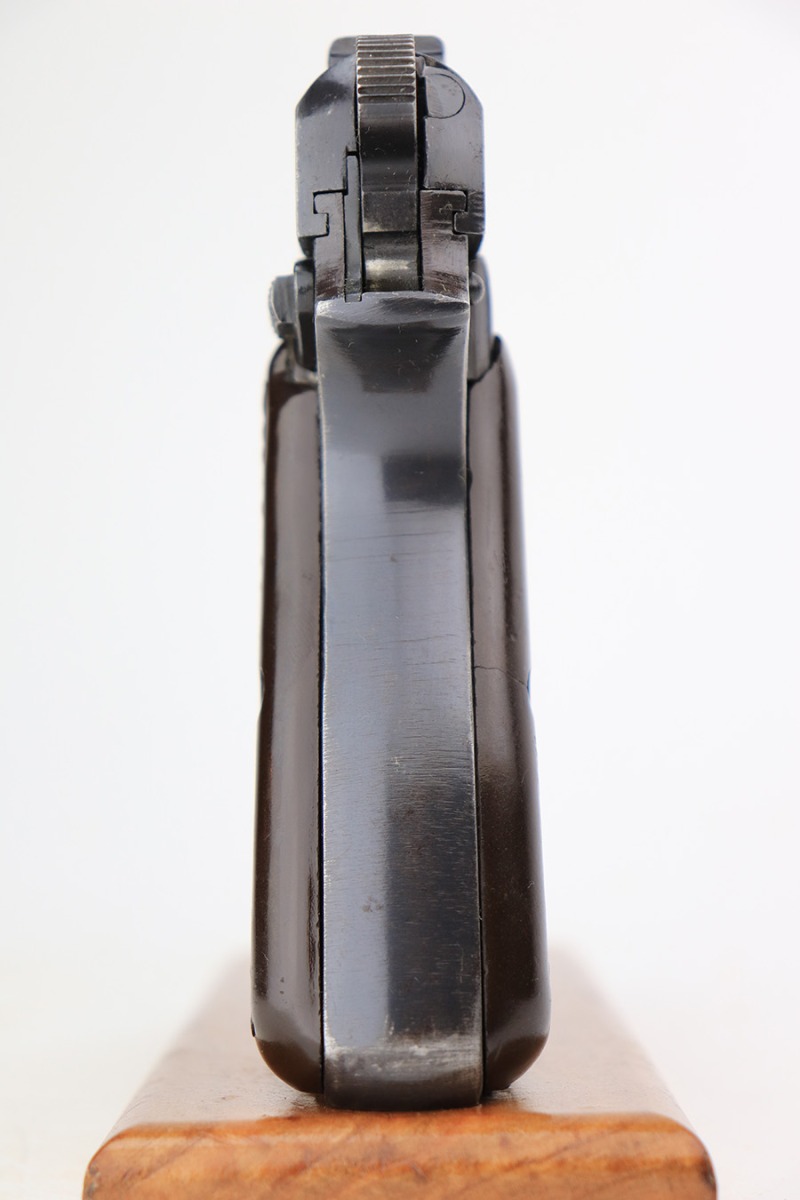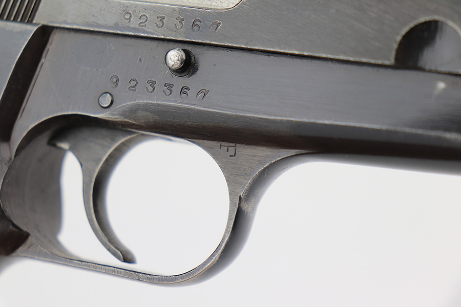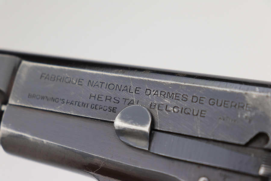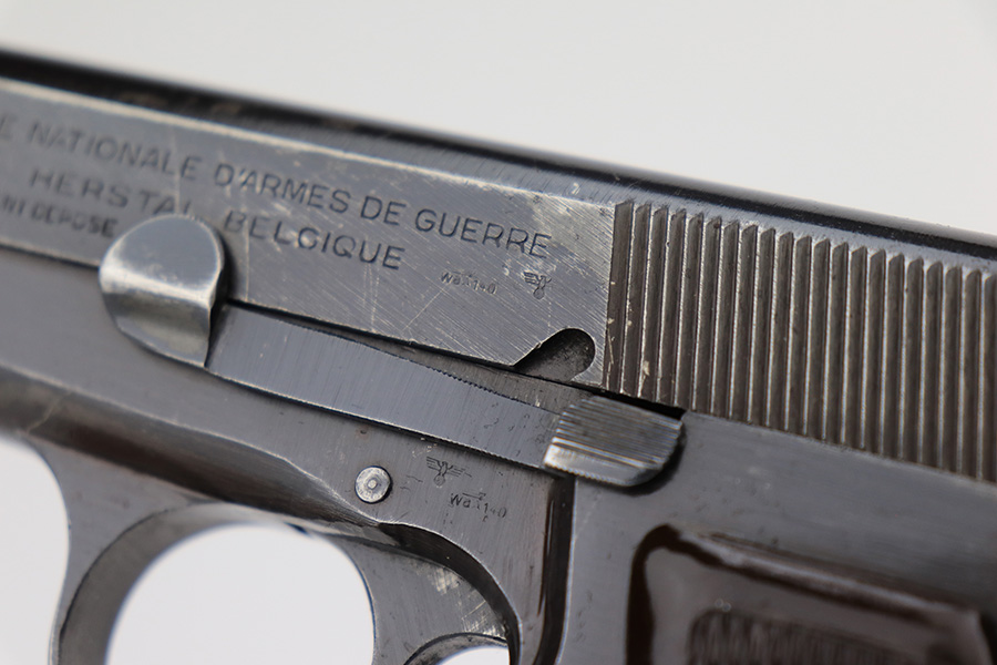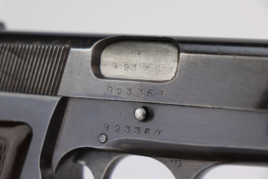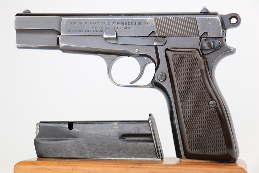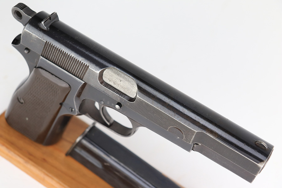 5/5/23 – This is a very nice example of an FN Browning High Power issued to the Nazi military during WW2. All matching with the proper “Waffen 140” military acceptance proofs. It has retained about 93% of its original finish. Minor wear around the muzzle and on the high edges in general. Areas of wear on the front strap and base of the back strap. Some small dots of discoloration along the top of the slide. Some light scratches on the left side of the slide. Fitted with nice period-correct brown bakelite grips – tiny crack around the right screw hole. Comes with a waffen-proofed magazine. The bore has great rifling with some very minor frosting here and there.
