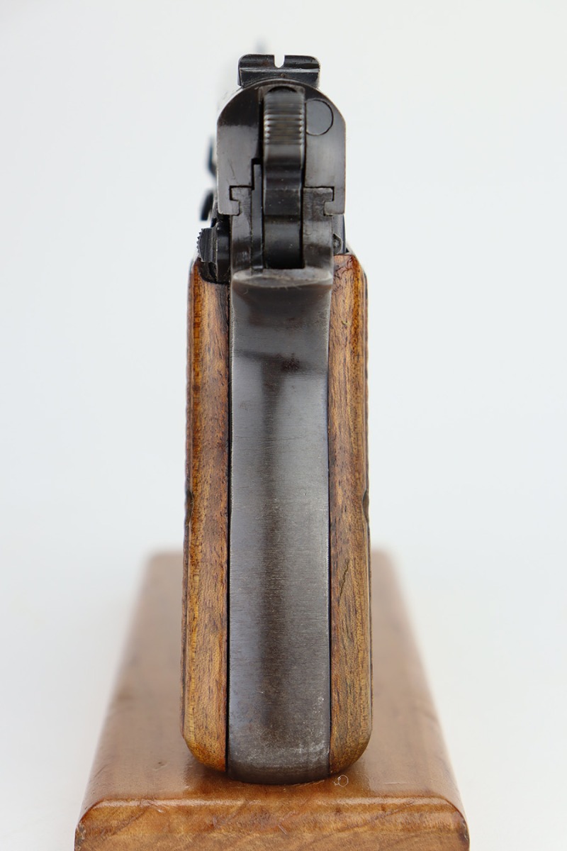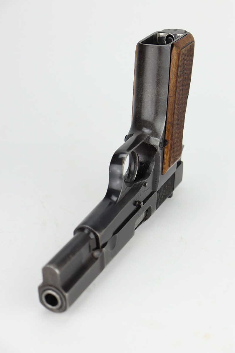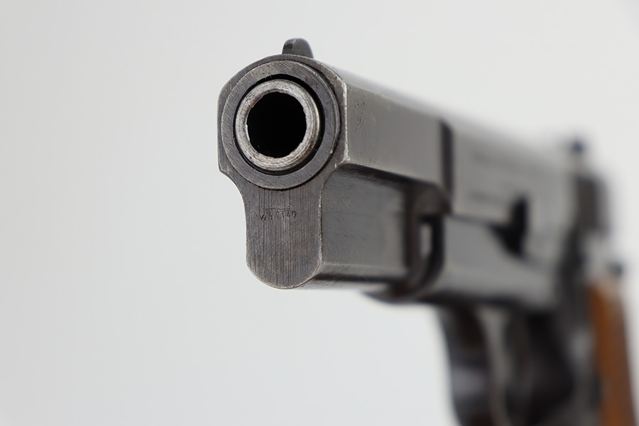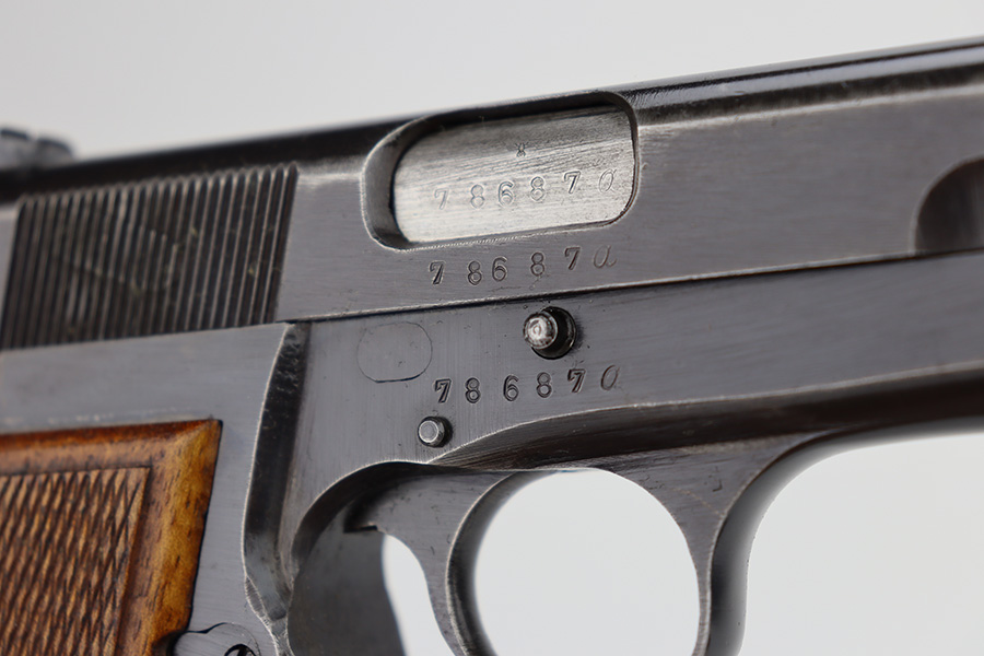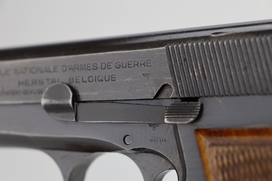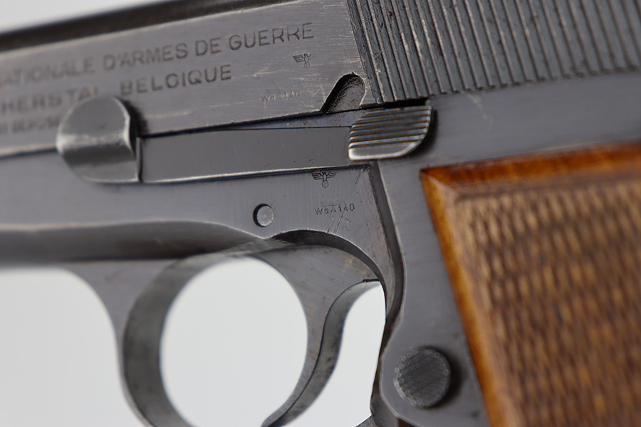 11/13/23 – This is an FN Browning High Power issued to the Nazi military during WW2. It is all matching and has the proper “Waffen 140” military acceptance proofs throughout. It has retained roughly 85% of its original finish. There is general high edge wear and thinning on the grip straps. Very nice period-correct wood grips and comes with an un-marked magazine. Minty bore.
