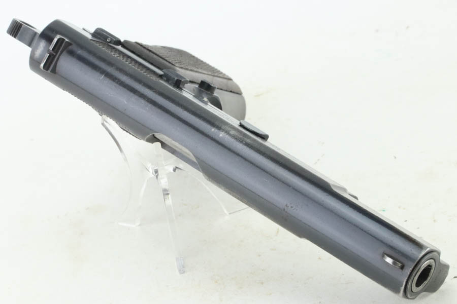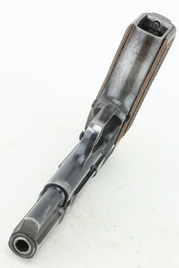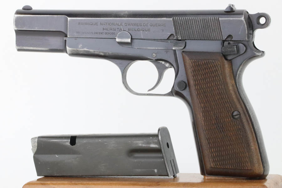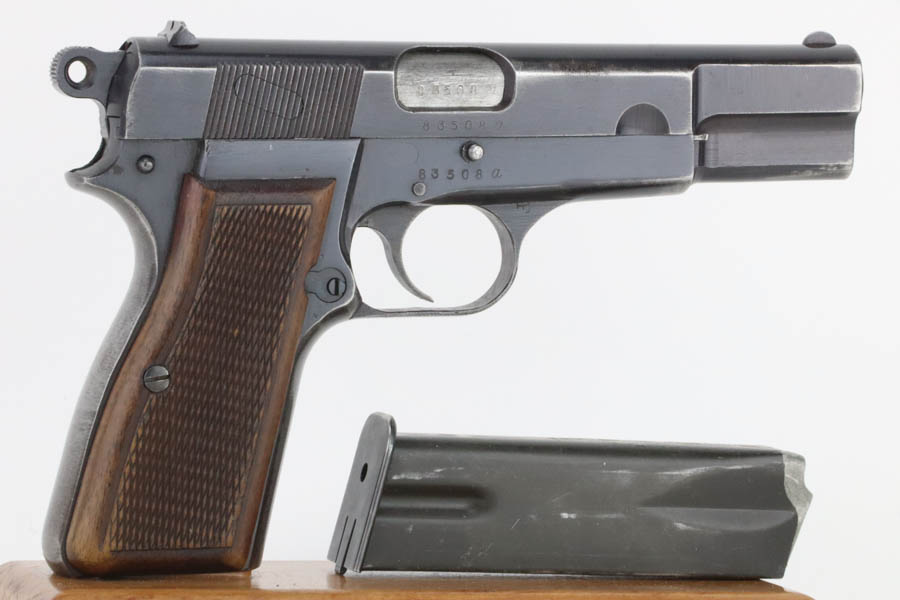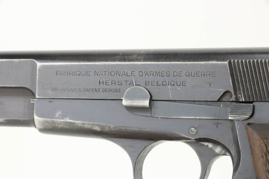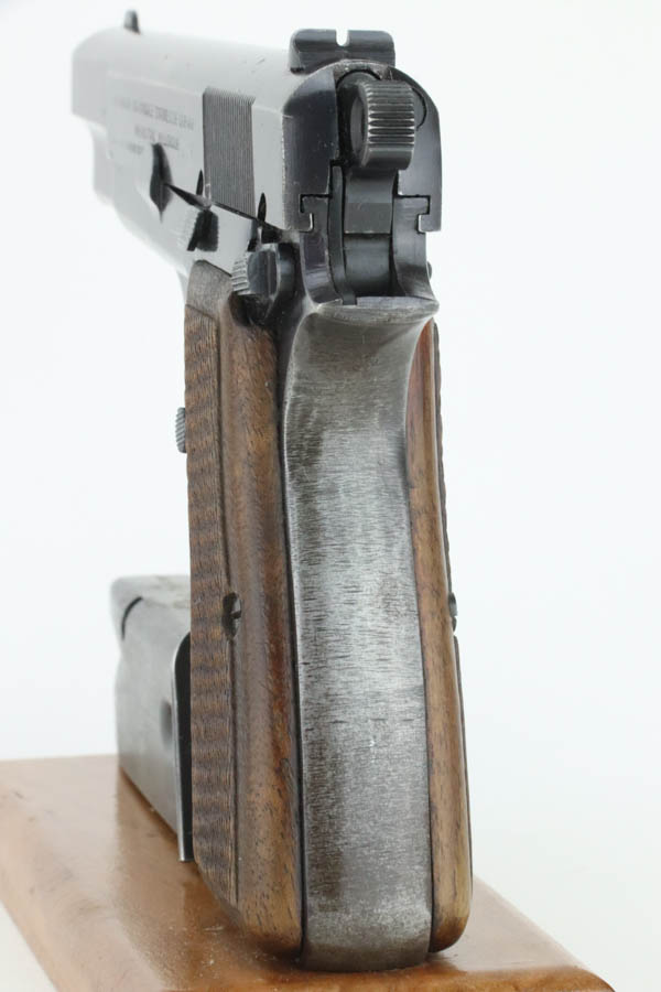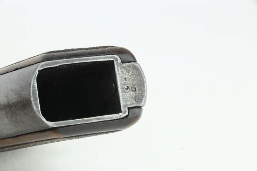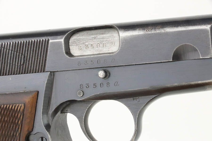 9/16/24 – This is a nice example of an FN Browning High Power issued to the Nazi military during WW2. It is all matching with the proper “Waffen 140” military acceptance proofs throughout. It has retained roughly 70% of its original wartime finish. There is significant finish loss on the grip straps and general minor high edge wear. It is fitted with period-correct wood grips and comes with a “JI” marked Canadian Inglis magazine. The bore has pretty good rifling, but there is noticeable pin-pricking throughout.