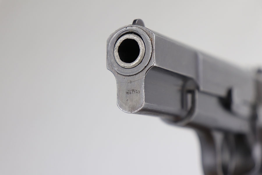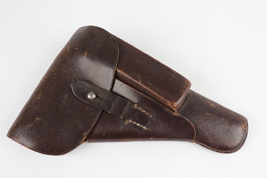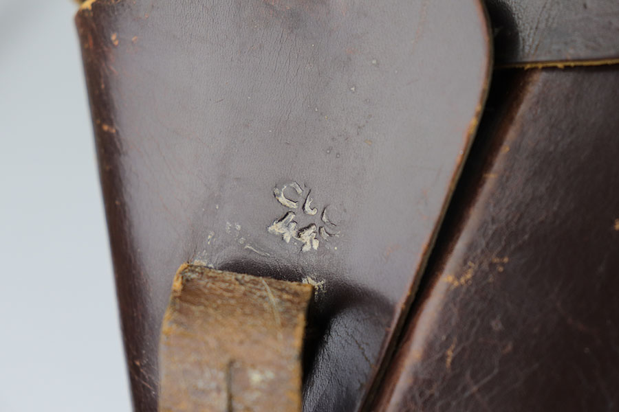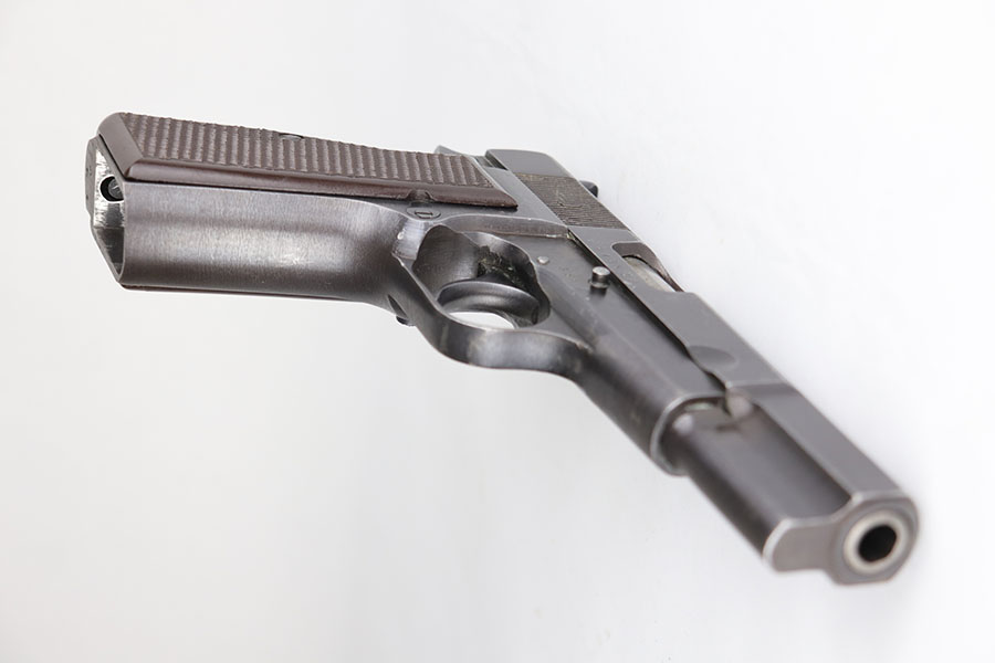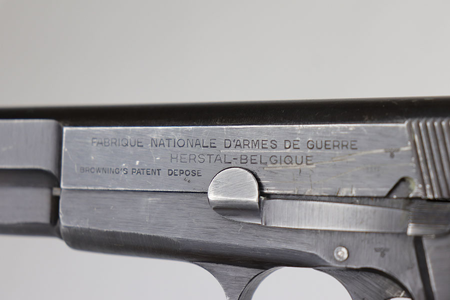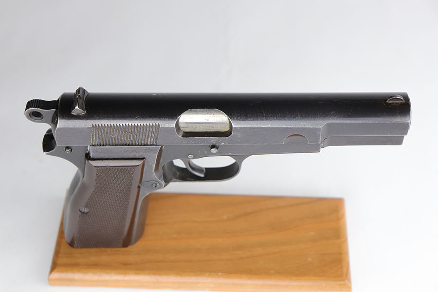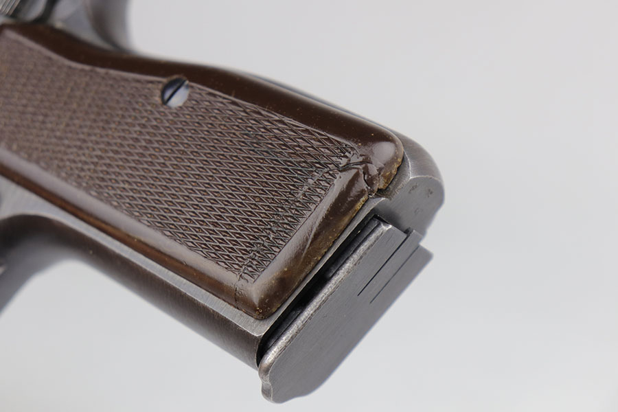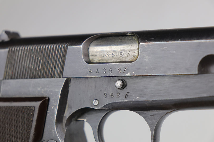 6/26/20 – This is an original FN Browning High Power and holster with about 95-96% of the factory blue remaining. There are some scratches on the slide from improper takedown, but minimal wear otherwise. WaA140 proofs on slide and frame. Original brown plastic grips, but note that the left panel has a repaired crack. Mint bore. Unmarked magazine. Holster is 1944 dated with internal waffenamt.