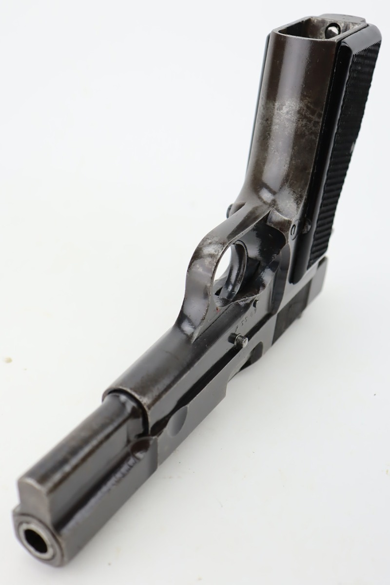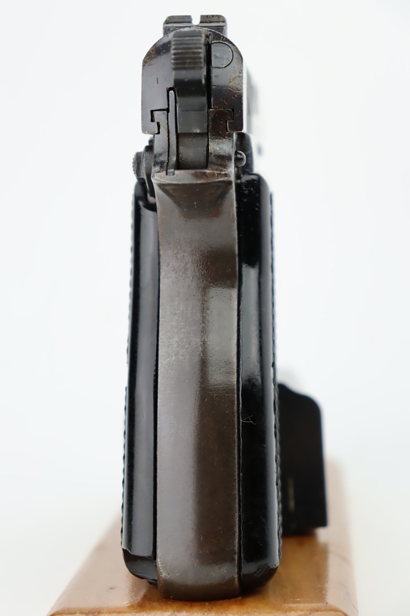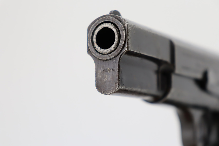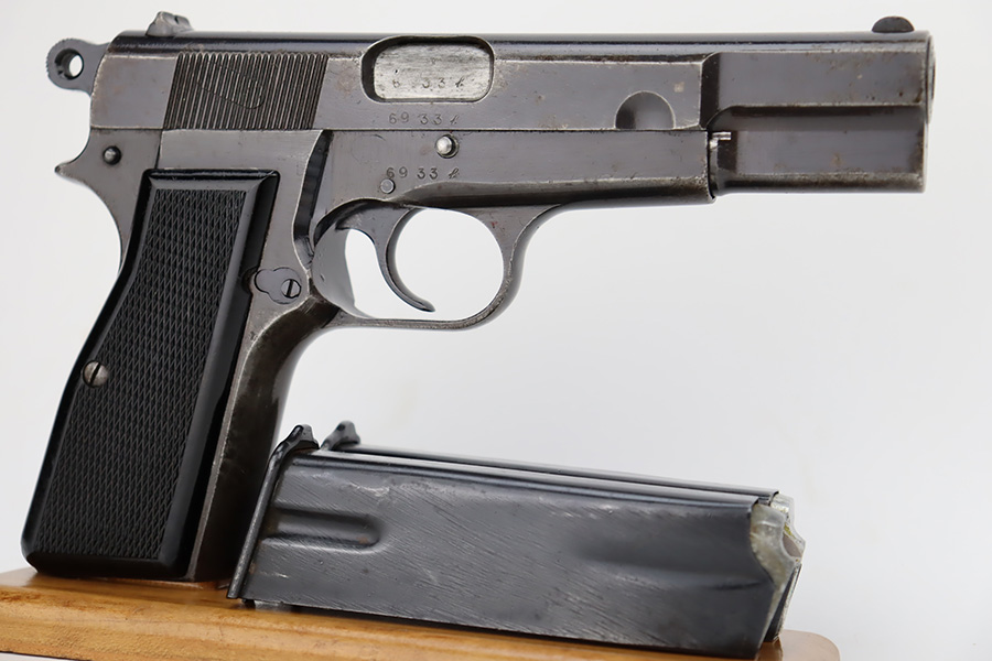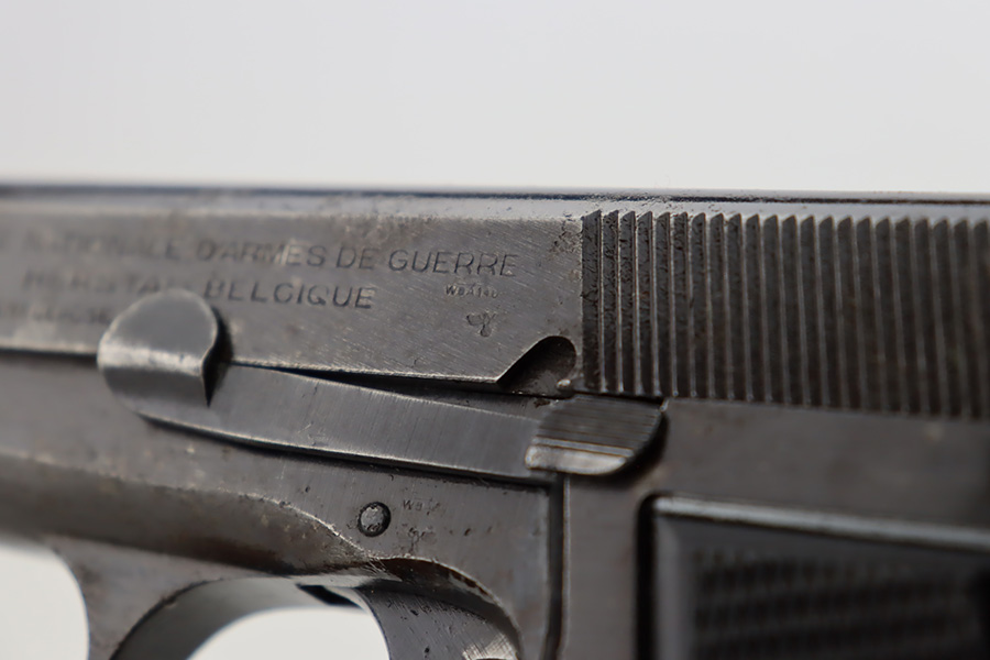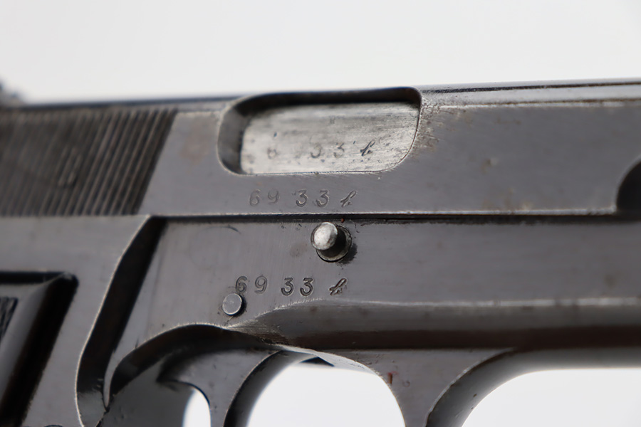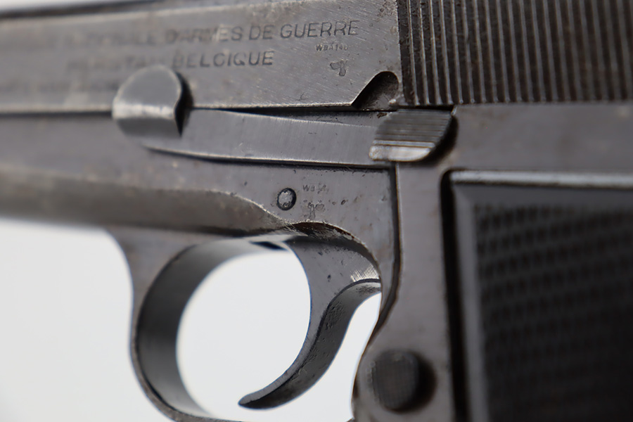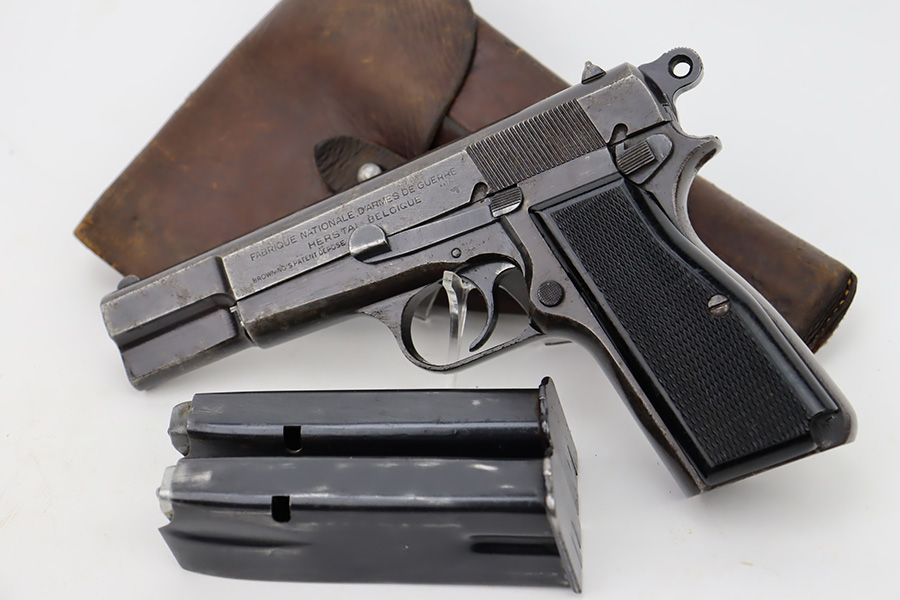 11/1/23 – This is an FN Browning High Power issued to the Nazi military during WW2. It is all matching and has the proper “Waffen 140” military acceptance proofs throughout. It comes as a rig with two “Waffen 140” proofed magazines and a 1944-dated waffen-proofed leather holster. The gun itself has retained somewhere between 85-90% of its original finish. There is general high edge wear and some thinning on the front strap. While there isn’t a ton of actual finish loss, there are areas of minor pitting throughout, most noticeable on the left side of the gun. Fitted with black bakelite grips. Very nice bore with great rifling.