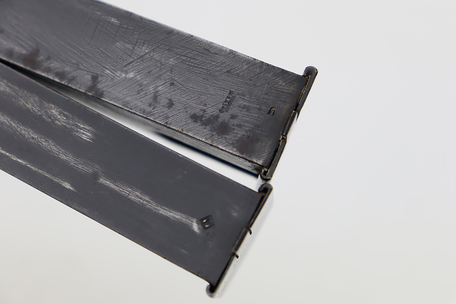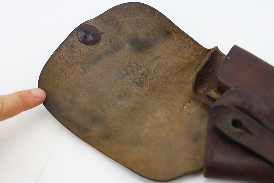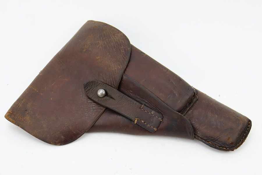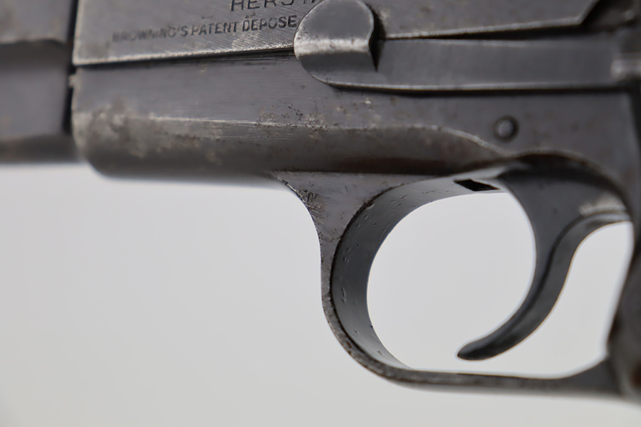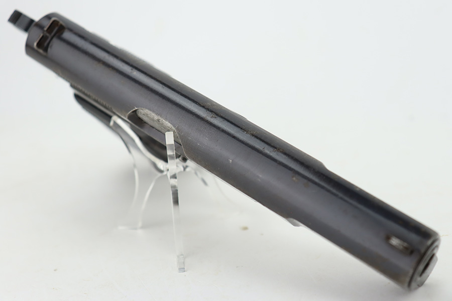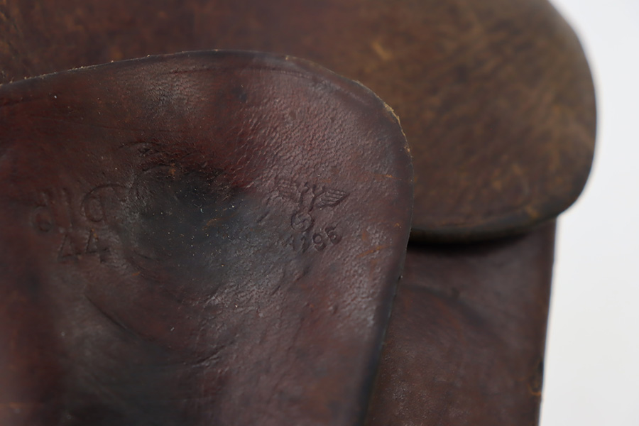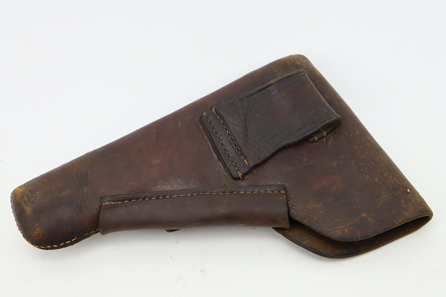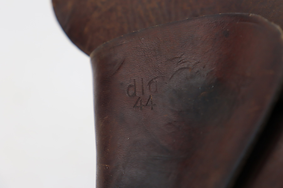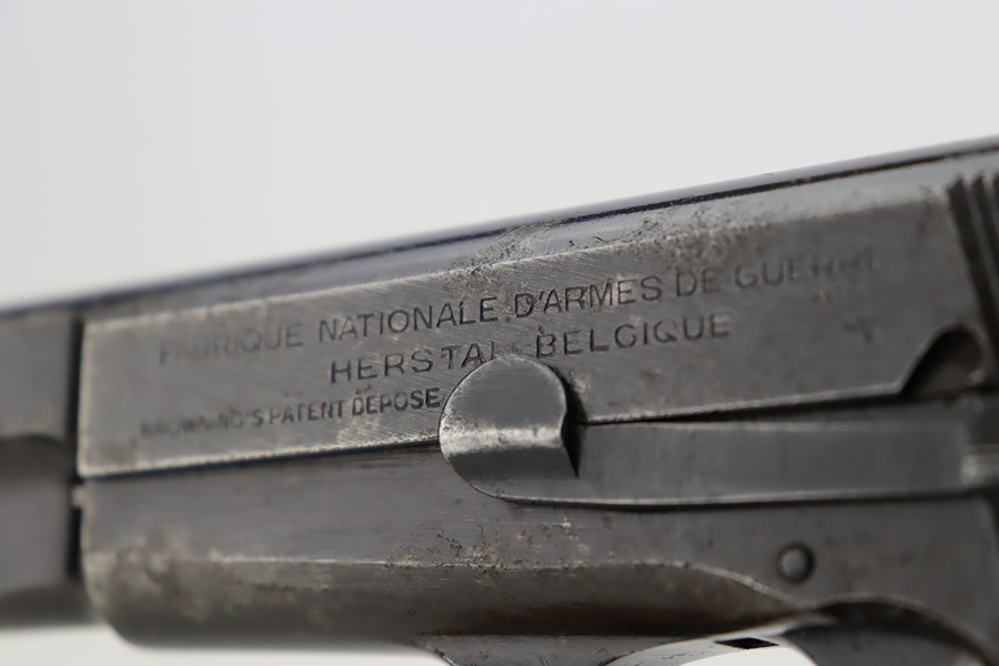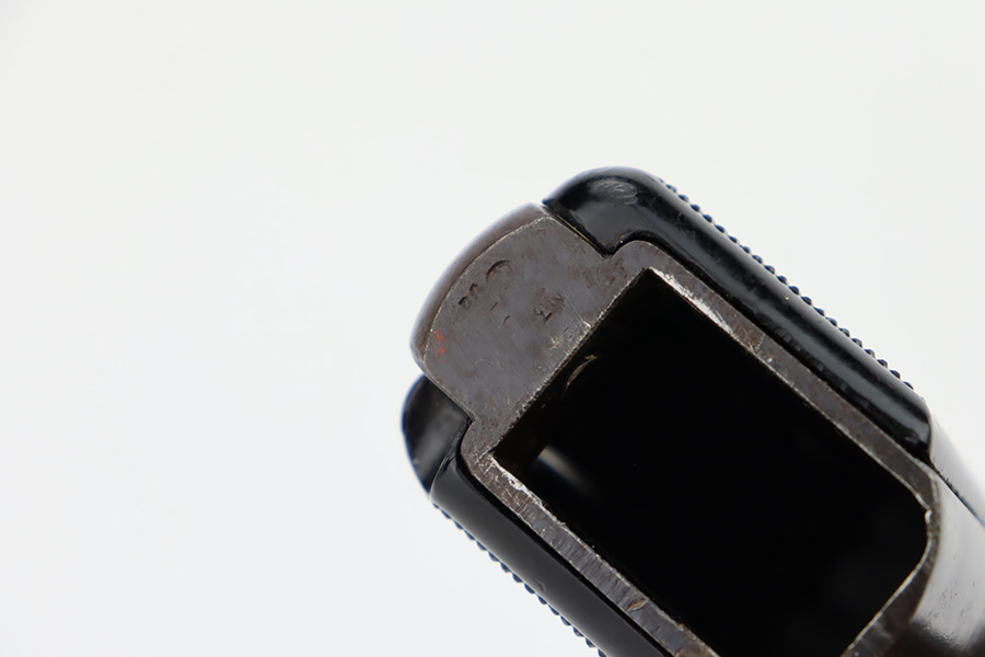 11/1/23 – This is an FN Browning High Power issued to the Nazi military during WW2. It is all matching and has the proper “Waffen 140” military acceptance proofs throughout. It comes as a rig with two “Waffen 140” proofed magazines and a 1944-dated waffen-proofed leather holster. The gun itself has retained somewhere between 85-90% of its original finish. There is general high edge wear and some thinning on the front strap. While there isn’t a ton of actual finish loss, there are areas of minor pitting throughout, most noticeable on the left side of the gun. Fitted with black bakelite grips. Very nice bore with great rifling.