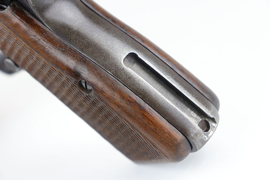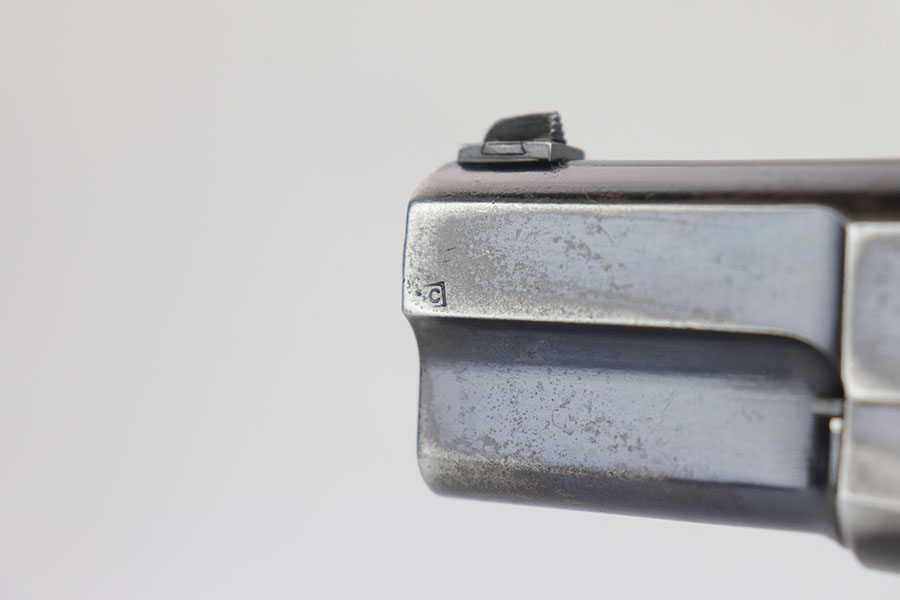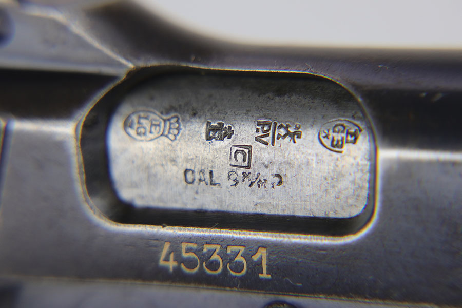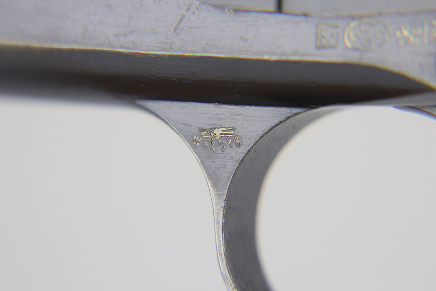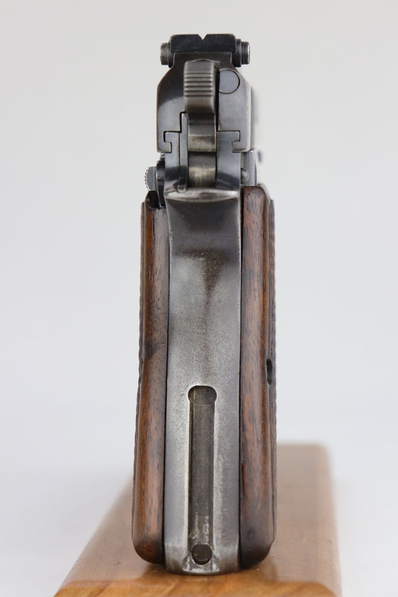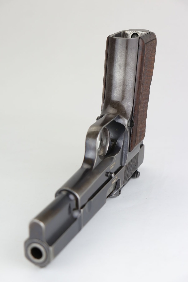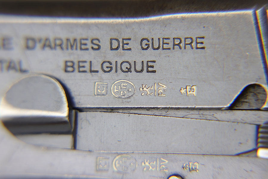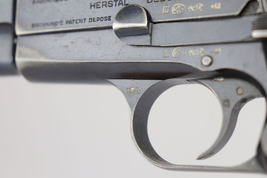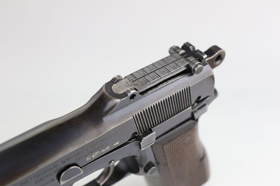 3/11/20 – This is a super rare and early Nazi FN Browning High Power with tangent sight and slotted frame, and is documented in Anthony Vanderlinden’s book on FN Browning Pistols (page 325). It is hard to estimate exact production totals for this variation as they were completed from a mixture of available parts without serial number continuity, but the total ranges span only about 3,000 digits. This example falls into the ‘sub-variant 1’ category with pre-invasion Liege proofs on the slide and frame. A single WaA613 proof will be found on the trigger guard, and partial Belgian military acceptance markings. It has all matching serials with Liege proofs on the prewar barrel. The slot in frame is factory original and the grips have the prewar red paint on the back. The finish is original with most of the wear and patina on the straps. Bore has strong rifling with minor signs of use. Grips are in great shape aside from a small ding in the left panel. Note that we will include a copy of Vanderlinden’s book with this purchase.