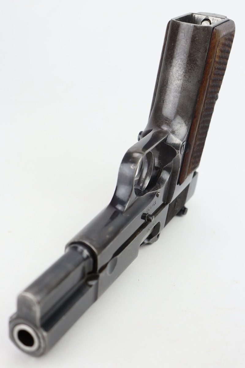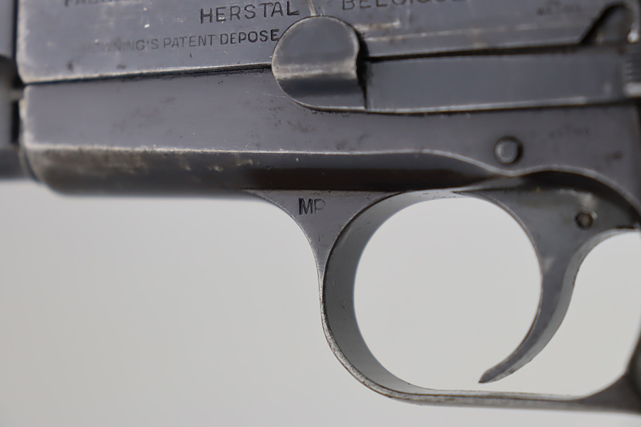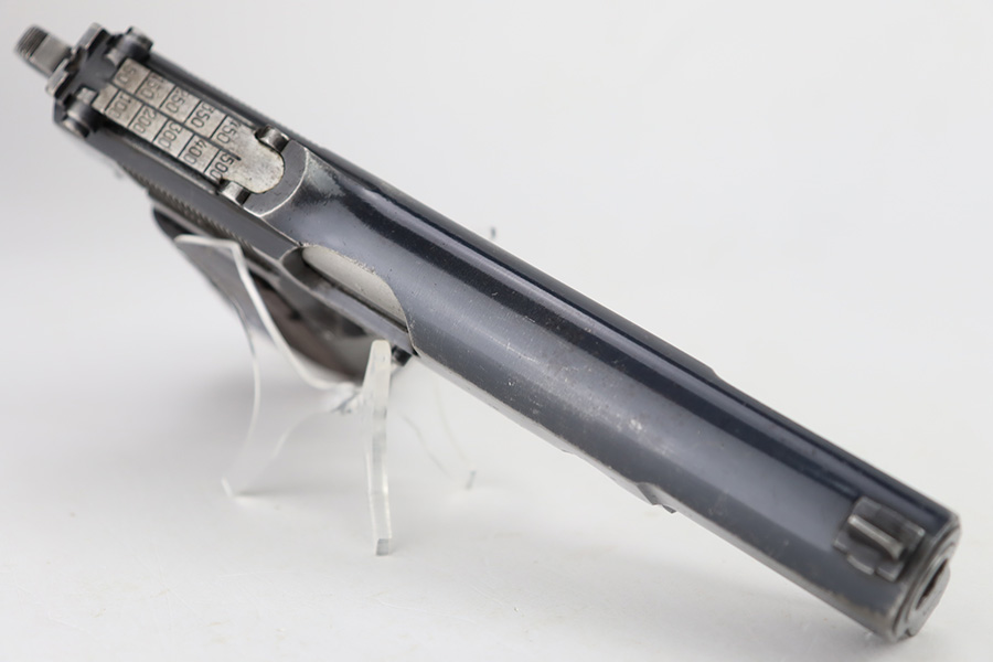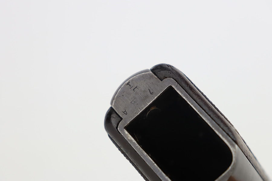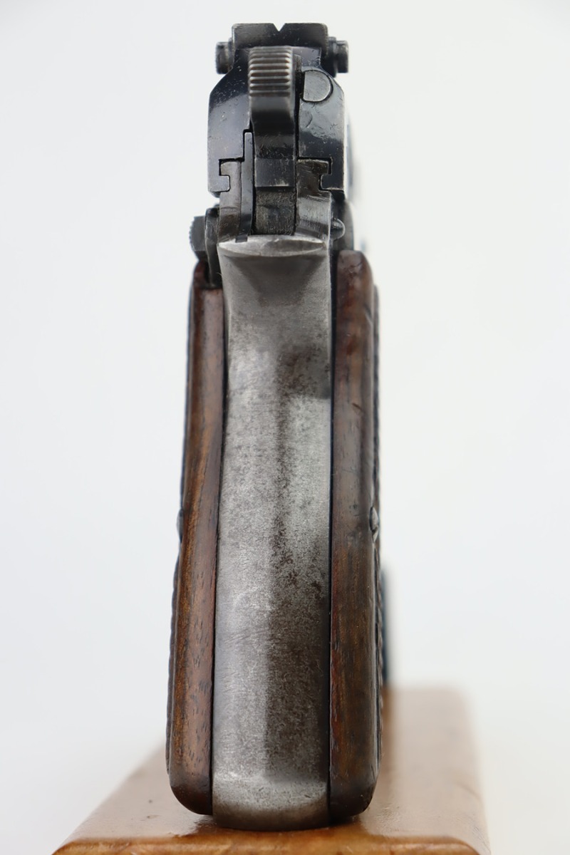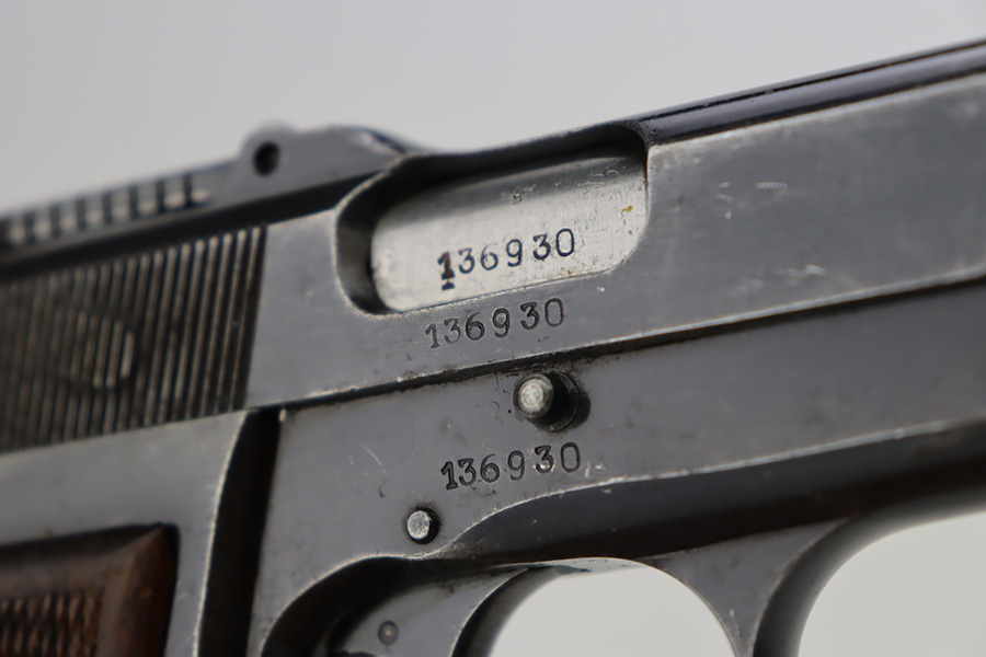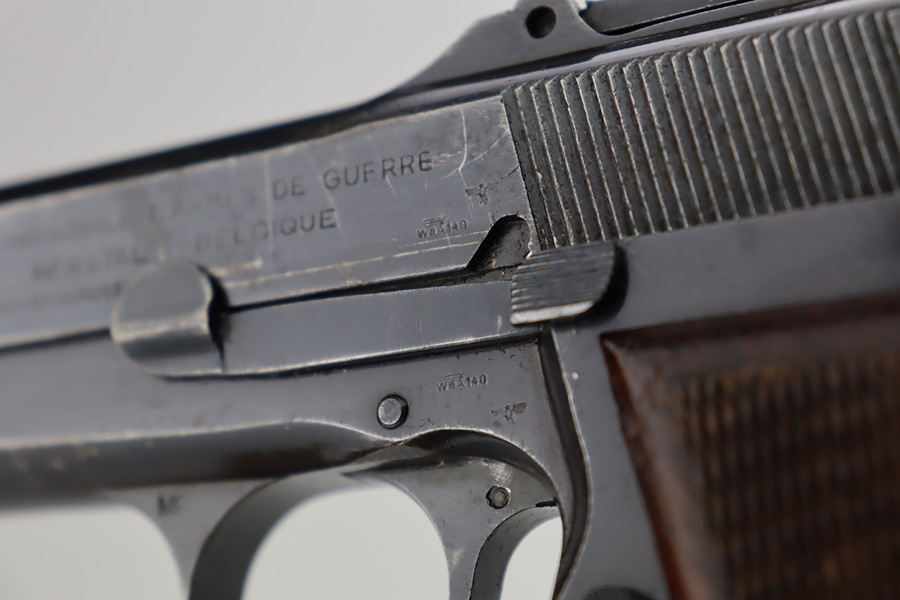 11/1/23 – This is a nice example of an FN Browning High Power issued to the Nazi military during WW2. It is all matching, has the proper “Waffen 140” military acceptance proofs, and has an earlier tangent-style rear sight. It has retained roughly 80% of its original finish. There is thinning and spotty oxidation on the grip straps and areas of light spotty wear throughout, concentrated around the high edges. Light scratches here and there along the slide. Fitted with nice period-correct wood grips. Comes with an un-marked magazine. Very nice bore with great rifling.