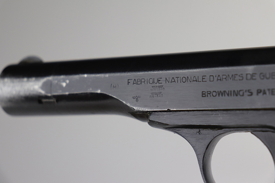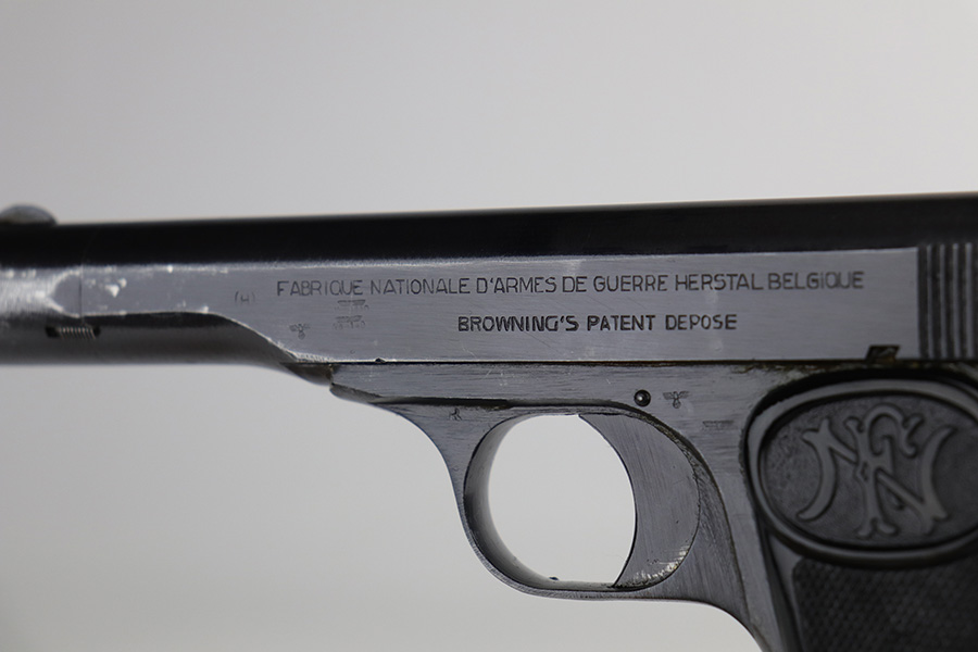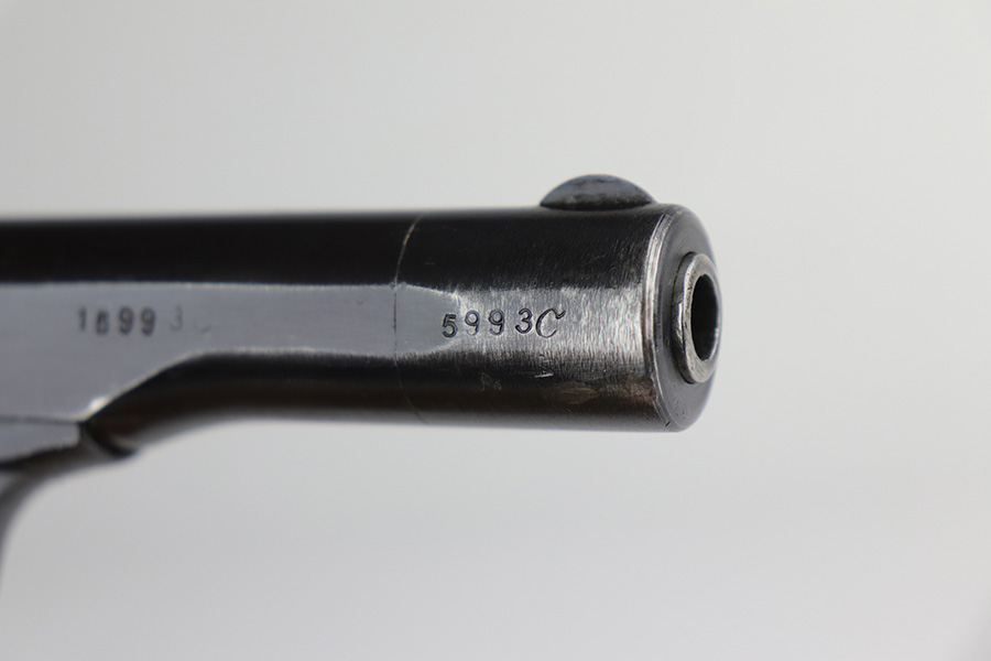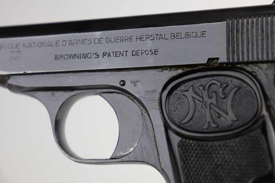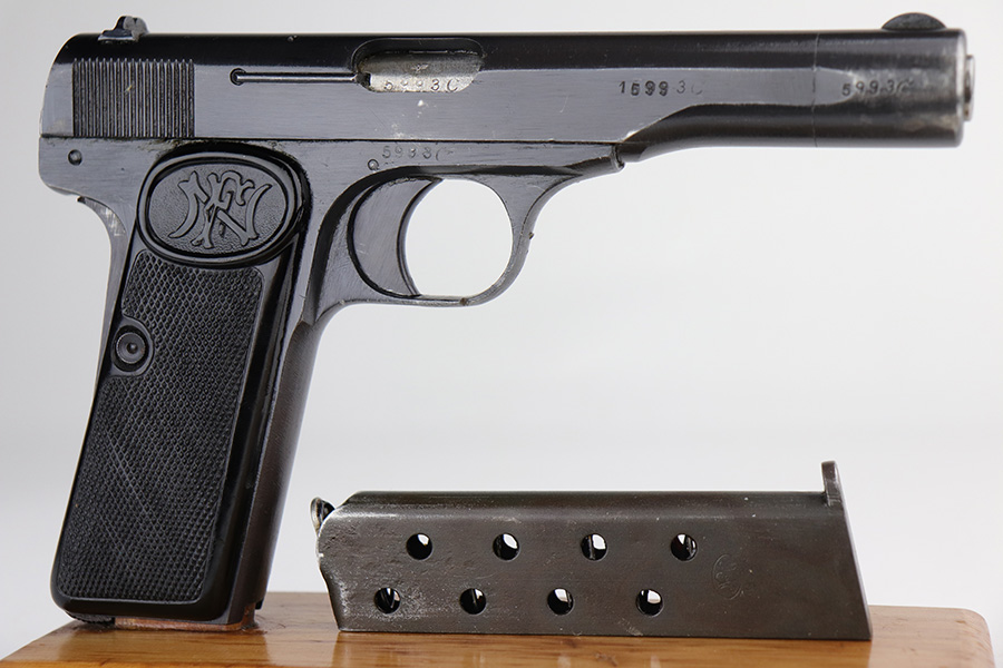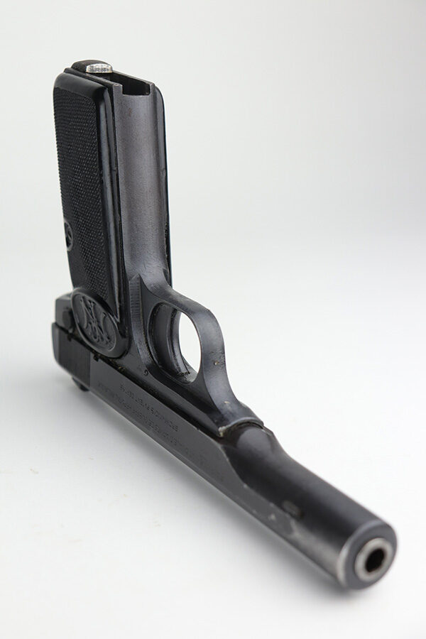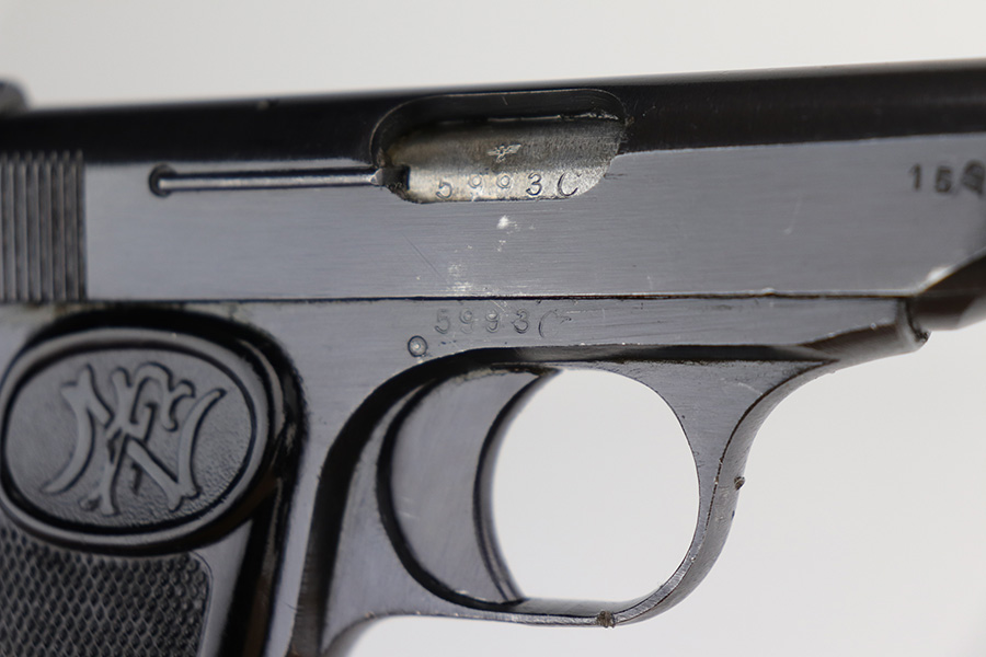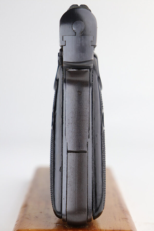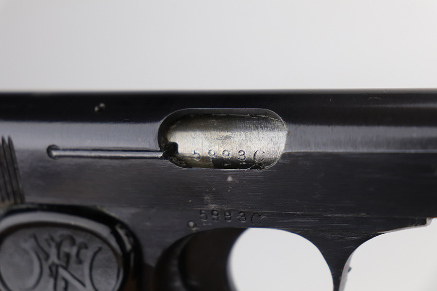 9/10/21 – This is a very nice example of an FN Browning Model 1922 pistol issued to the Nazi military during WW2. It is all matching and has the proper “Waffen 140” Nazi military proofs. It has retained about 92-93% of its original finish. There is wear around the muzzle, very minor wear on the high edges of the slide, and a few small dots of wear on both sides of the slide. Comes with excellent black bakelite grips and a proper magazine. Excellent shiny bore with strong rifling with some areas of very minor pin-pricking.