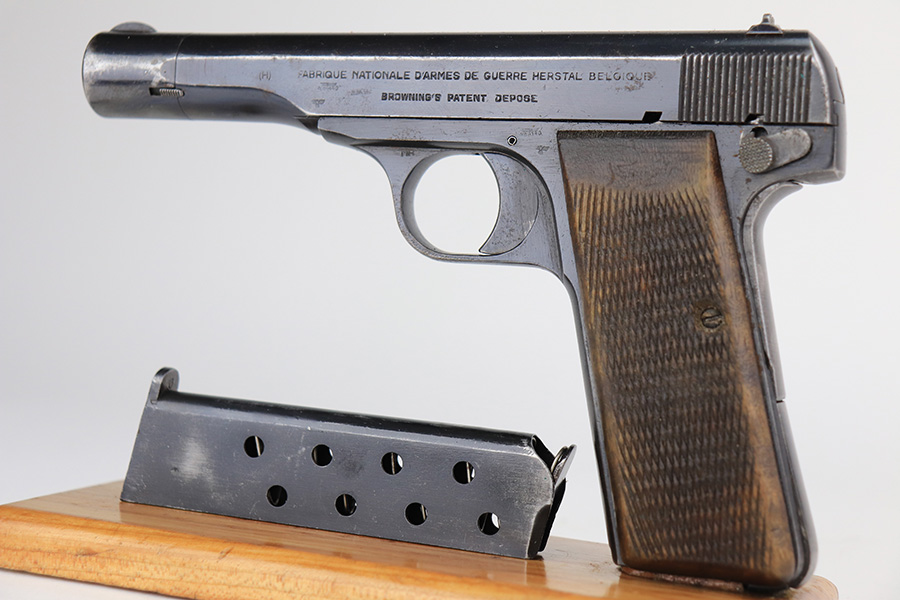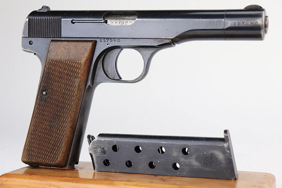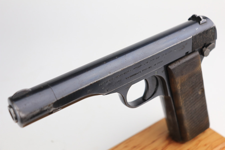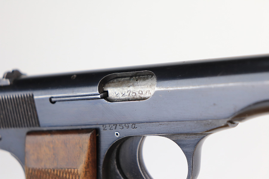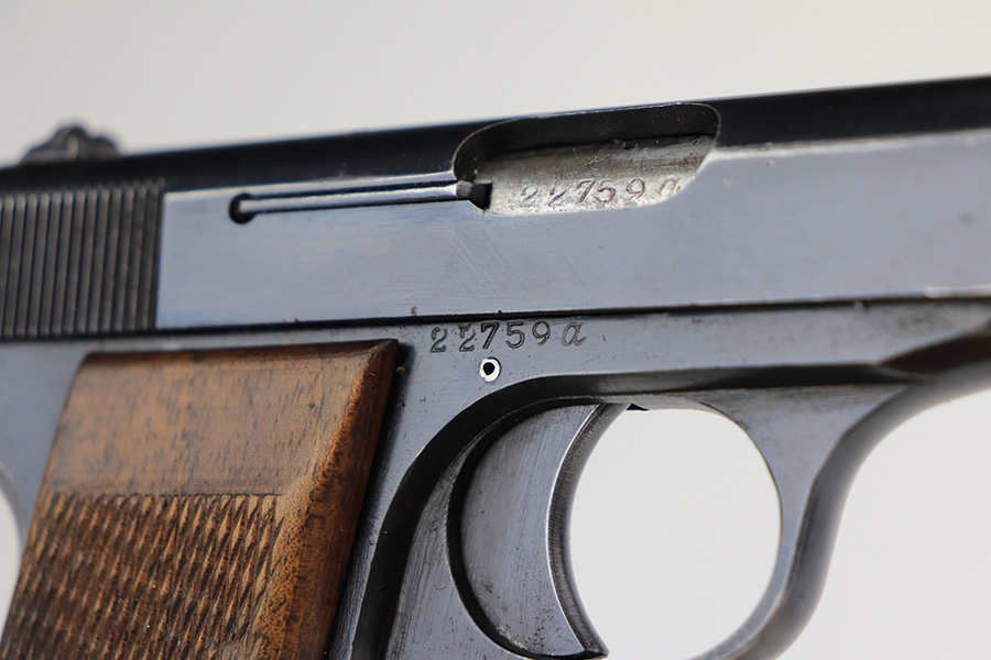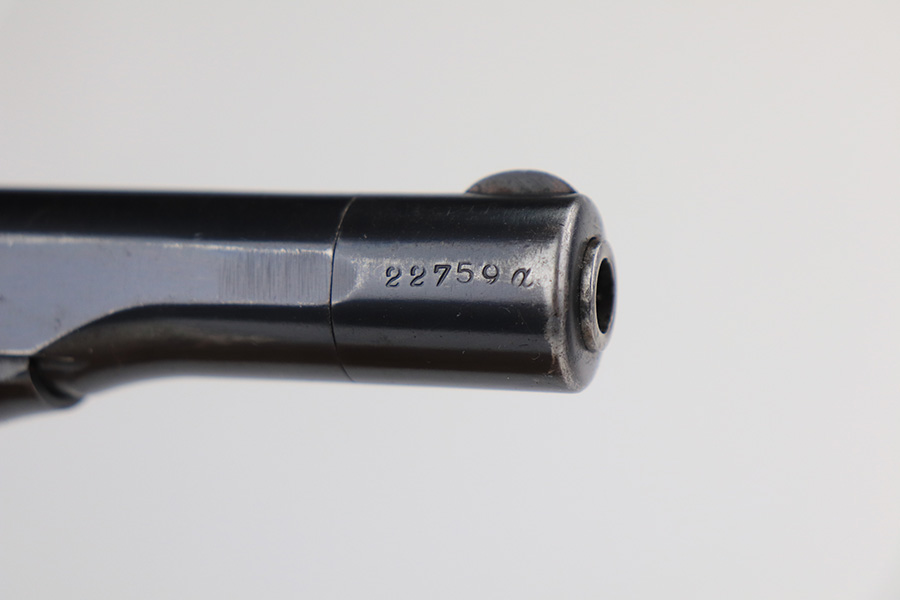 2/22/22 – This is a very nice example of an FN Browning Model 1922 issued to the Nazi military during WW2. It is all matching and has the proper “Waffen 140” Nazi military acceptance proofs. It has retained somewhere between 85-90% of its original finish. There is spotty wear on both grip straps, minor muzzle wear, and minor wear concentrated around the high edges of the slide. There are some areas of minor freckling here and there along the slide, mainly along the top. Comes with nice wood grips and a proper magazine (no waffen proofs). The bore is excellent with strong rifling and very minor pin-pricking in some of the grooves.