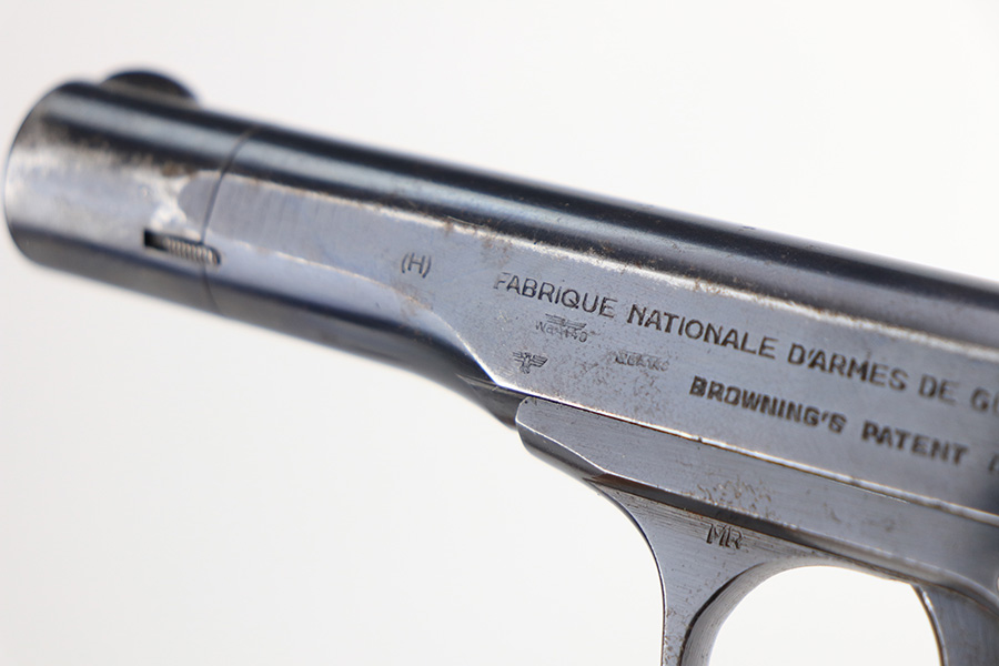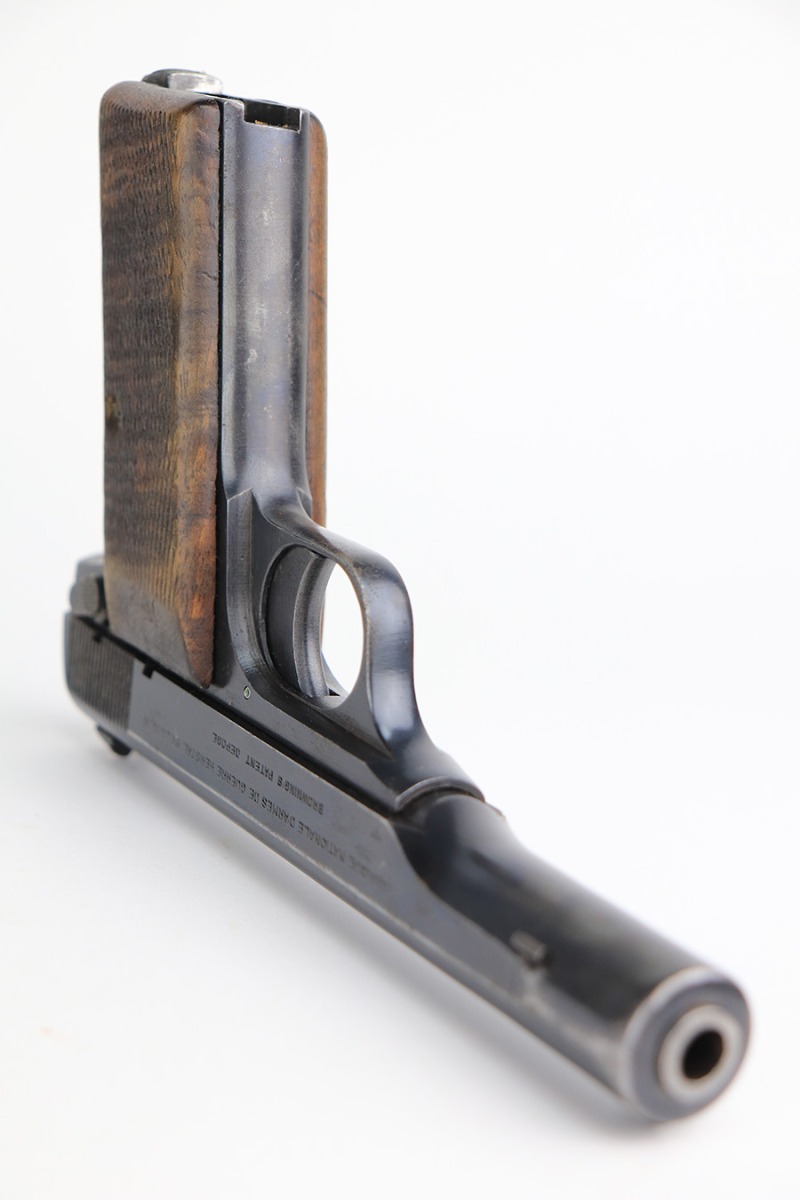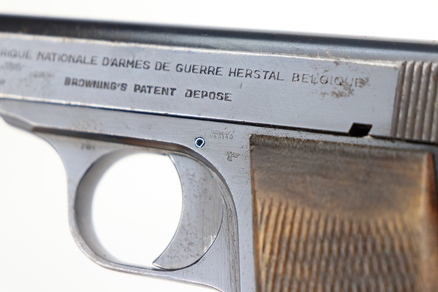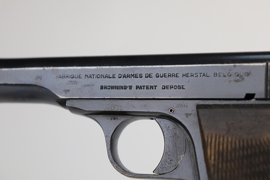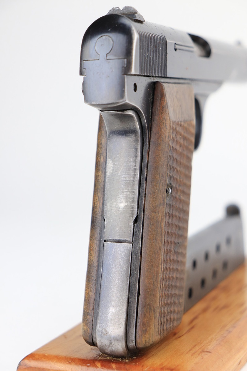 2/22/22 – This is a very nice example of an FN Browning Model 1922 issued to the Nazi military during WW2. It is all matching and has the proper “Waffen 140” Nazi military acceptance proofs. It has retained somewhere between 85-90% of its original finish. There is spotty wear on both grip straps, minor muzzle wear, and minor wear concentrated around the high edges of the slide. There are some areas of minor freckling here and there along the slide, mainly along the top. Comes with nice wood grips and a proper magazine (no waffen proofs). The bore is excellent with strong rifling and very minor pin-pricking in some of the grooves.