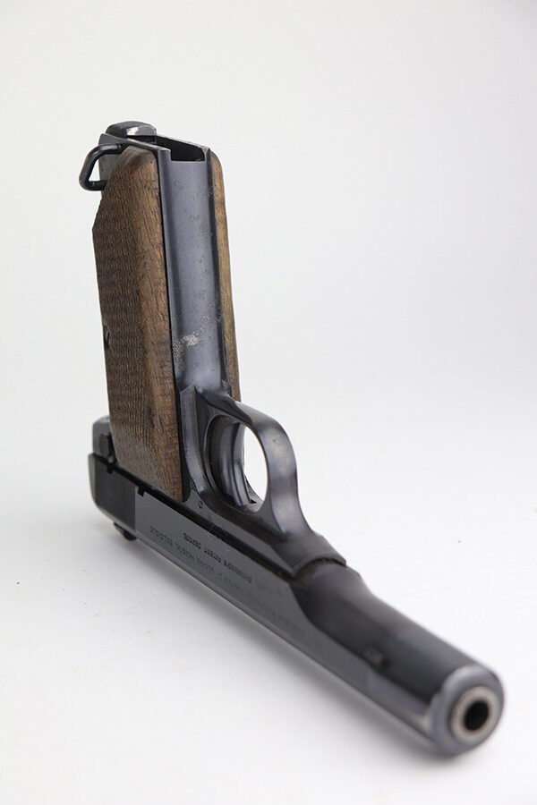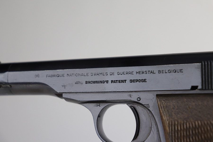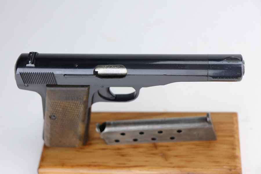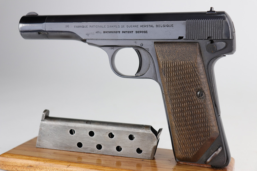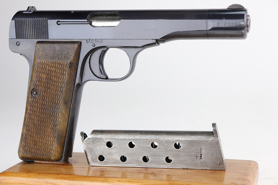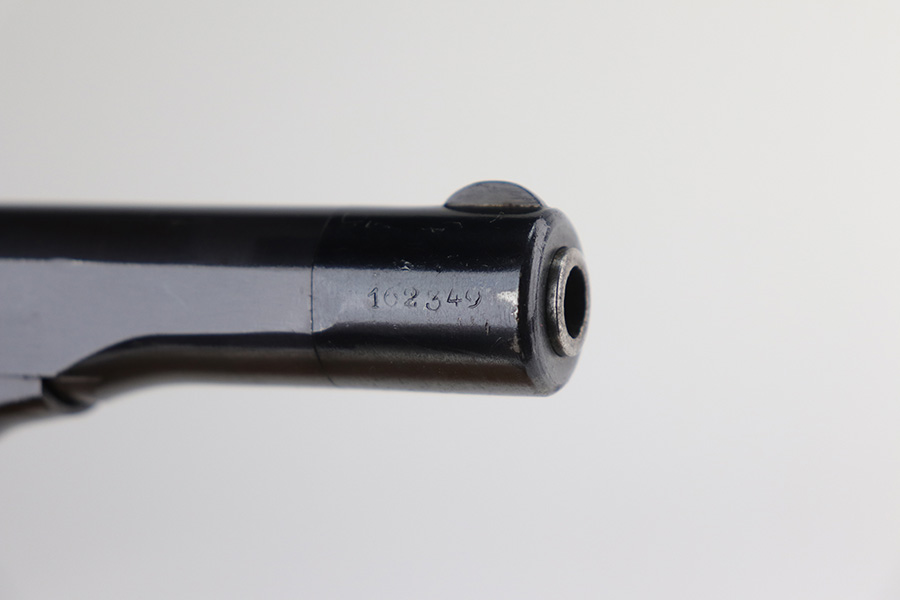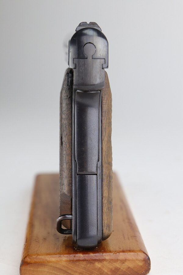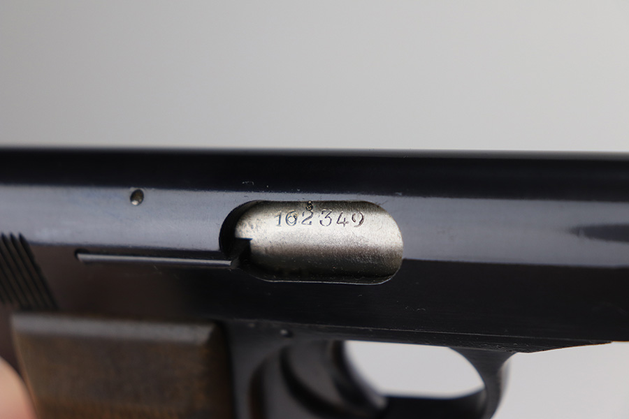 11/22/23 – This is an excellent example of an FN Browning Model 1922 issued to the Nazi military during WW2. It is all matching and has the proper “Waffen 140” military proofs. It has a couple of post-war French modifications – the left grip has been cut and a lanyard ring was added to the left side of the frame. Comes with very nice wood grips and a proper magazine. It has retained about 96% of its finish. There are just hints of wear on the high edges, minor wear around the muzzle, and some spotty wear and minor pitting on the front strap. Very minor freckling on the back strap. Mint bore.