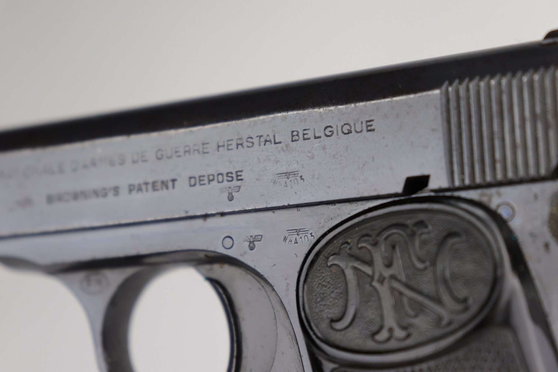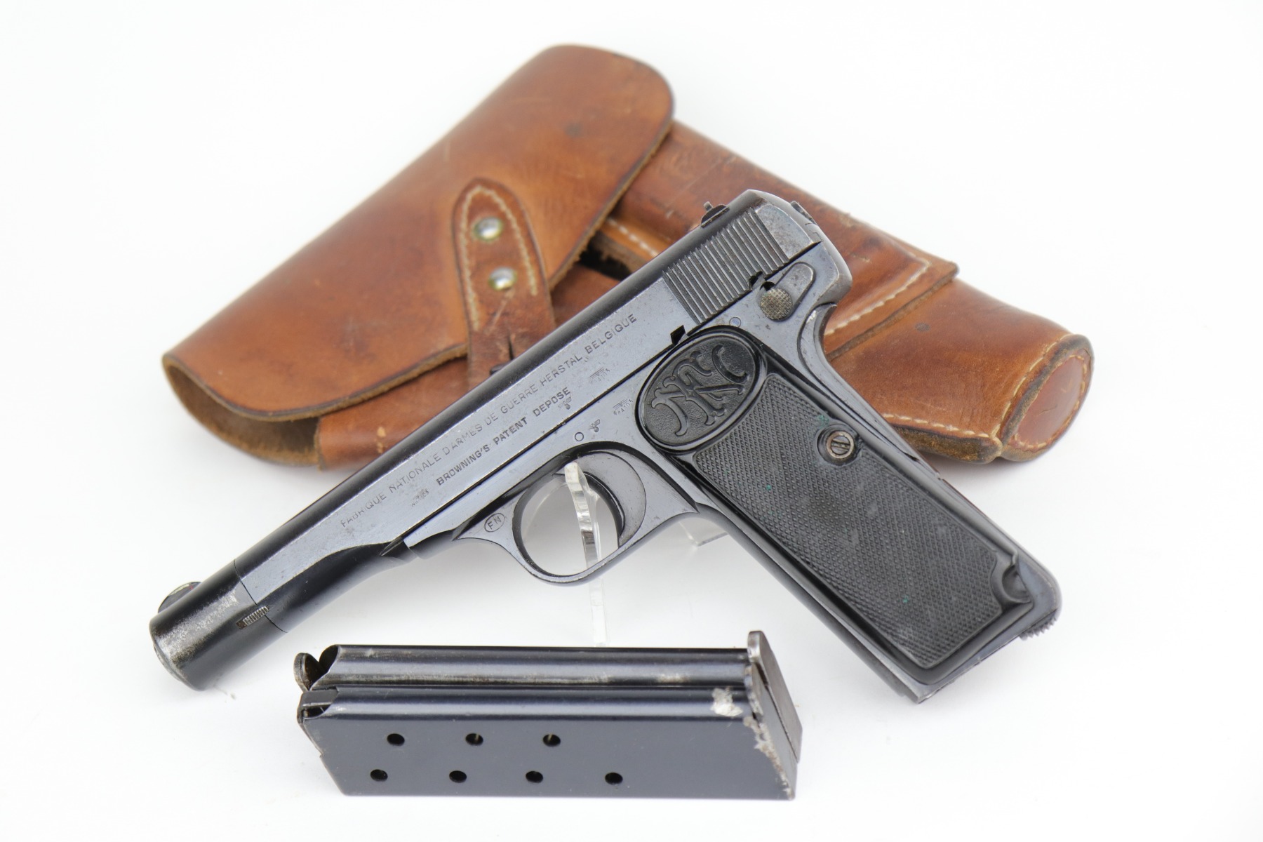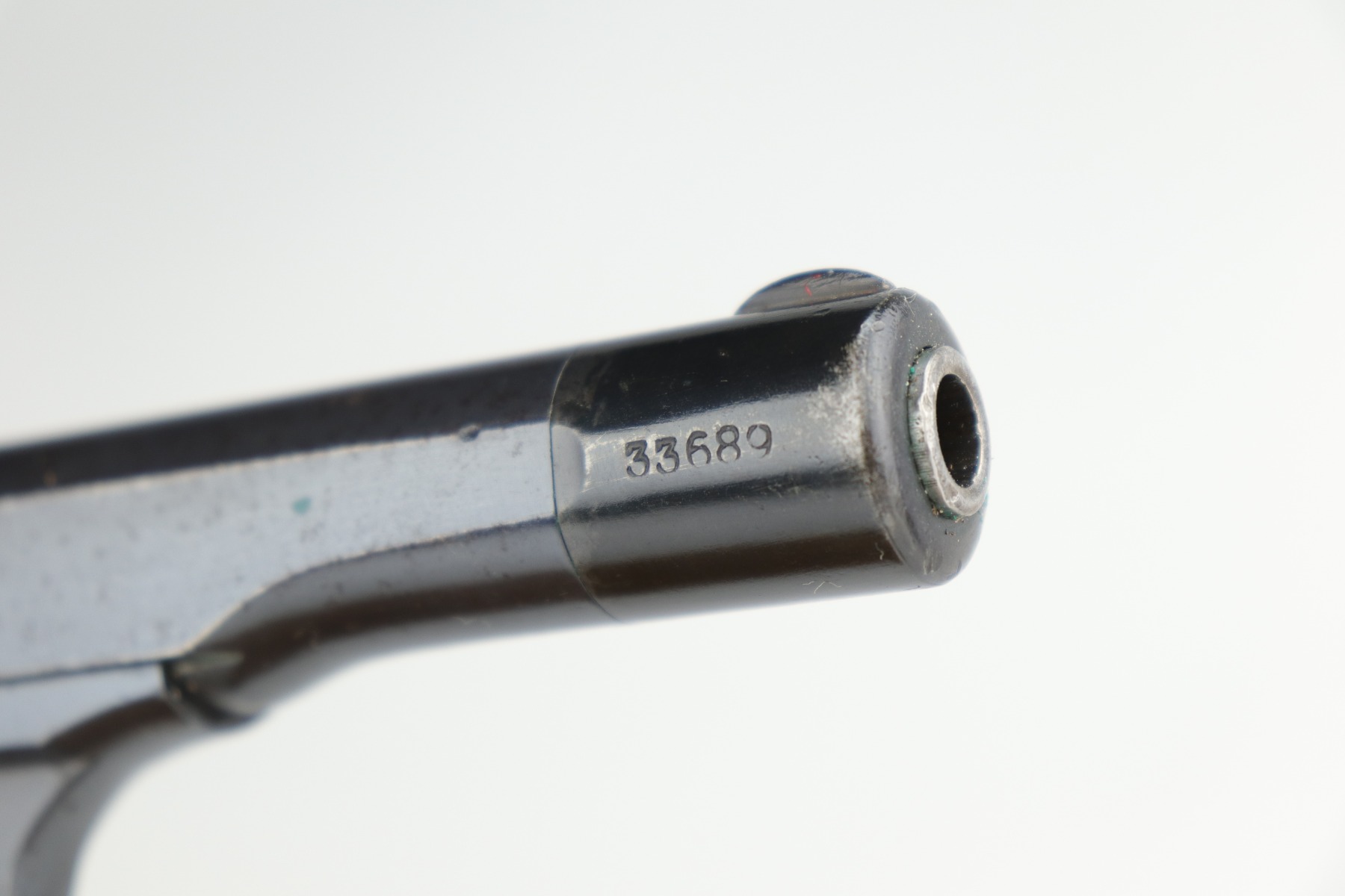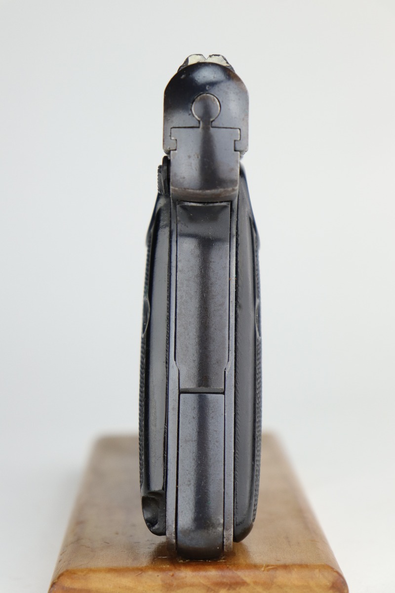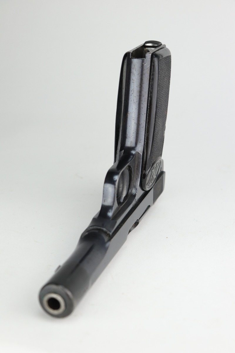 11/20/20 – This is a very nice example of an FN Browning M1922 rig issued to the Nazi military during WW2. This gun has the more-scarce “Waffen 103” Nazi military proofs on it. The gun is all matching and comes with two magazines and a brown leather holster. It has retained about 96-97% of its bluing. There is wear and minor pitting around the muzzle. Very minor high edge wear on the slide. There are areas of minor pitting and spotty oxidation throughout. The pitting is most noticeable on the straps and the oxidation is most noticeable on the top of the slide. The bore is shiny and minty. It comes with one period-correct magazine and one post-war magazine. The holster is a postwar Hungarian production. Excellent, period-correct black bakelite grips.