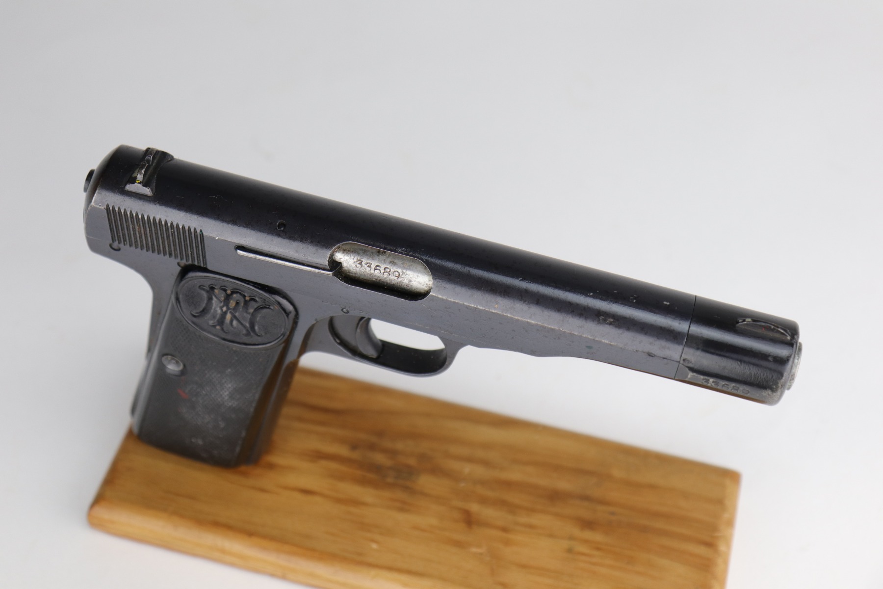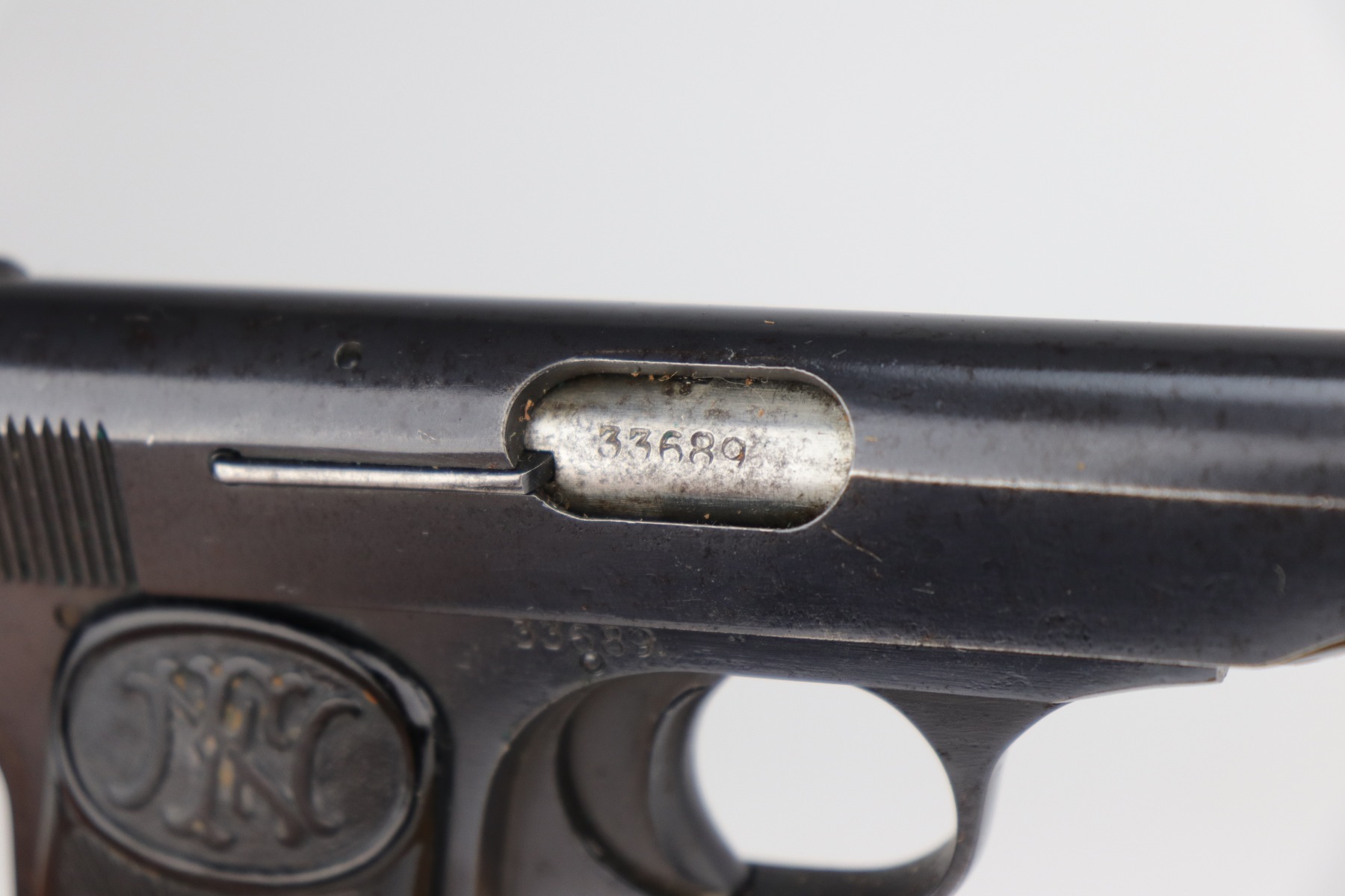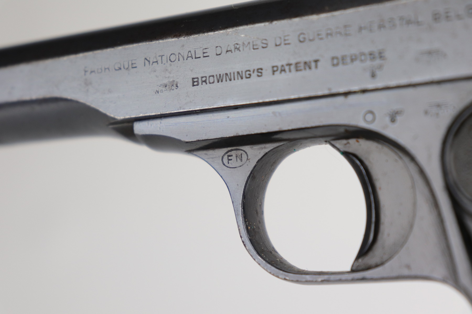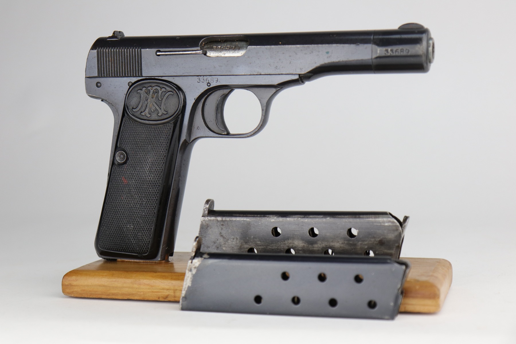 11/20/20 – This is a very nice example of an FN Browning M1922 rig issued to the Nazi military during WW2. This gun has the more-scarce “Waffen 103” Nazi military proofs on it. The gun is all matching and comes with two magazines and a brown leather holster. It has retained about 96-97% of its bluing. There is wear and minor pitting around the muzzle. Very minor high edge wear on the slide. There are areas of minor pitting and spotty oxidation throughout. The pitting is most noticeable on the straps and the oxidation is most noticeable on the top of the slide. The bore is shiny and minty. It comes with one period-correct magazine and one post-war magazine. The holster is a postwar Hungarian production. Excellent, period-correct black bakelite grips.