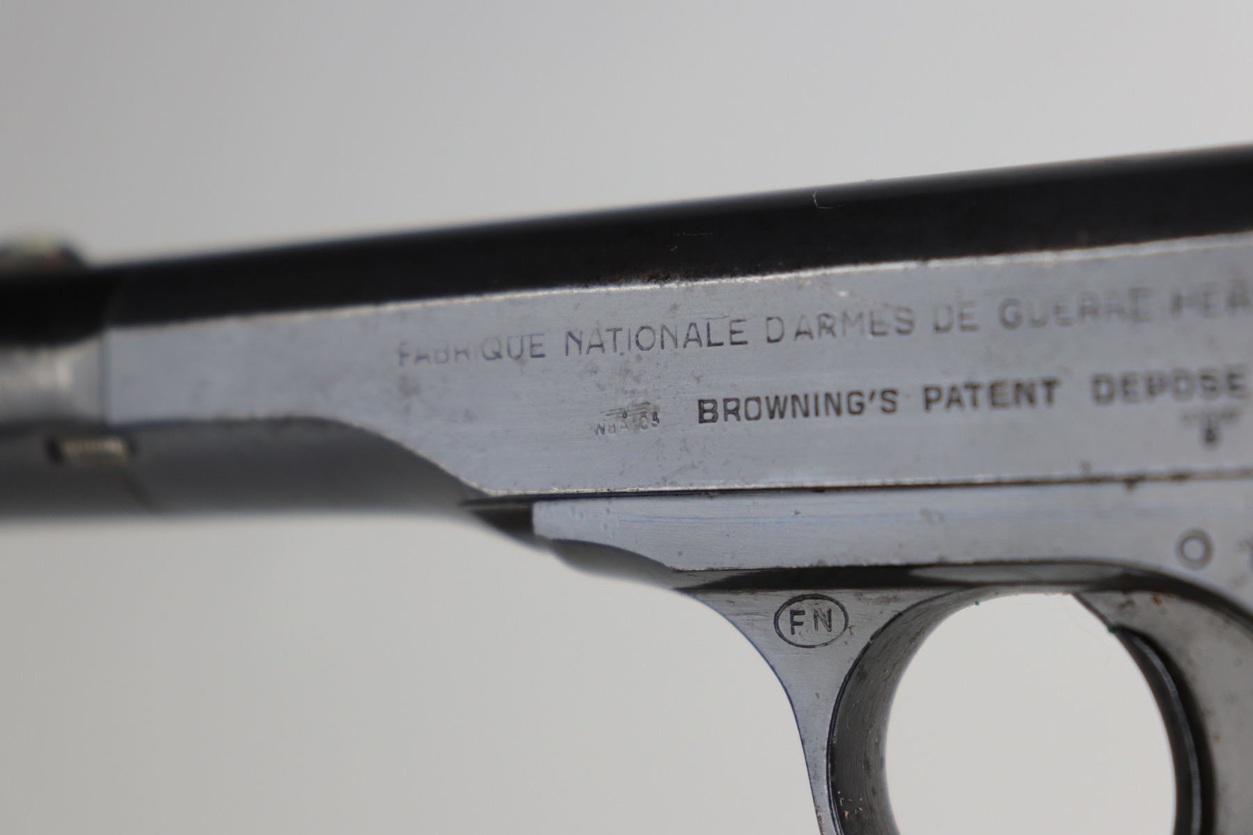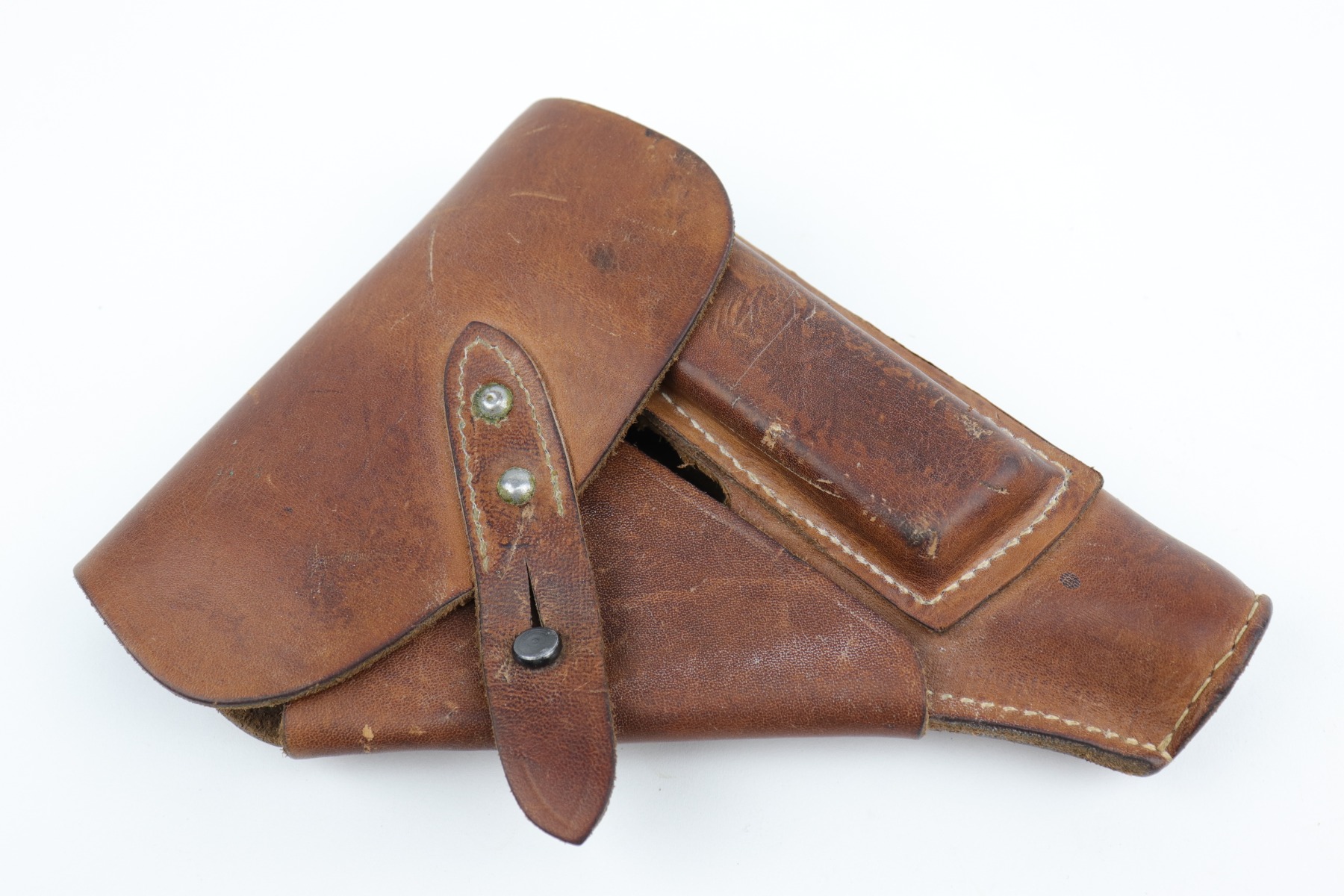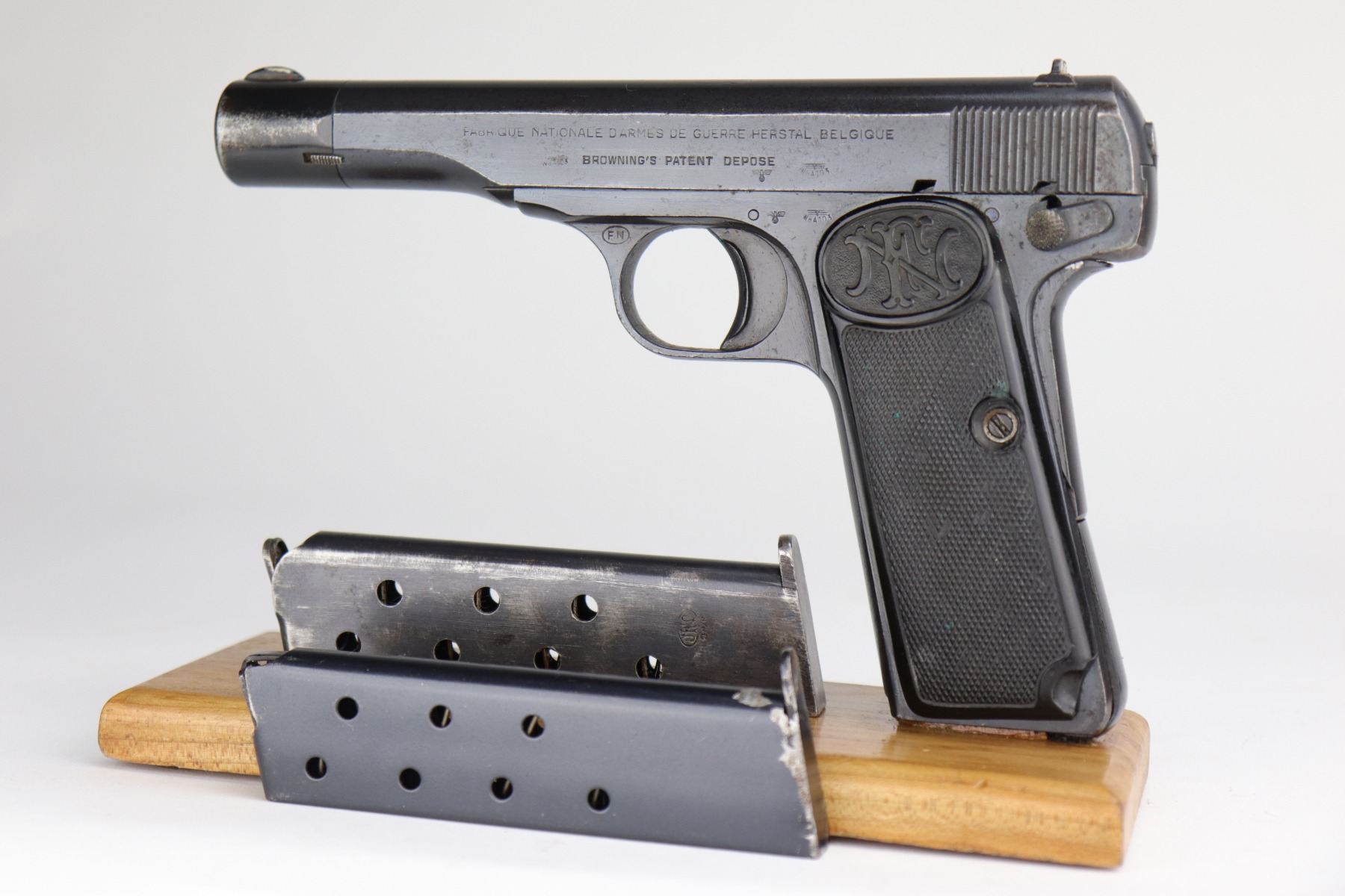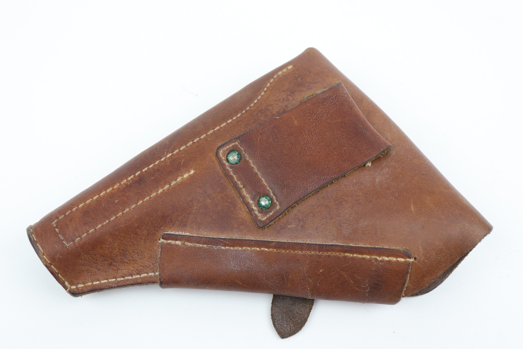 11/20/20 – This is a very nice example of an FN Browning M1922 rig issued to the Nazi military during WW2. This gun has the more-scarce “Waffen 103” Nazi military proofs on it. The gun is all matching and comes with two magazines and a brown leather holster. It has retained about 96-97% of its bluing. There is wear and minor pitting around the muzzle. Very minor high edge wear on the slide. There are areas of minor pitting and spotty oxidation throughout. The pitting is most noticeable on the straps and the oxidation is most noticeable on the top of the slide. The bore is shiny and minty. It comes with one period-correct magazine and one post-war magazine. The holster is a postwar Hungarian production. Excellent, period-correct black bakelite grips.